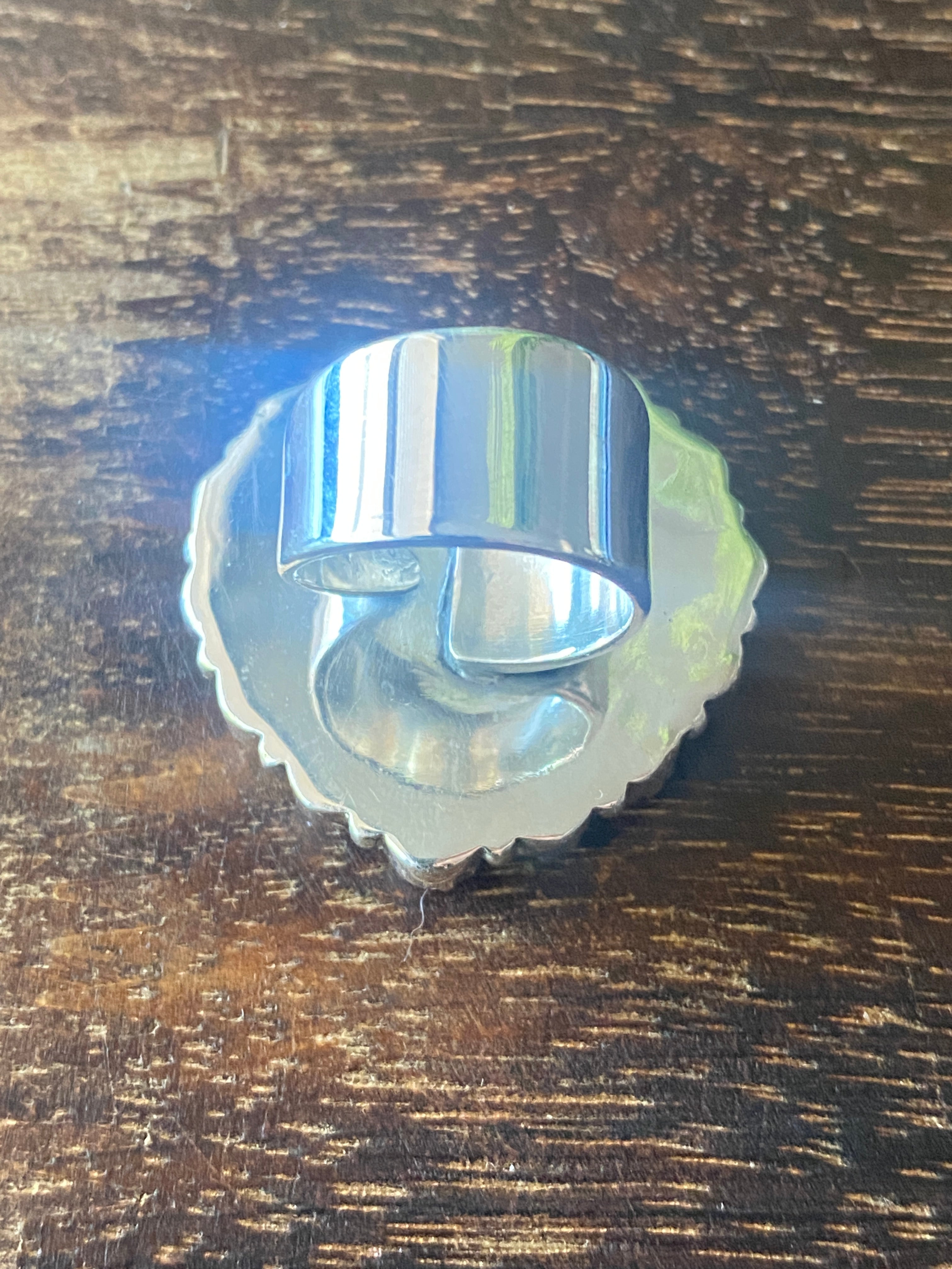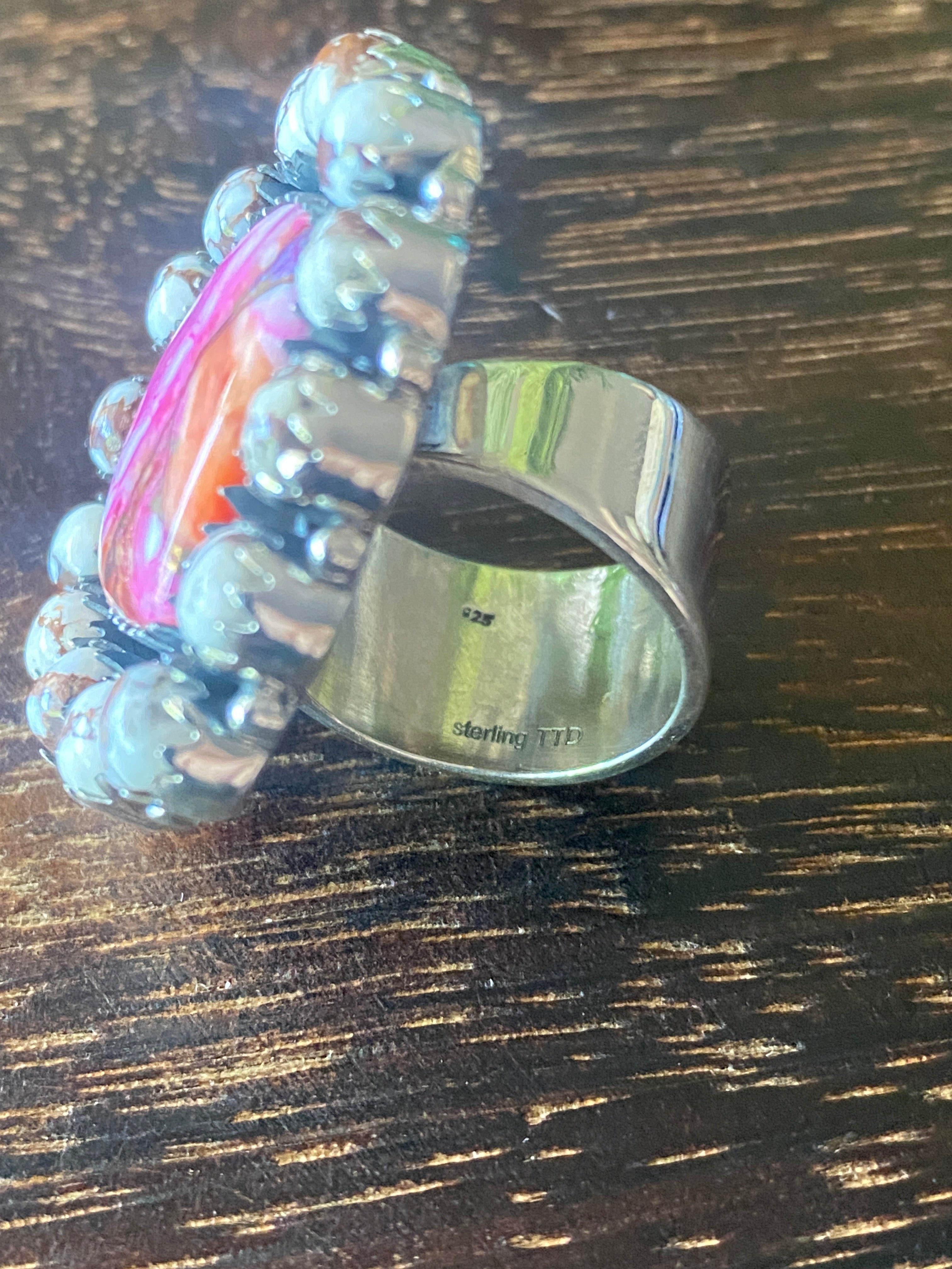 Southwest Handmade Multi Stone & Sterling Silver Adjustable Cluster Ring. It measures 1 3/8 inches long and 1 3/8 inches wide. Signed by the artist and stamped sterling silver.