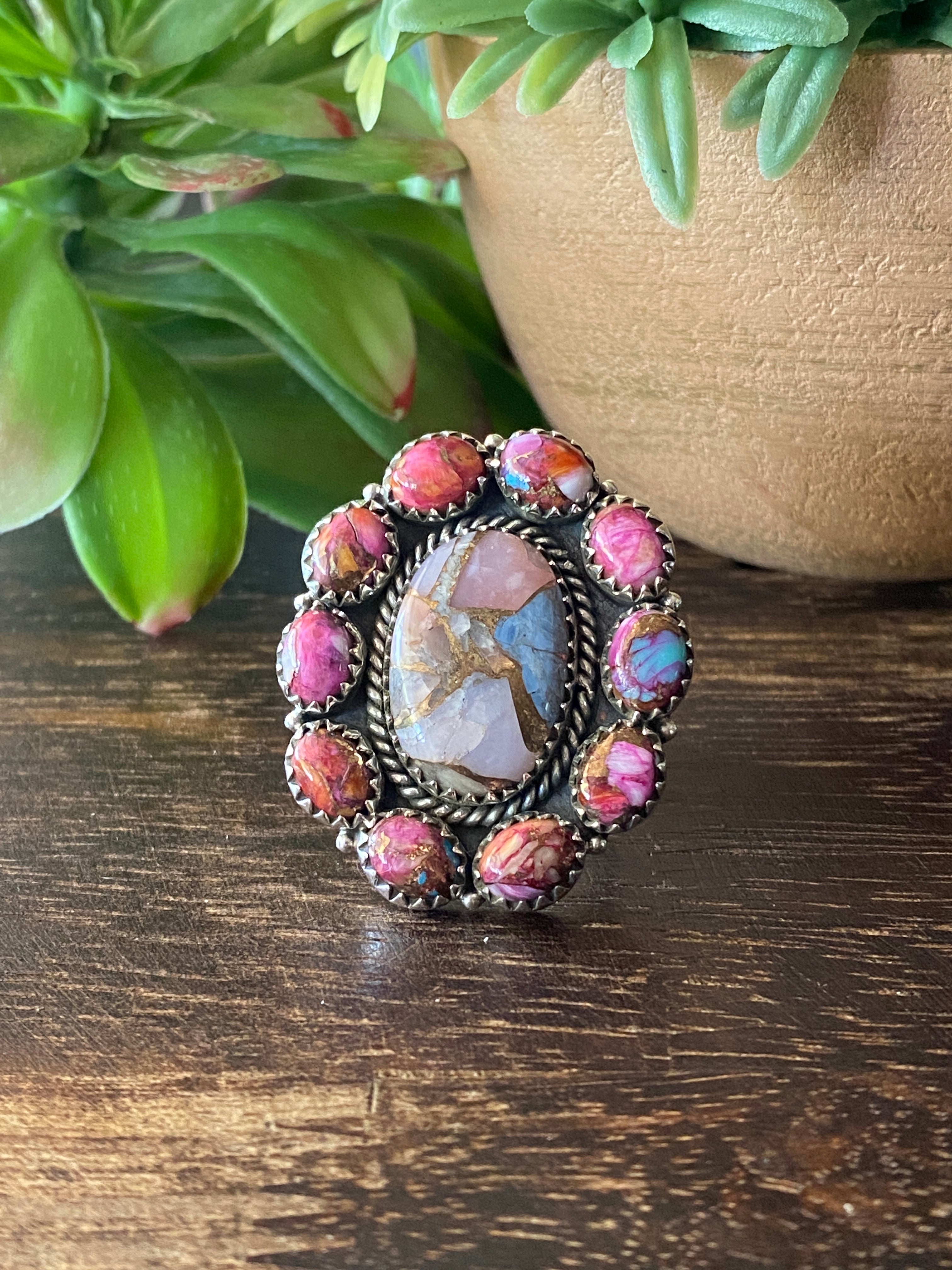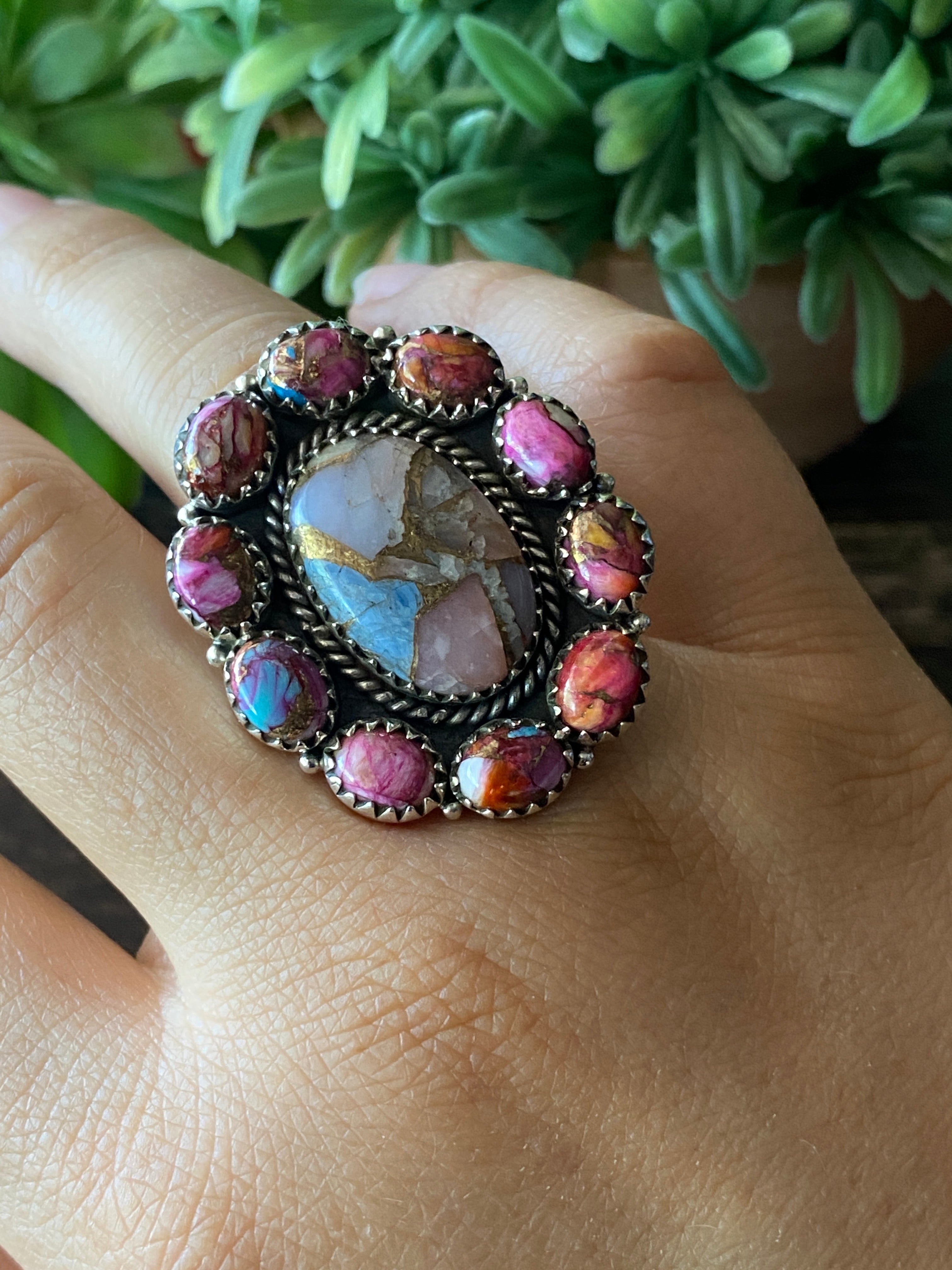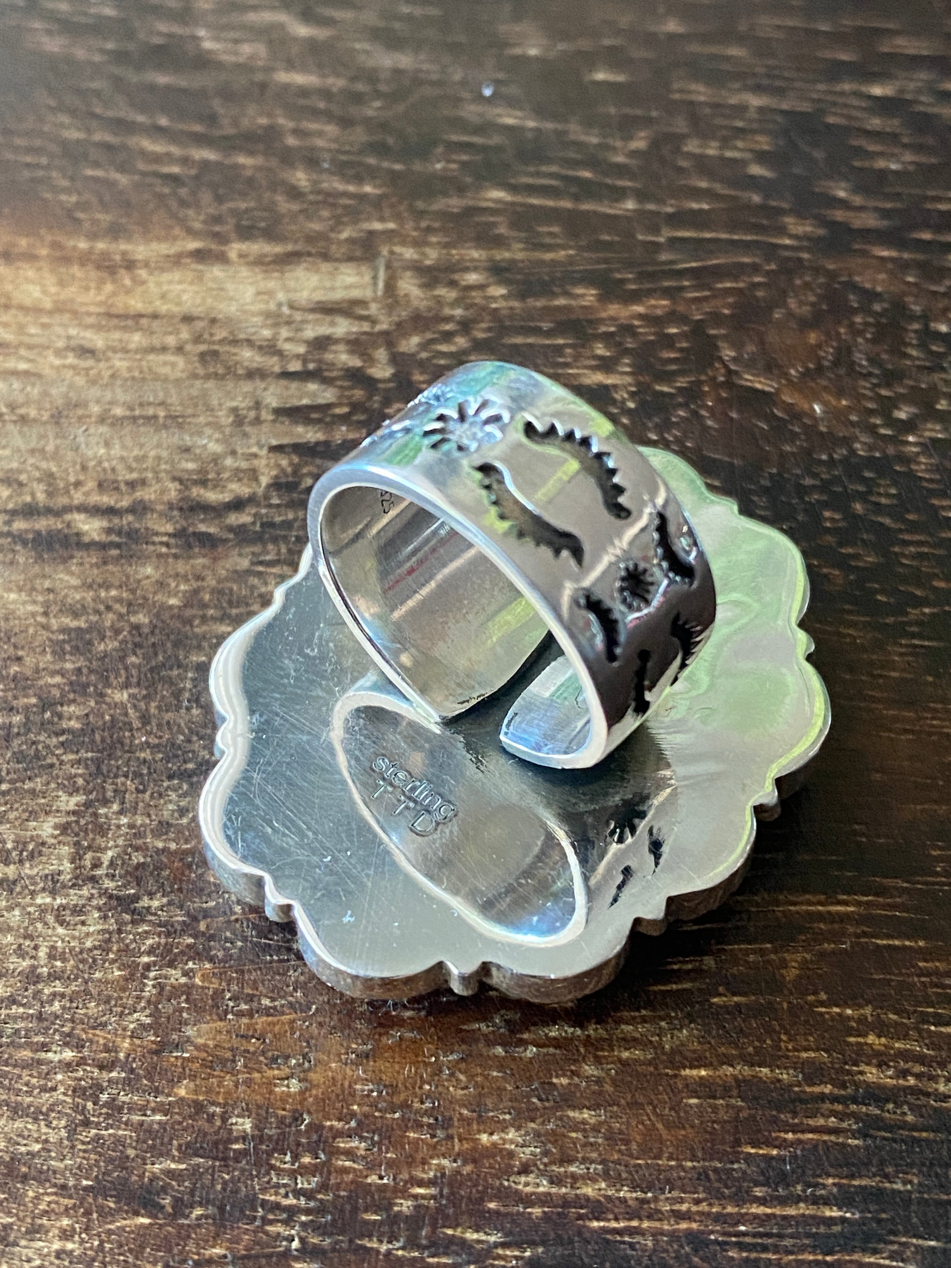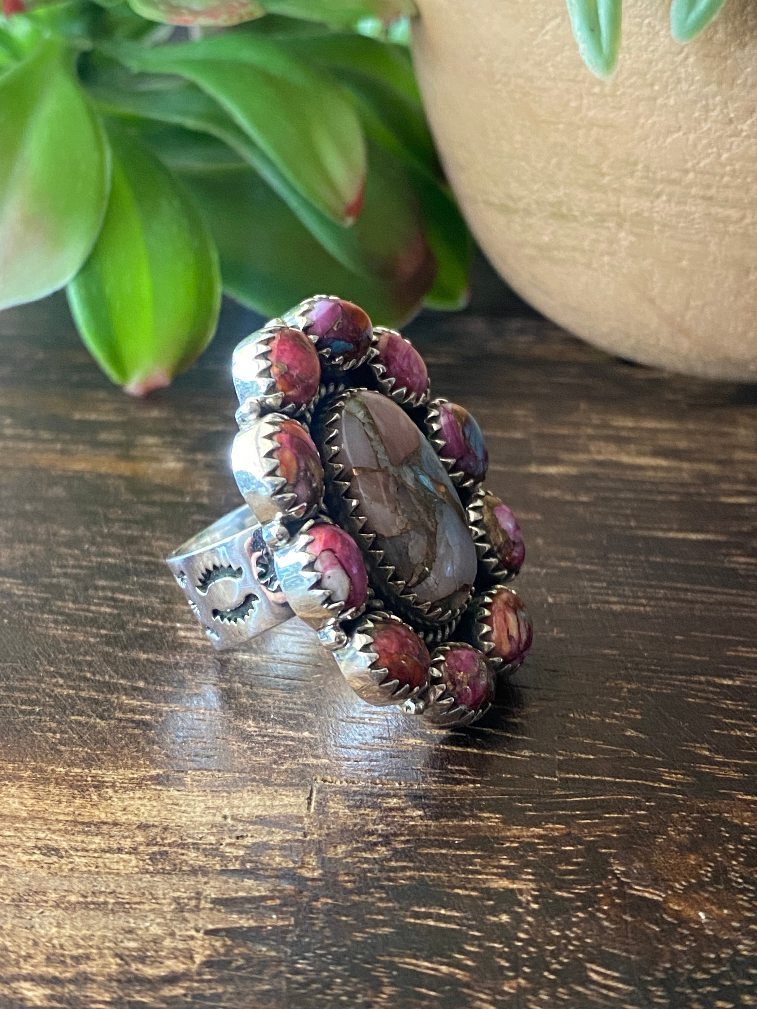 Southwest Handmade Multi Stone & Sterling Silver Adjustable Cluster Ring. It measures 1 1/2 inches long and 1 1/4 inches wide. Signed by the artist and stamped sterling silver.