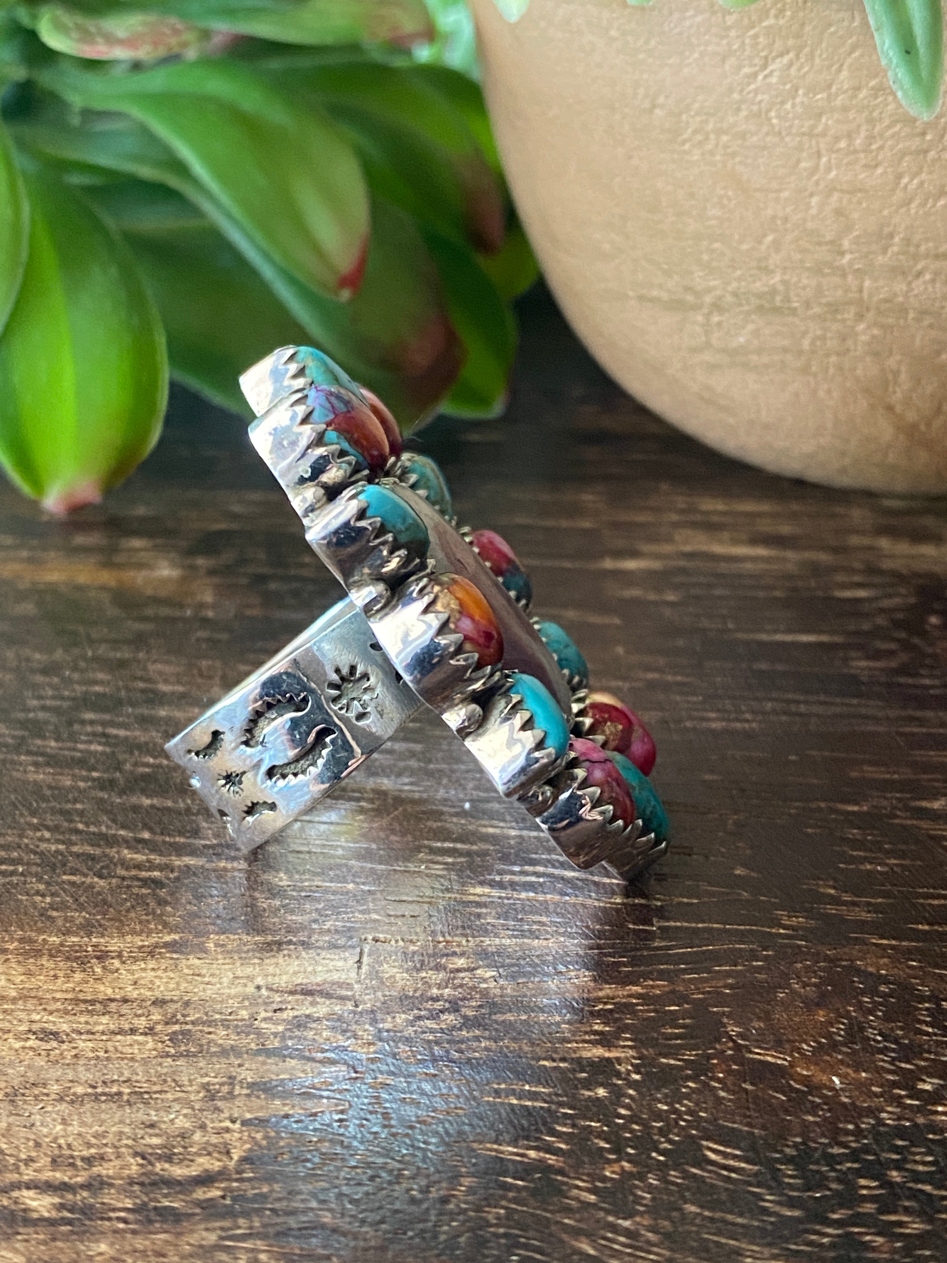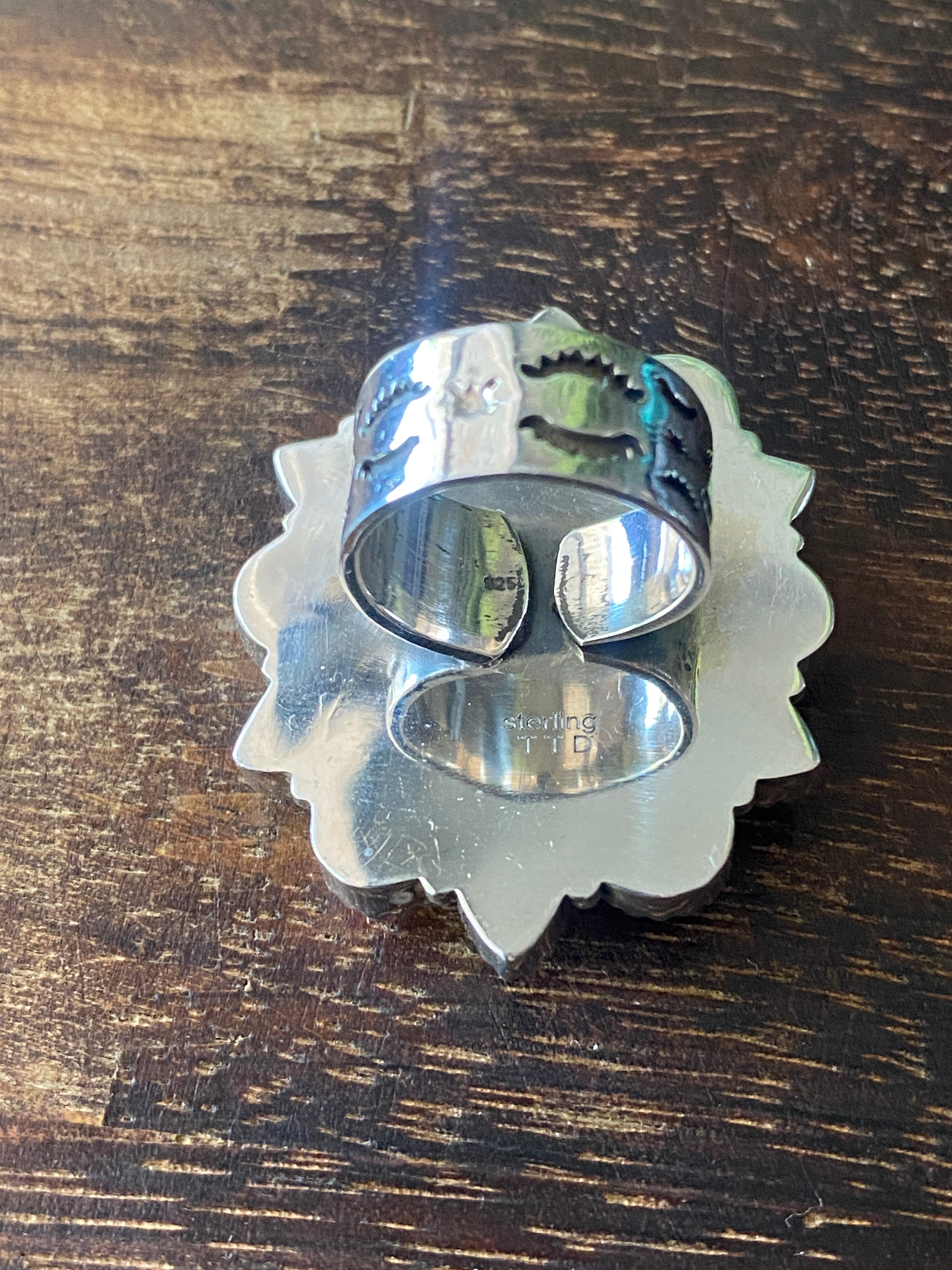 Southwest Handmade Multi Stone & Sterling Silver Adjustable Cluster Ring. It measures 1 3/4 inches long and 1 3/8 inches wide. Signed by the artist and stamped sterling silver.