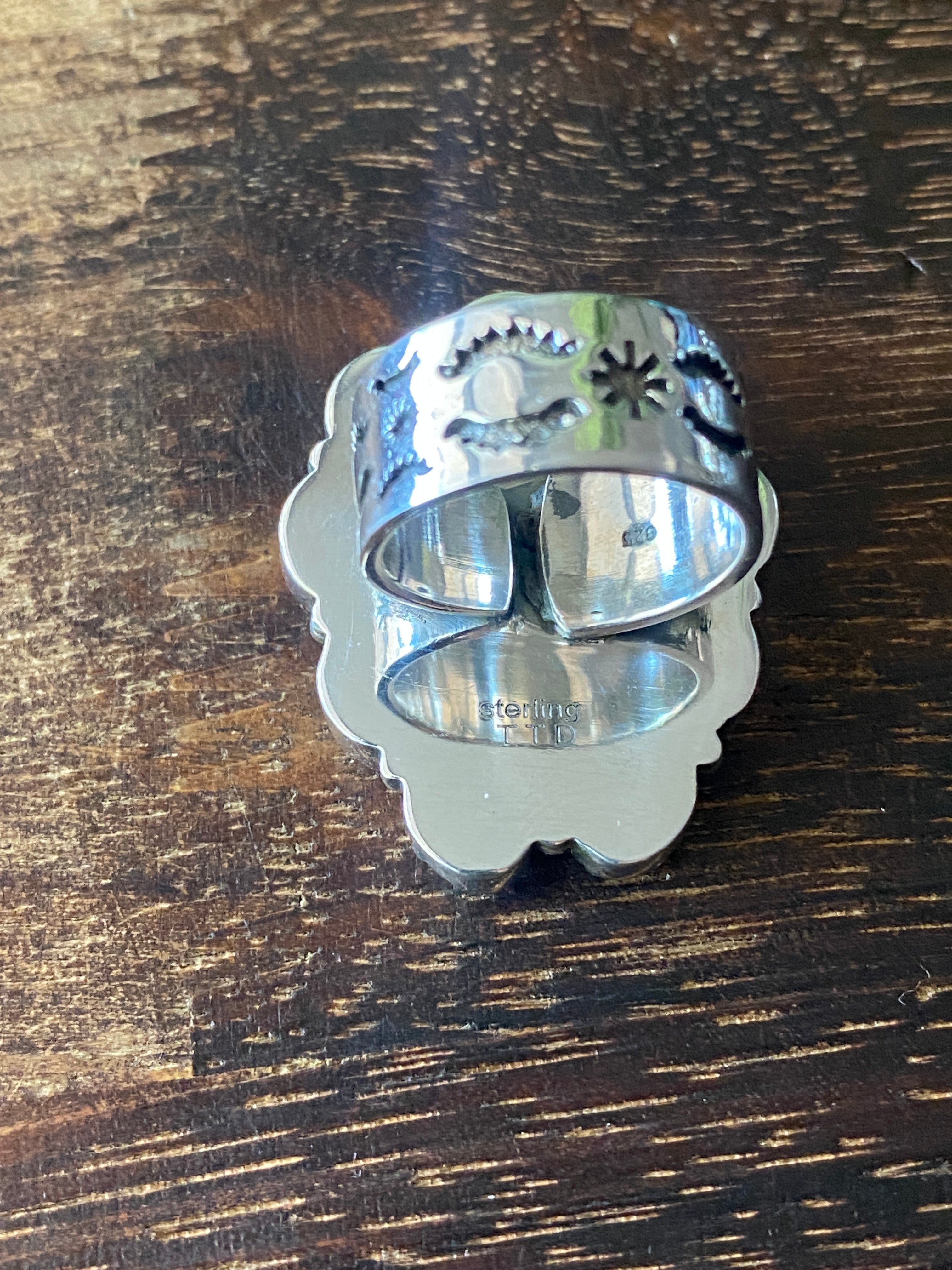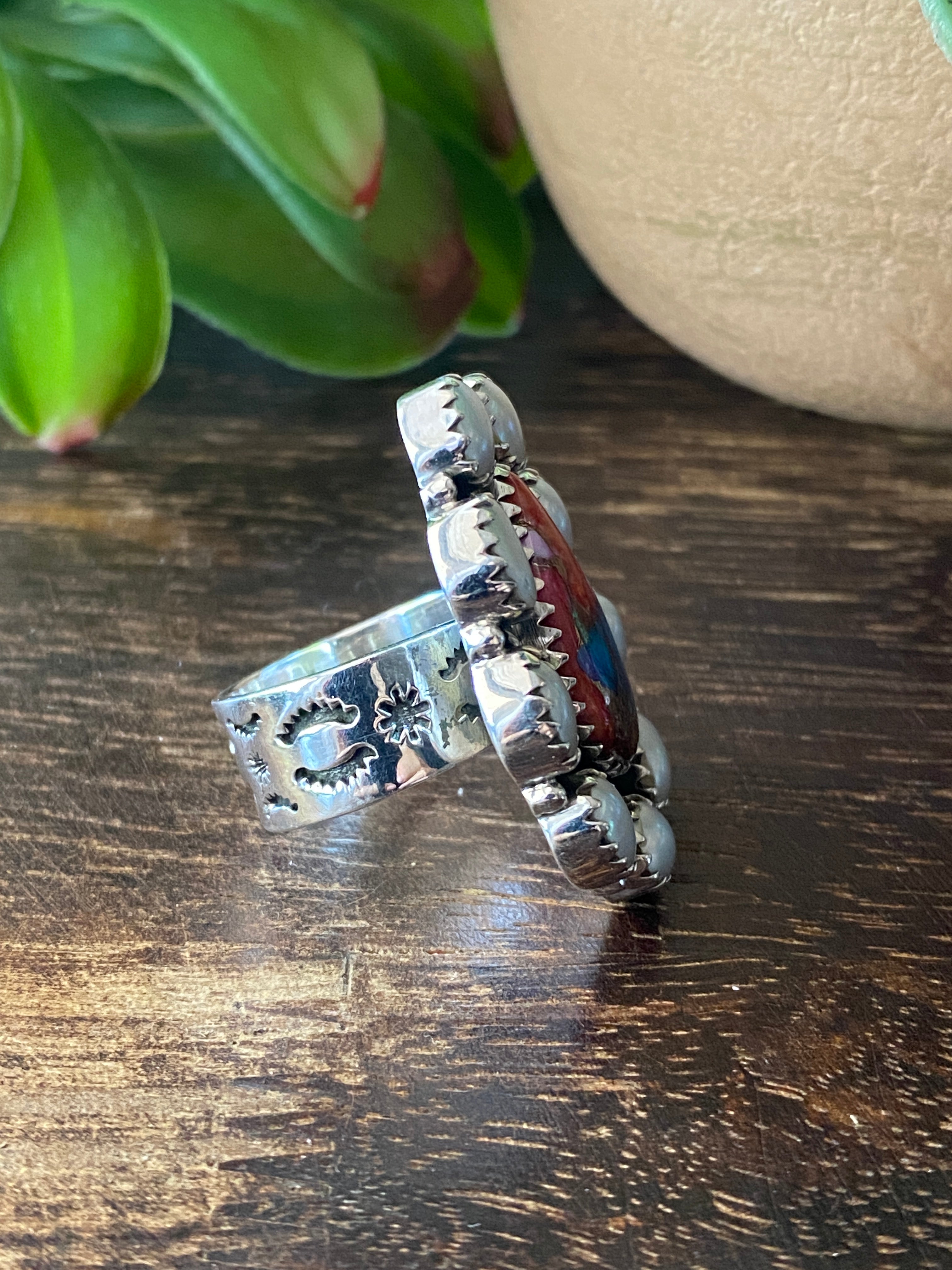 Southwest Handmade Multi Stone & Sterling Silver Adjustable Cluster Ring. It measures 1 3/8 inches long and 1 1/8 inches wide. Signed by the artist and stamped sterling silver.
