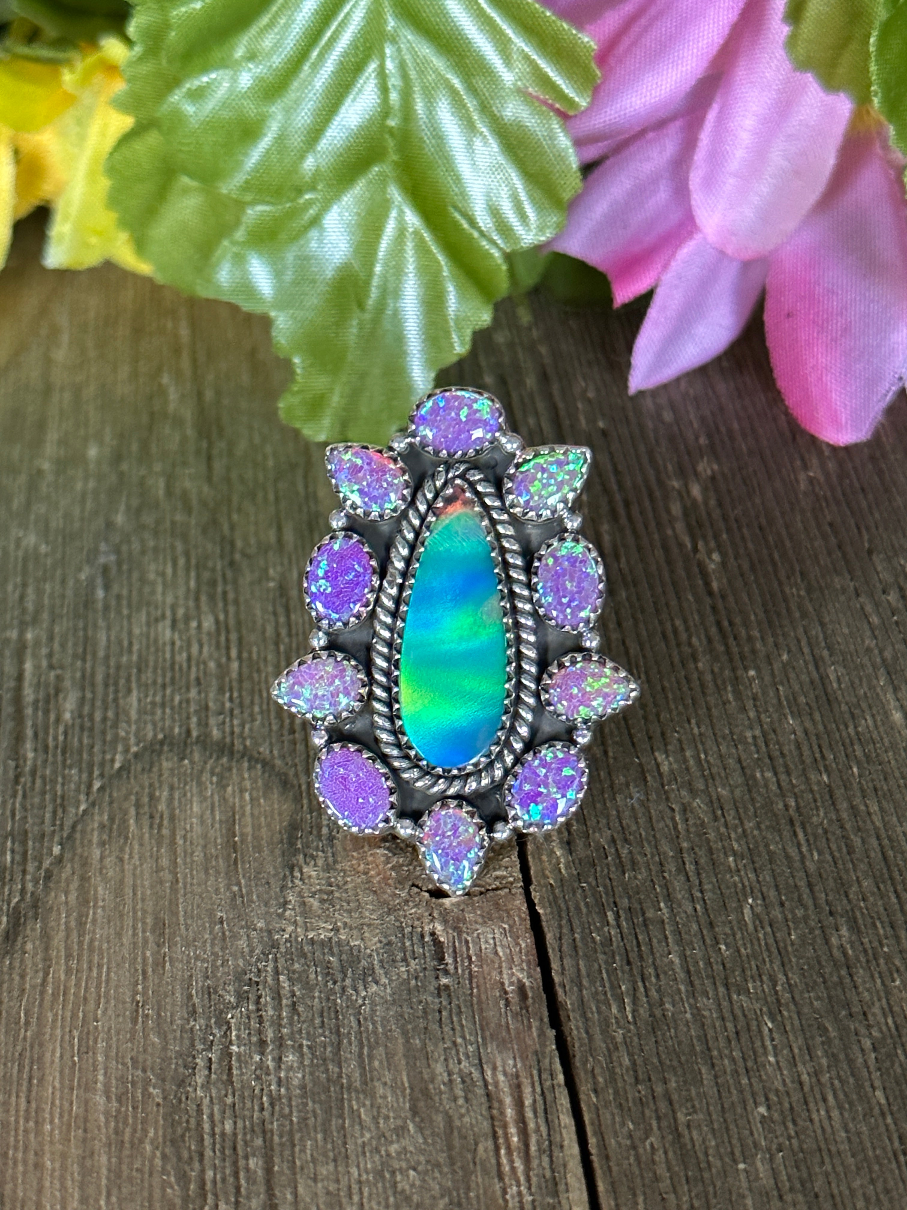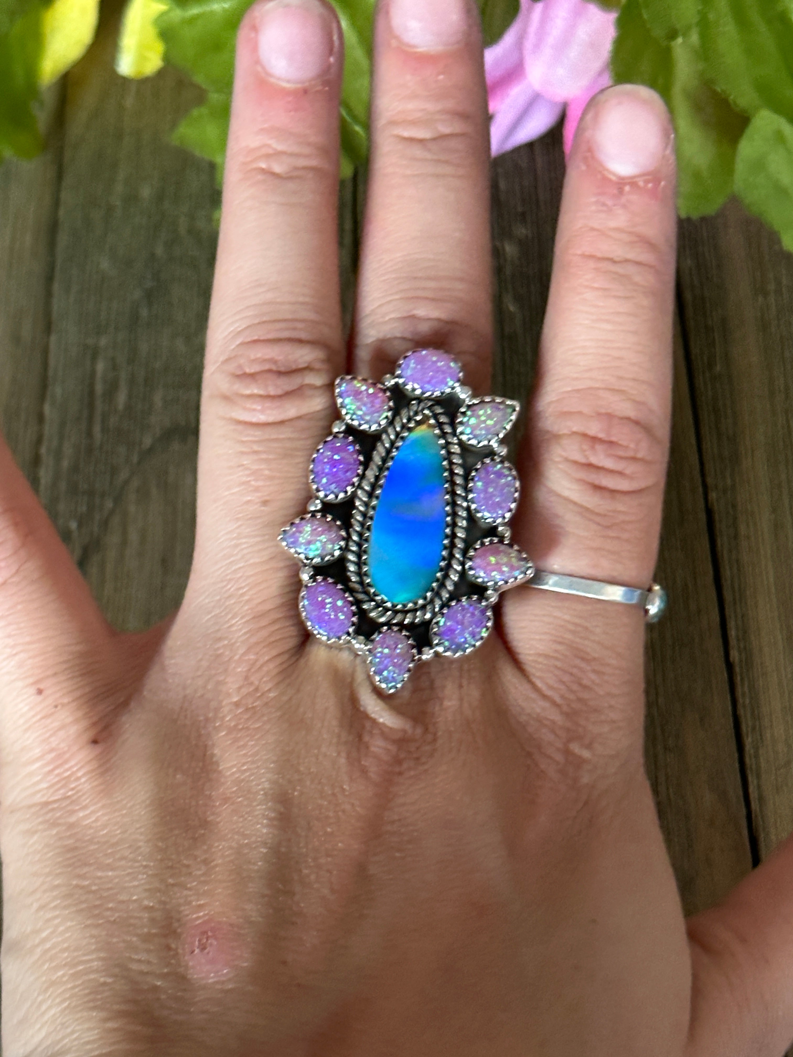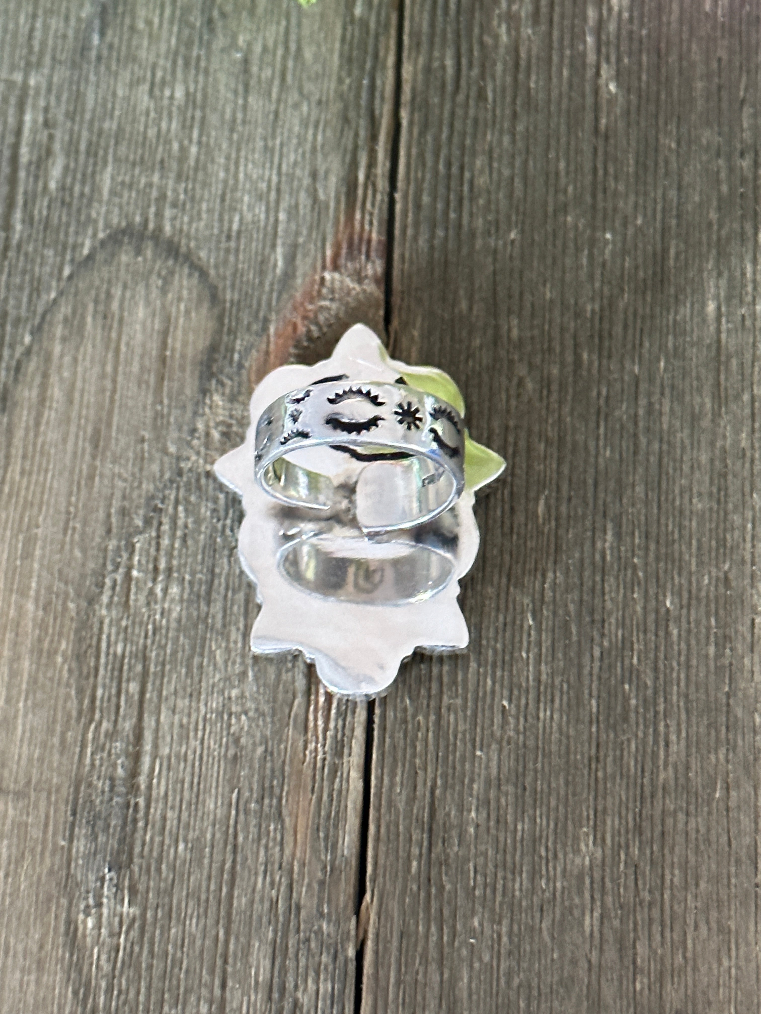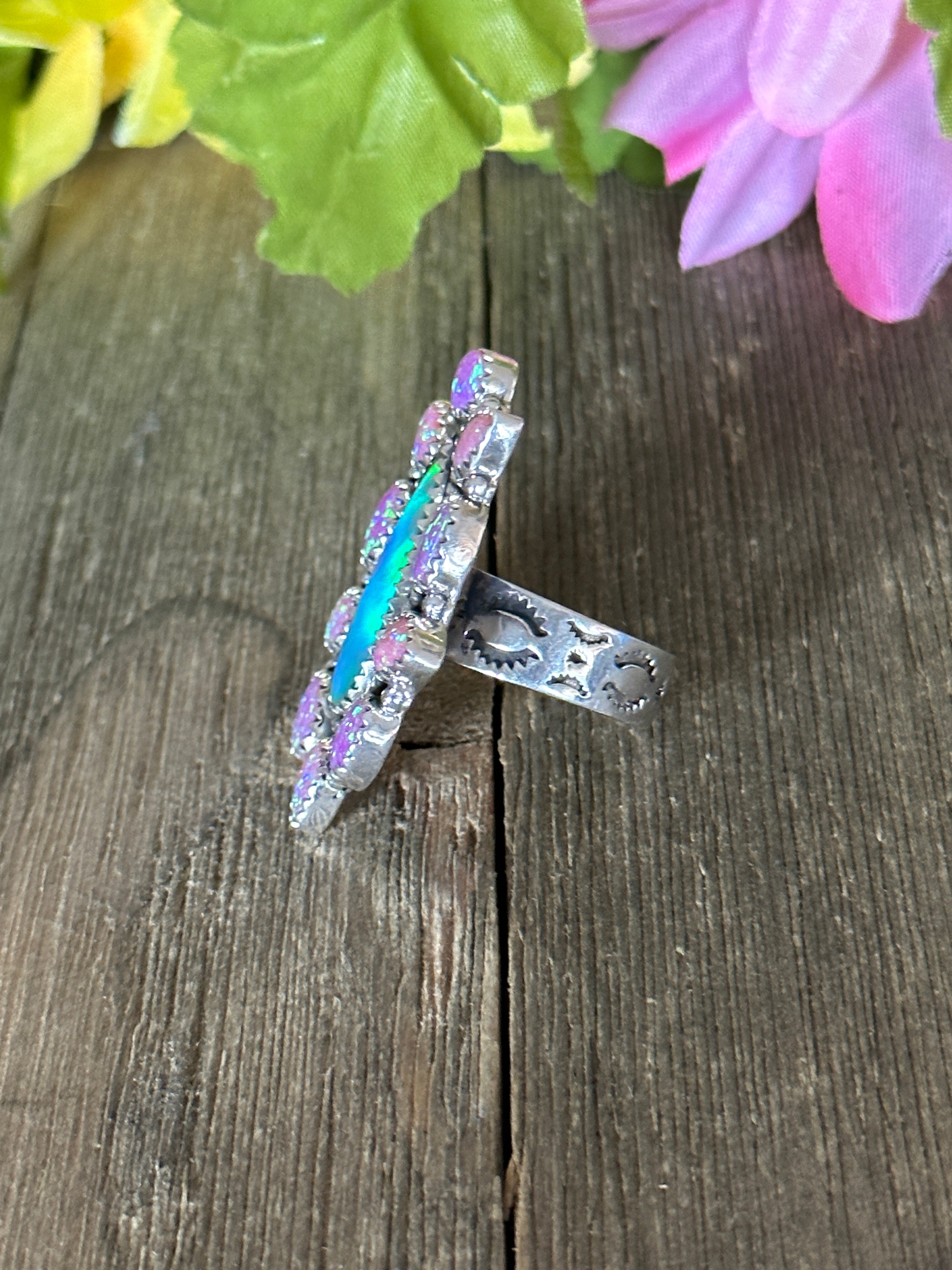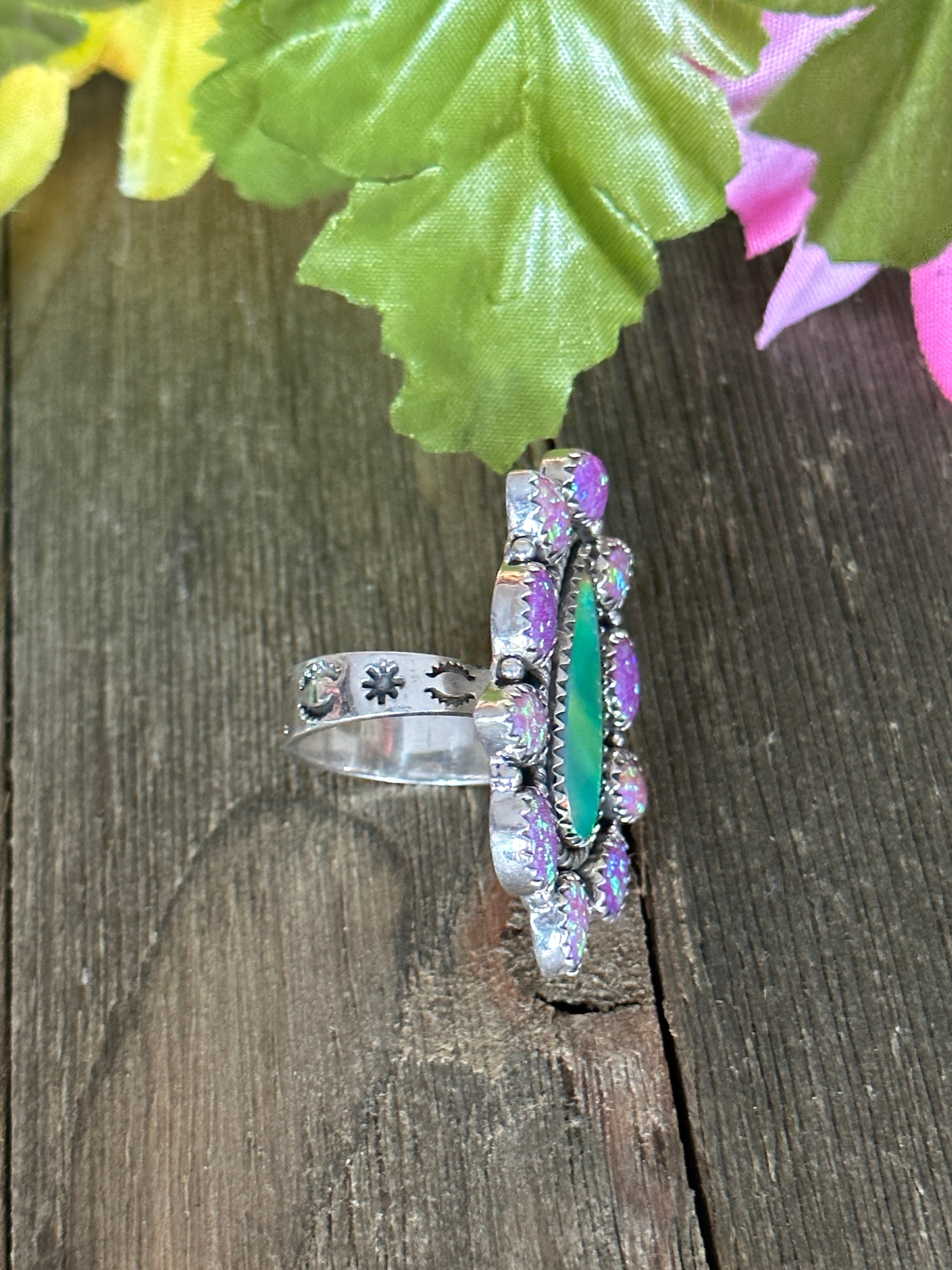 Southwest Handmade Multi Stone & Sterling Silver Adjustable Ring. It measures 1 3/4 inches long and 1 1/4 inches wide. Signed by artist and stamped sterling silver.