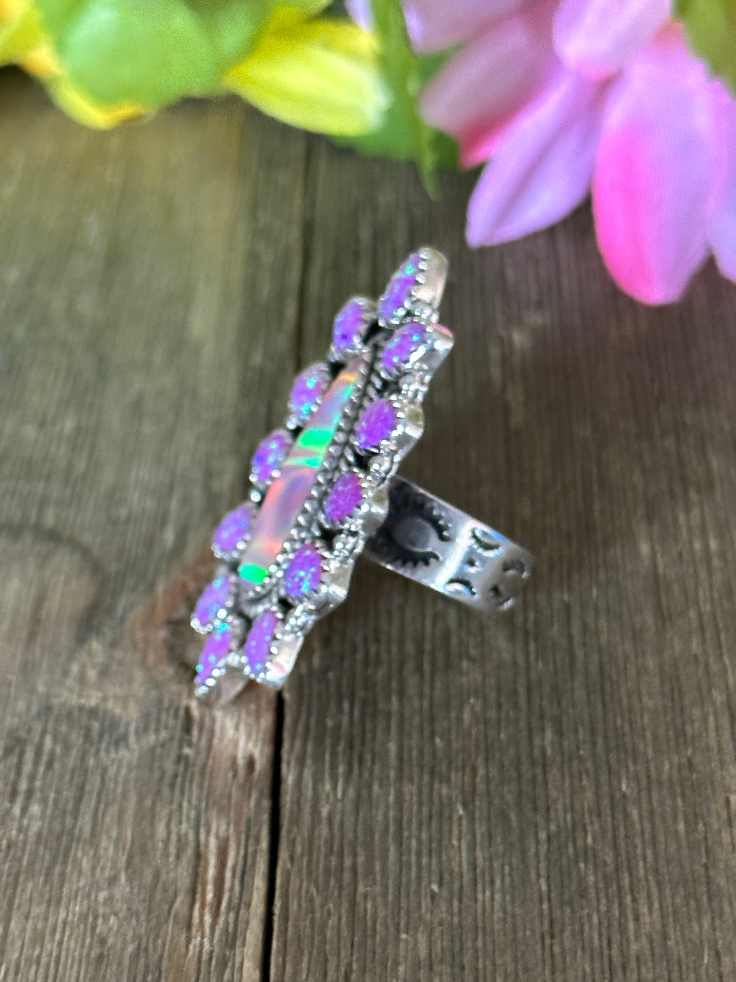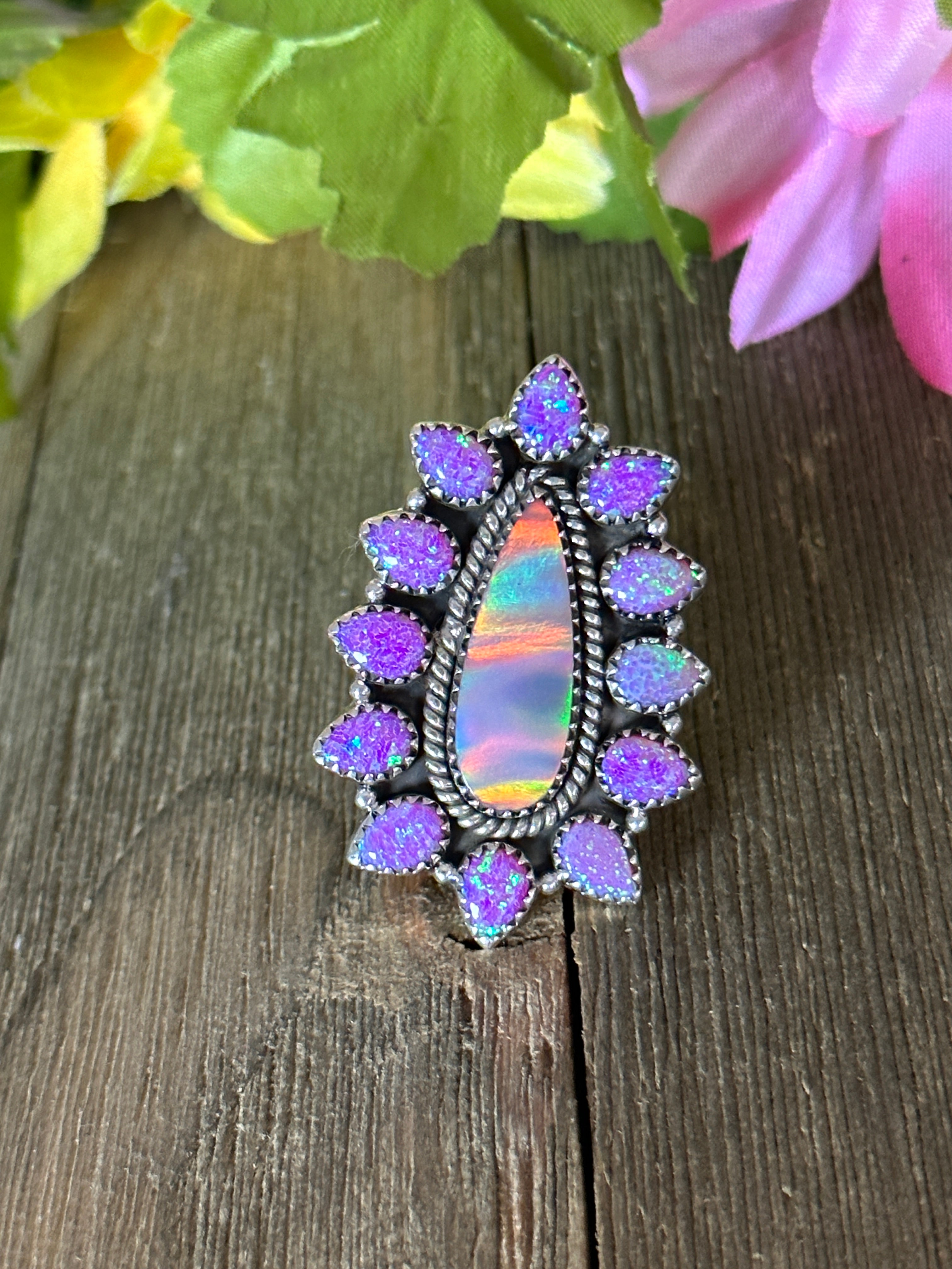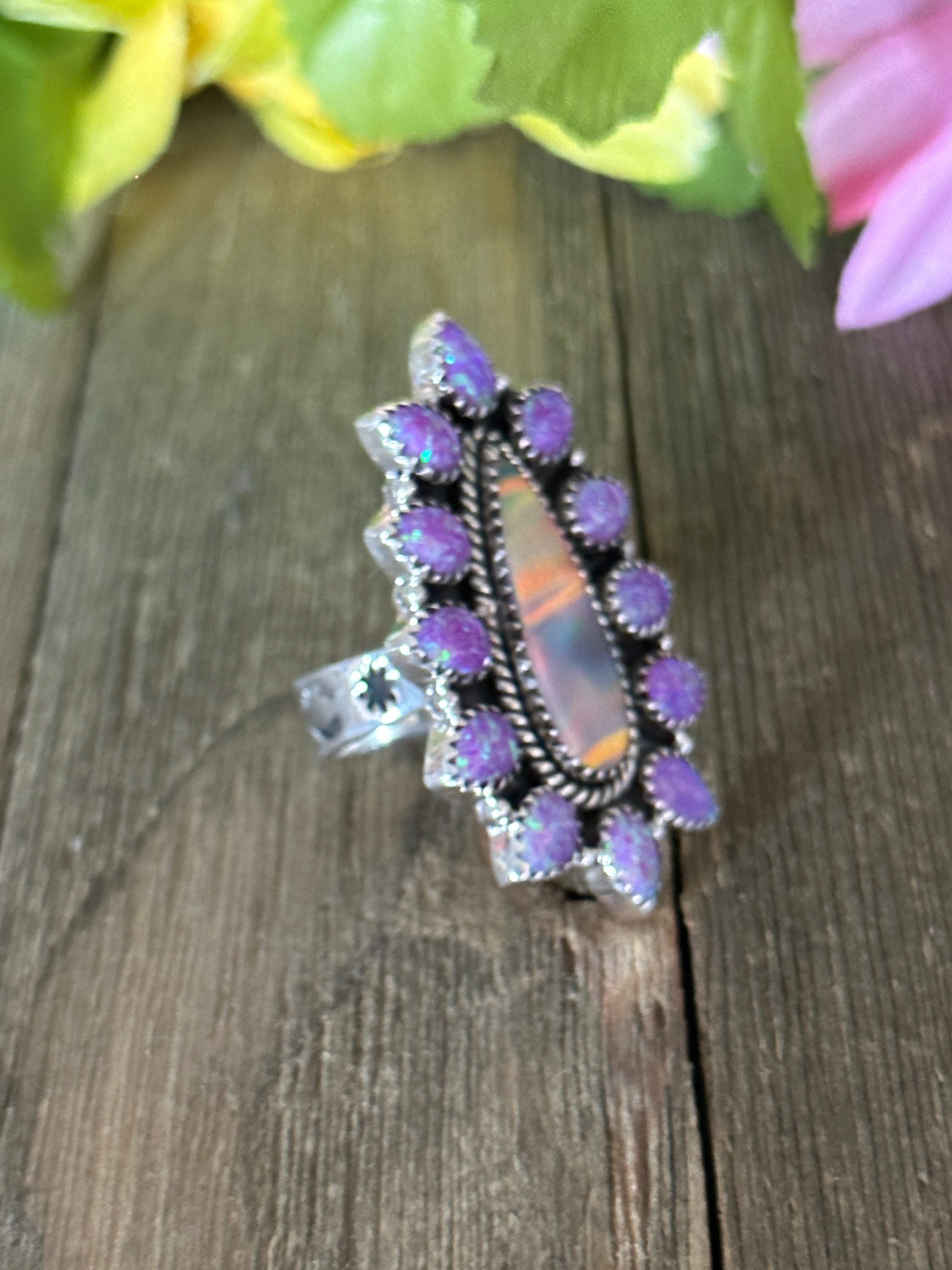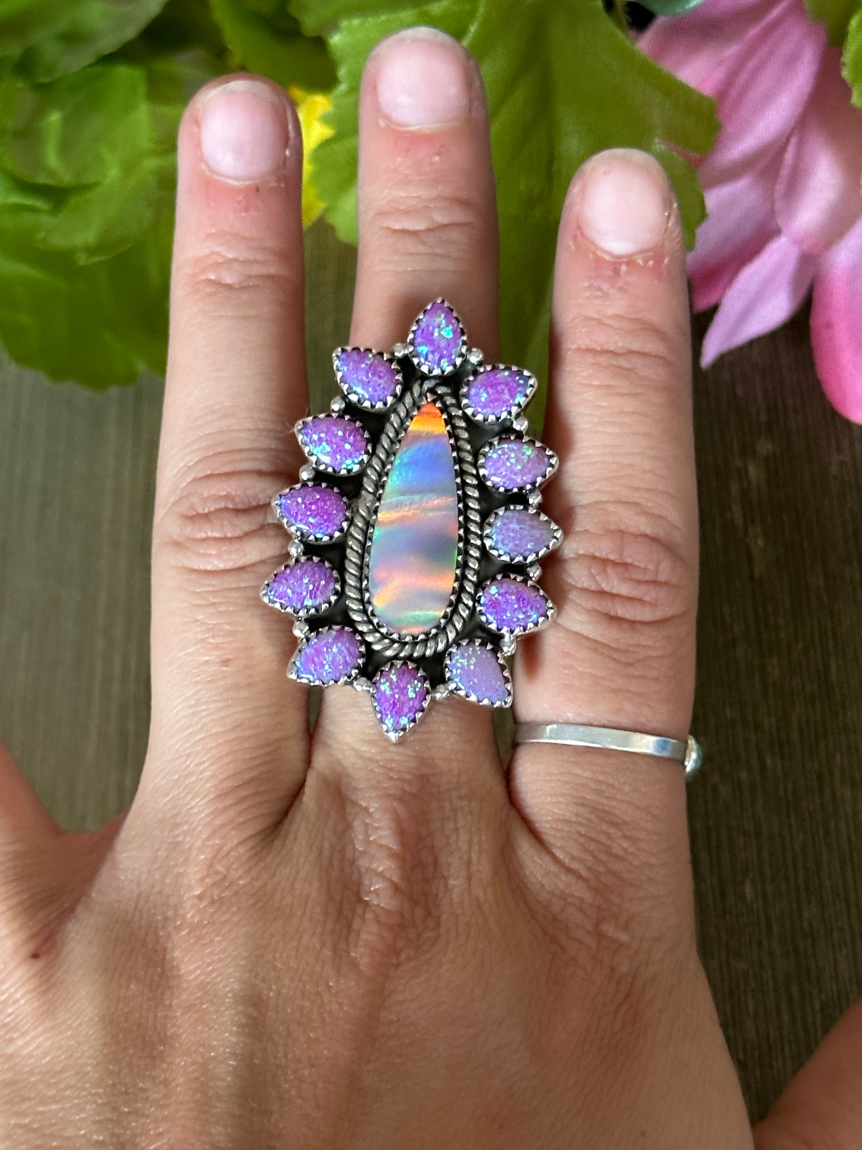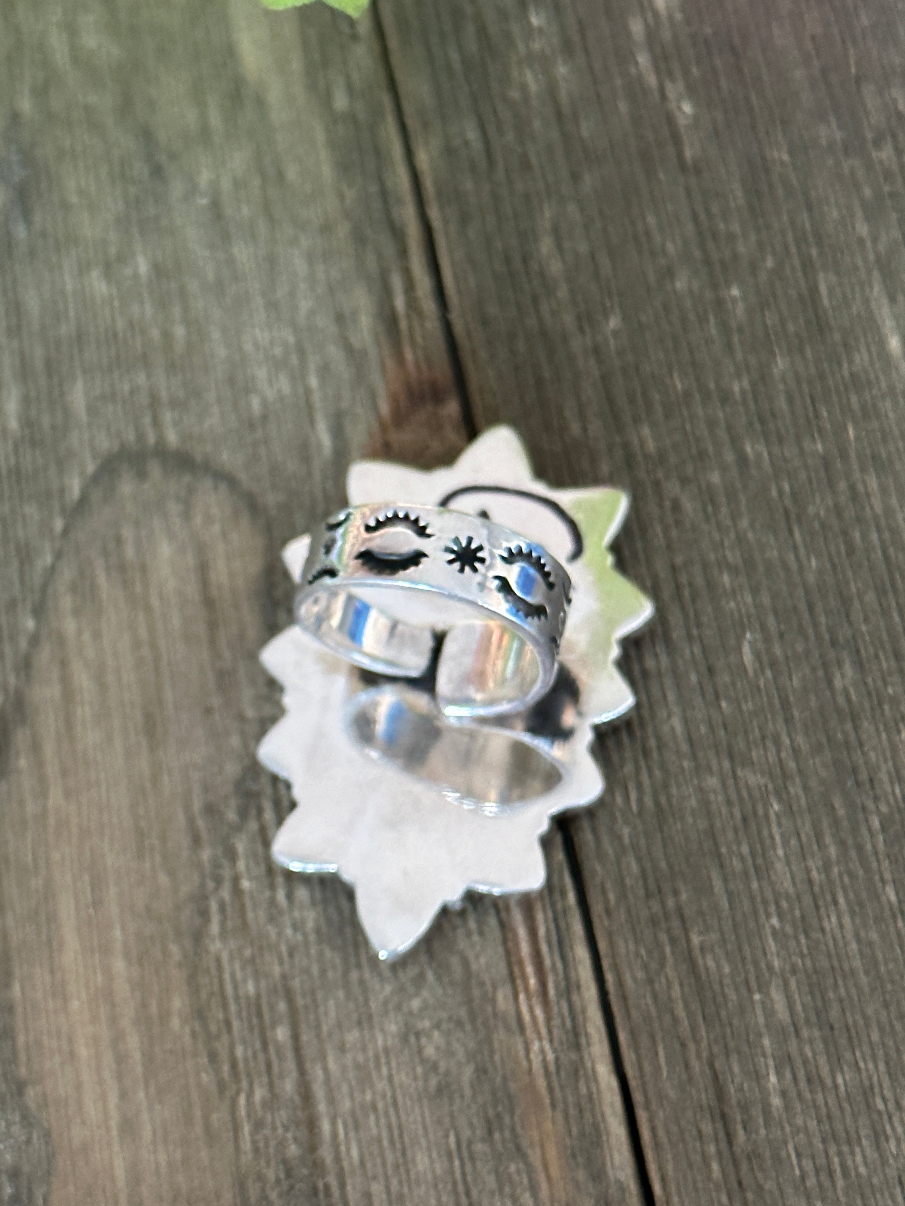 Southwest Handmade Multi Stone & Sterling Silver Adjustable Ring. It measures 1 7/8 inches long and 1 1/4 inches wide. Signed by artist and stamped sterling silver.