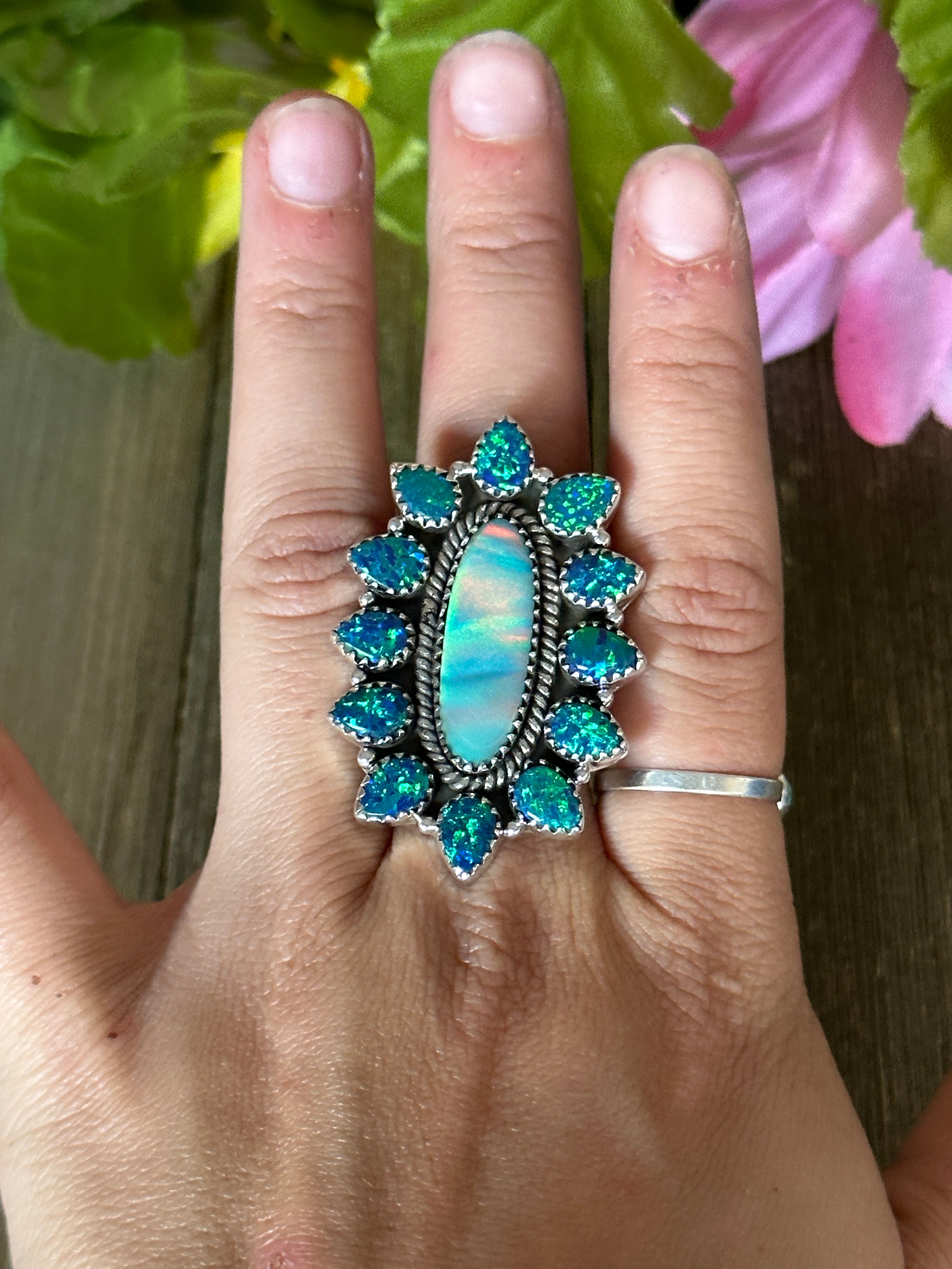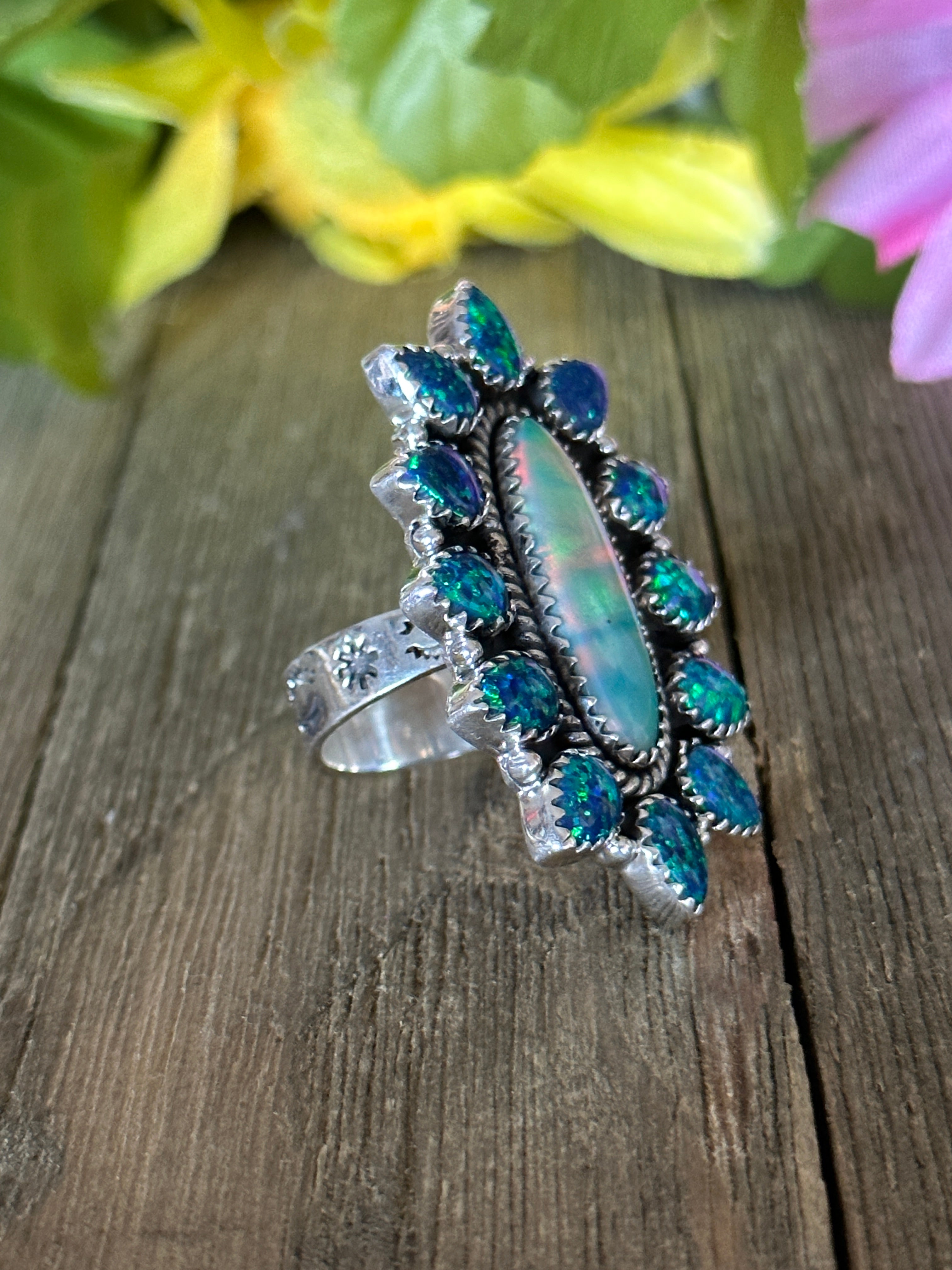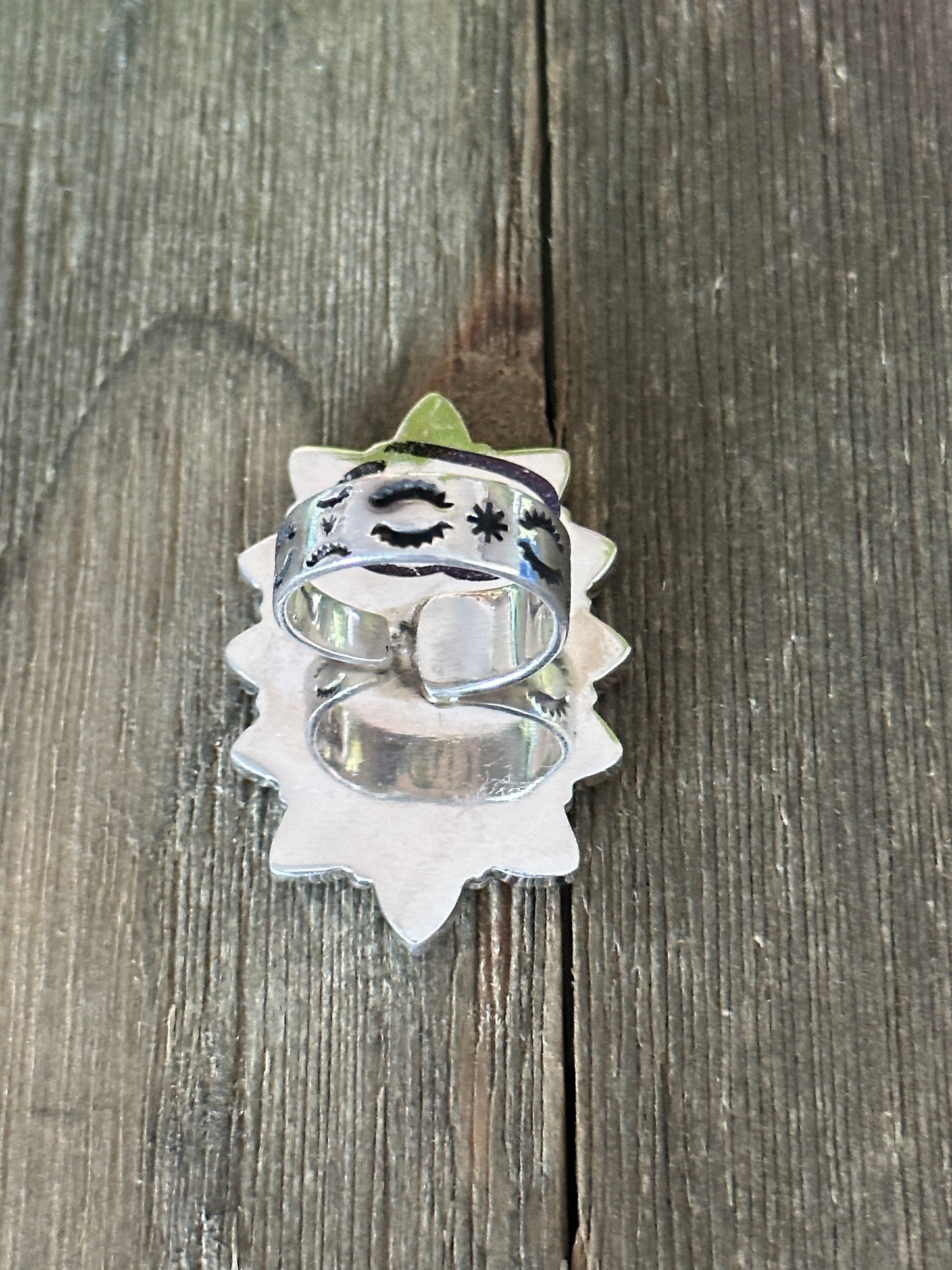 Southwest Handmade Multi Stone & Sterling Silver Adjustable Ring. It measures 1 3/4 inches long and 1 5/8 inches wide. Signed by artist and stamped sterling silver.