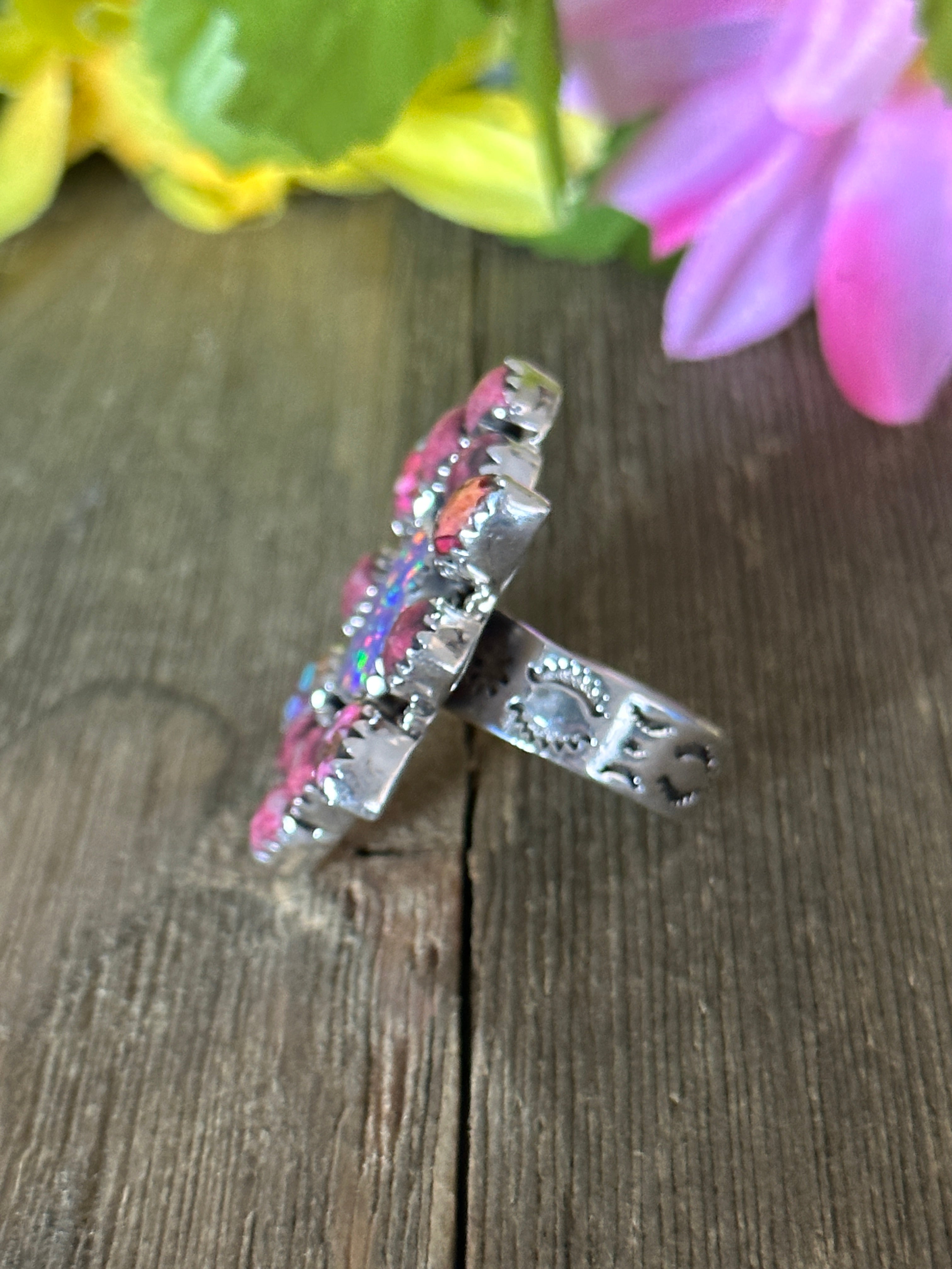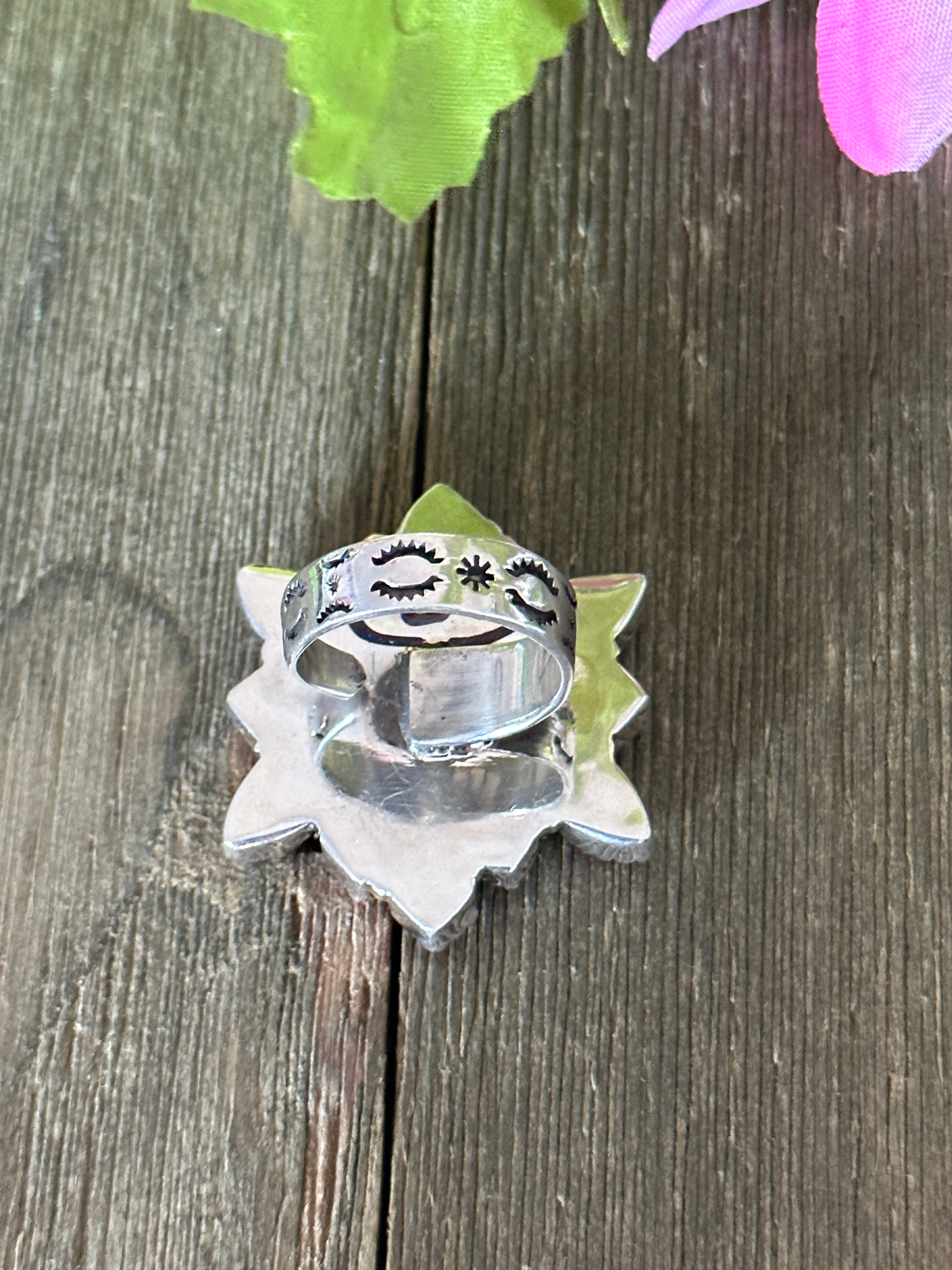 Southwest Handmade Multi Stone & Sterling Silver Adjustable Ring. It measures 1 5/8 inches long and 1 3/8 inches wide. Signed by artist and stamped sterling silver.