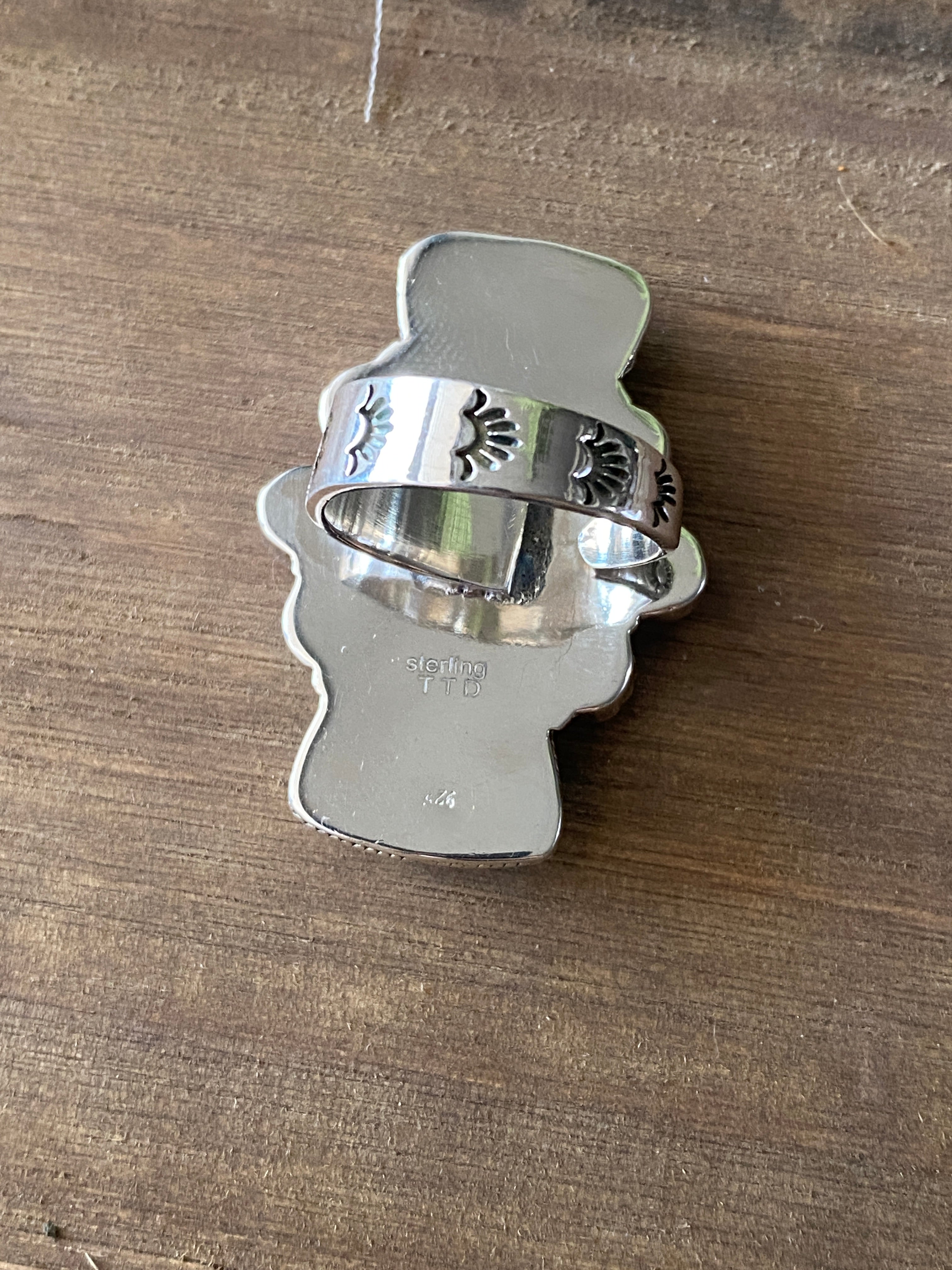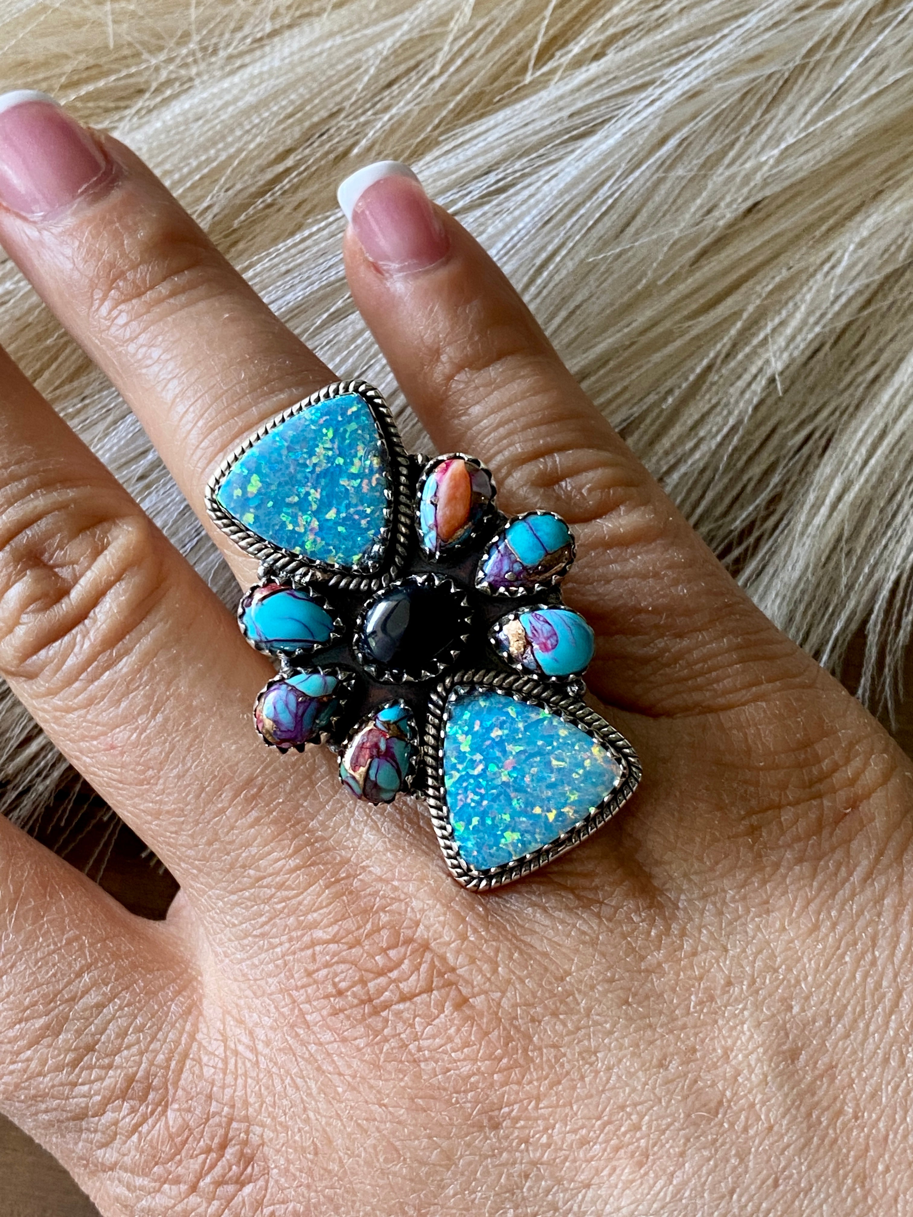 Southwest Handmade Multi Stone & Sterling Silver Adjustable Ring. It measures 1 3/4 inches long and 1 1/8 inches wide. Signed by the artist and stamped sterling silver.