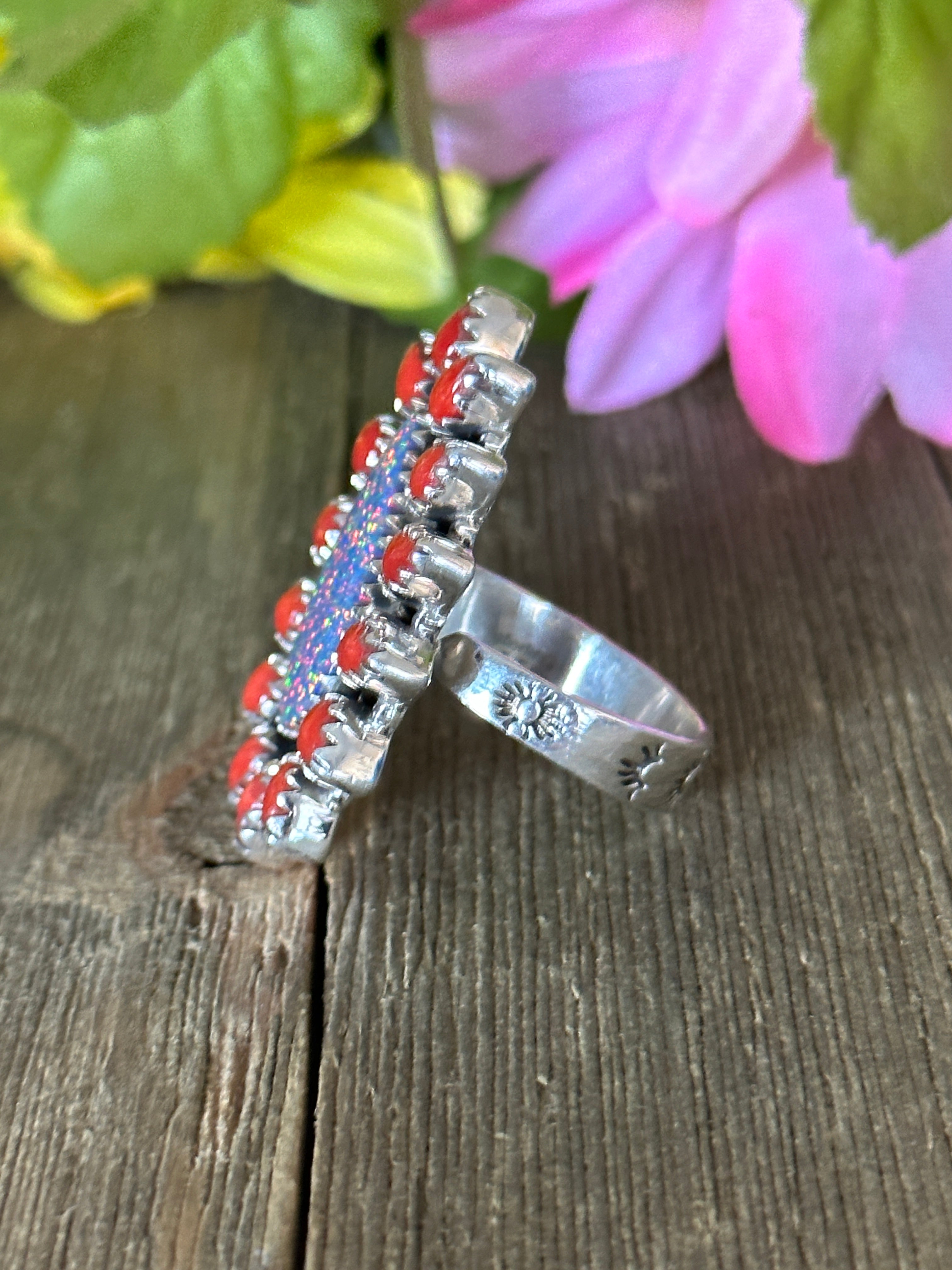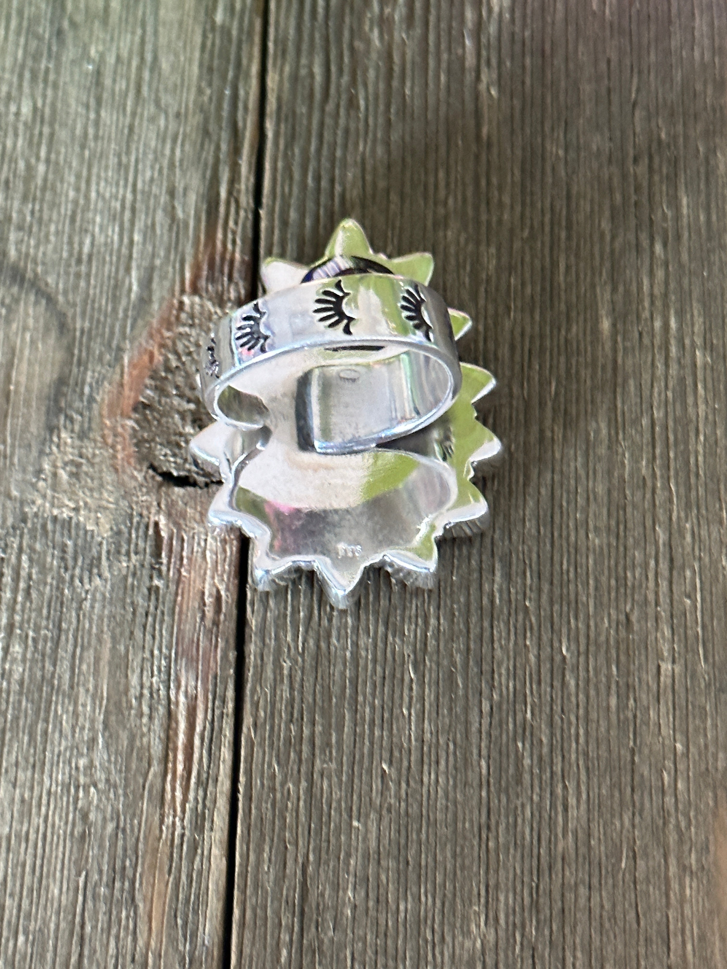 Southwest Handmade Multi Stone & Sterling Silver Adjustable Ring. It measures 1 5/8 inches long and 1 1/8 inches wide. Signed by artist and stamped sterling silver.
