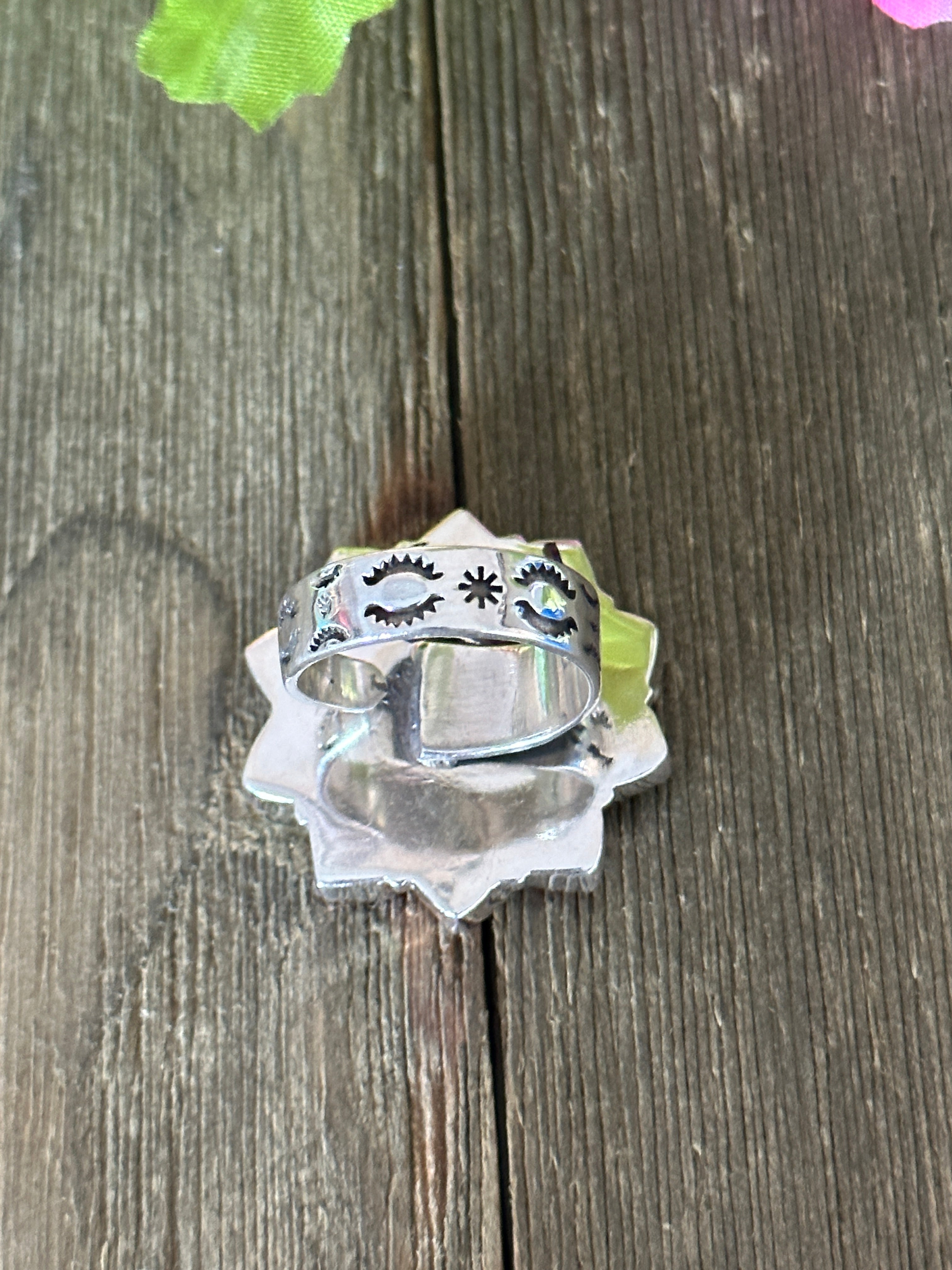 Southwest Handmade Multi Stone & Sterling Silver Adjustable Ring. It measures 1 1/4 inches long and 1 3/4 inches wide. Signed by artist and stamped sterling silver.