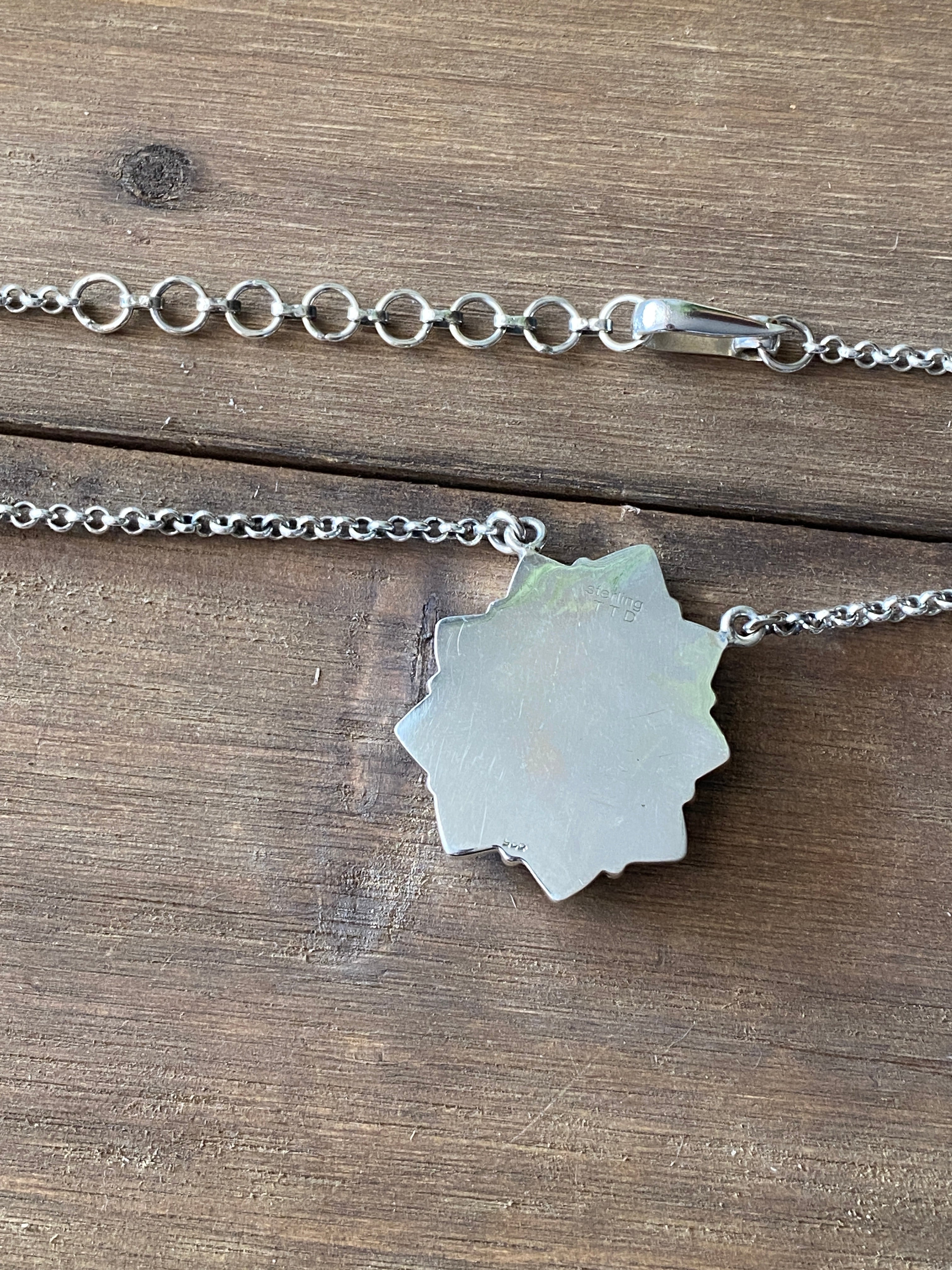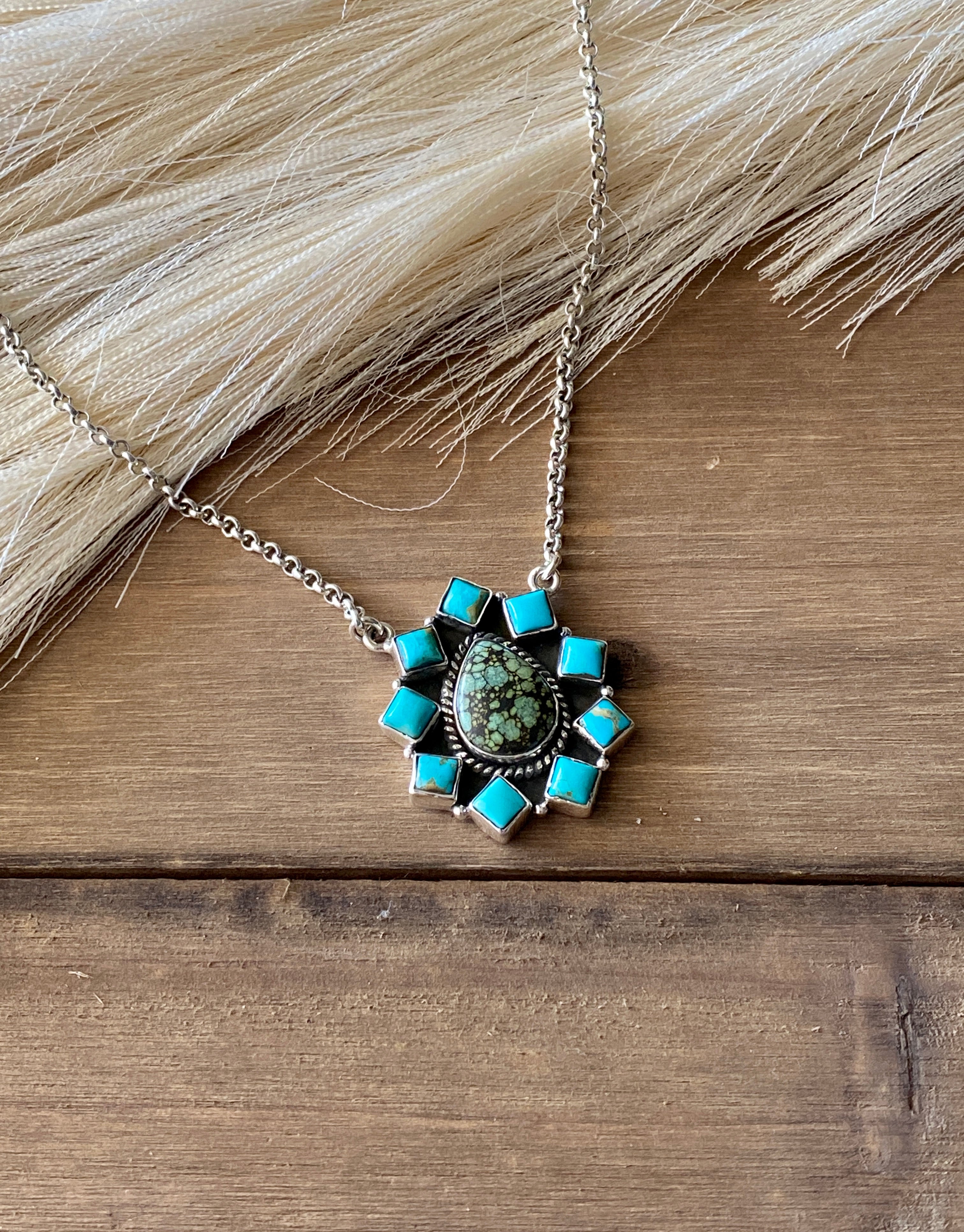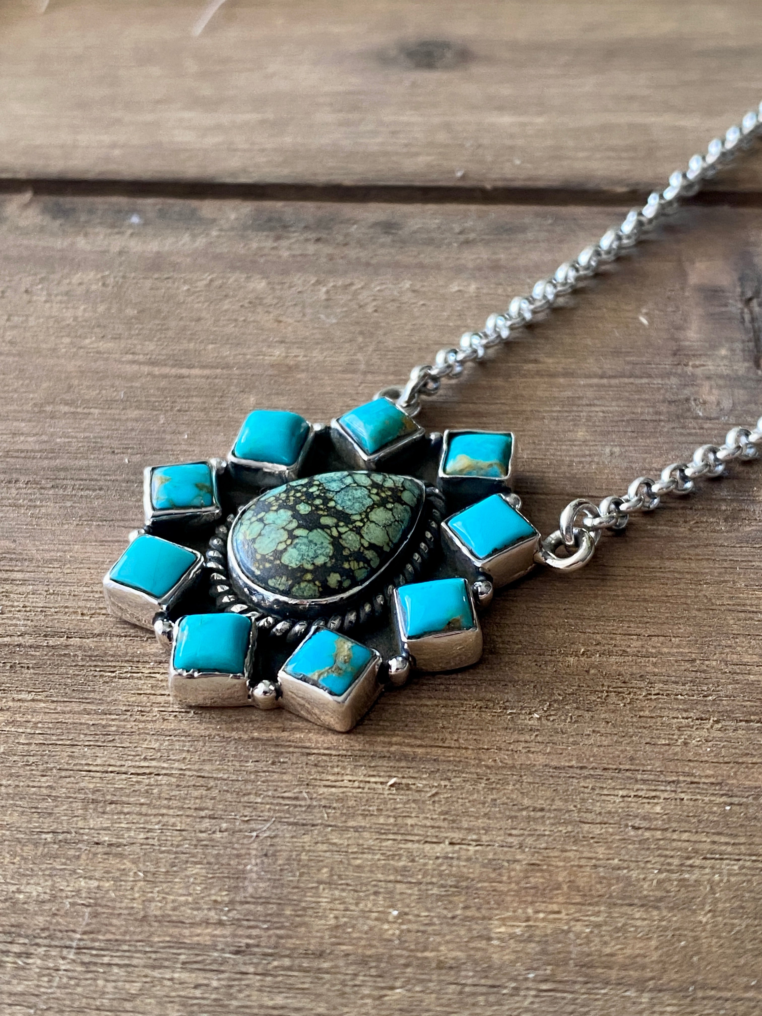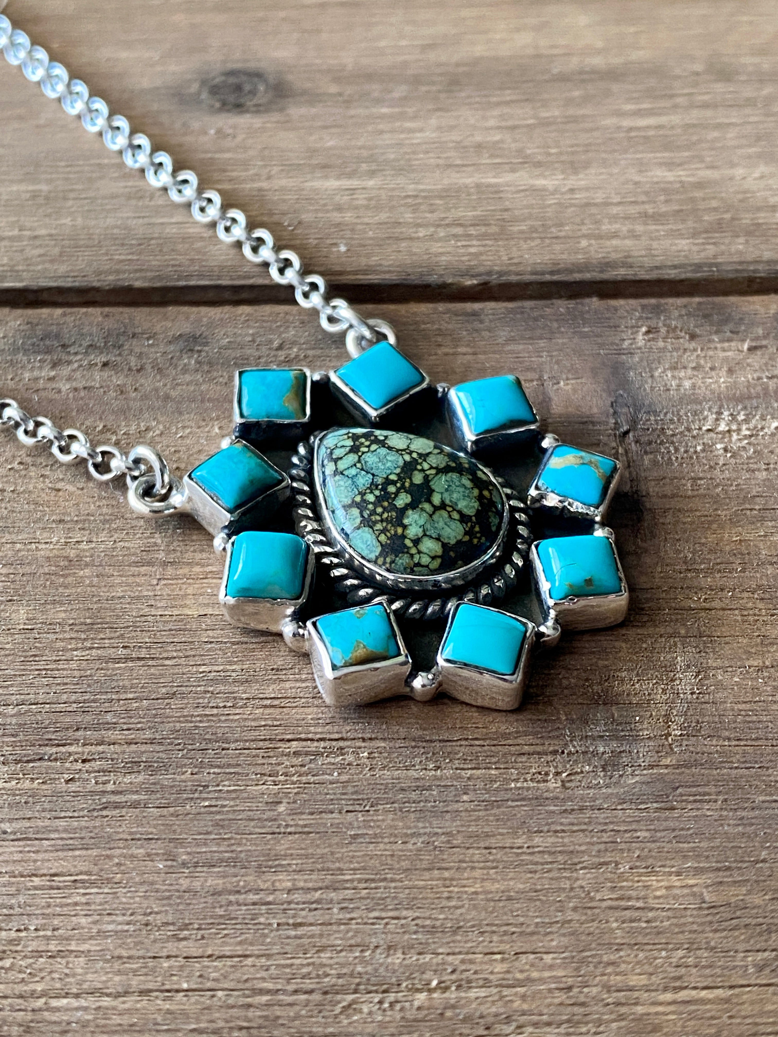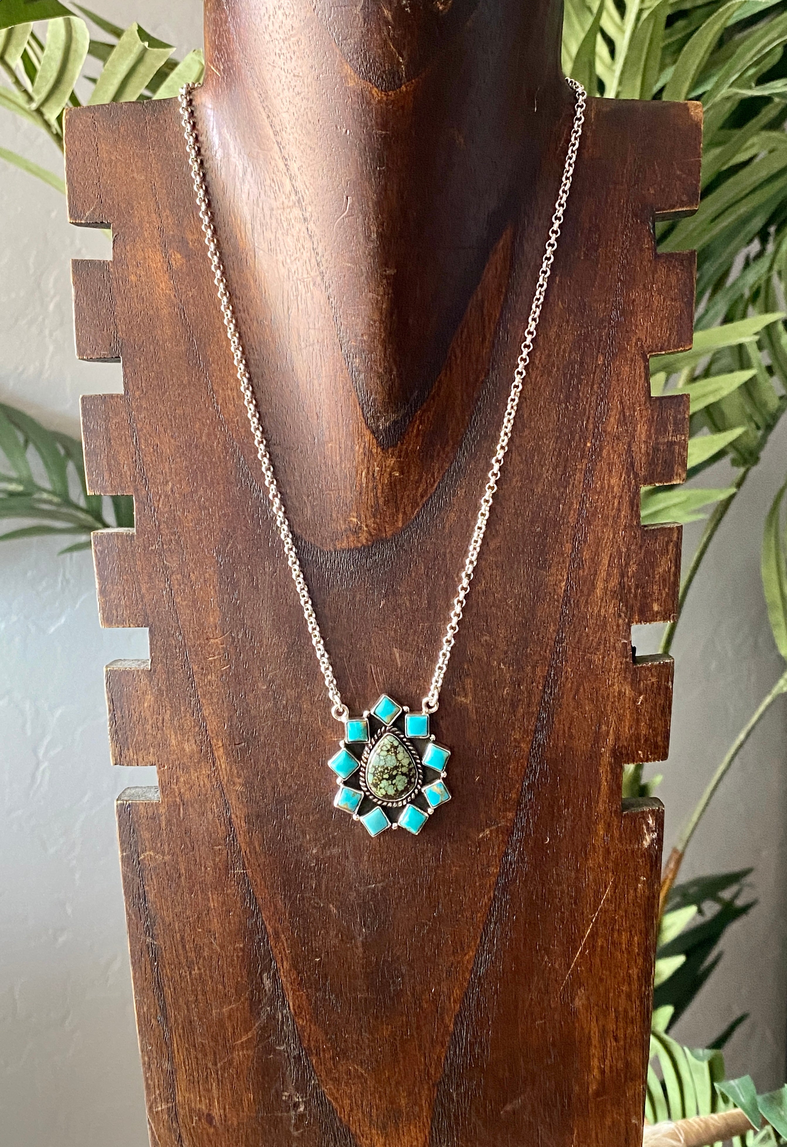 Southwest Handmade Multi Stone & Sterling Silver Cluster Necklace. The necklace measures 19 inches long with hang but can adjust down to 17 inches long. Signed by the artist and stamped sterling silver.
