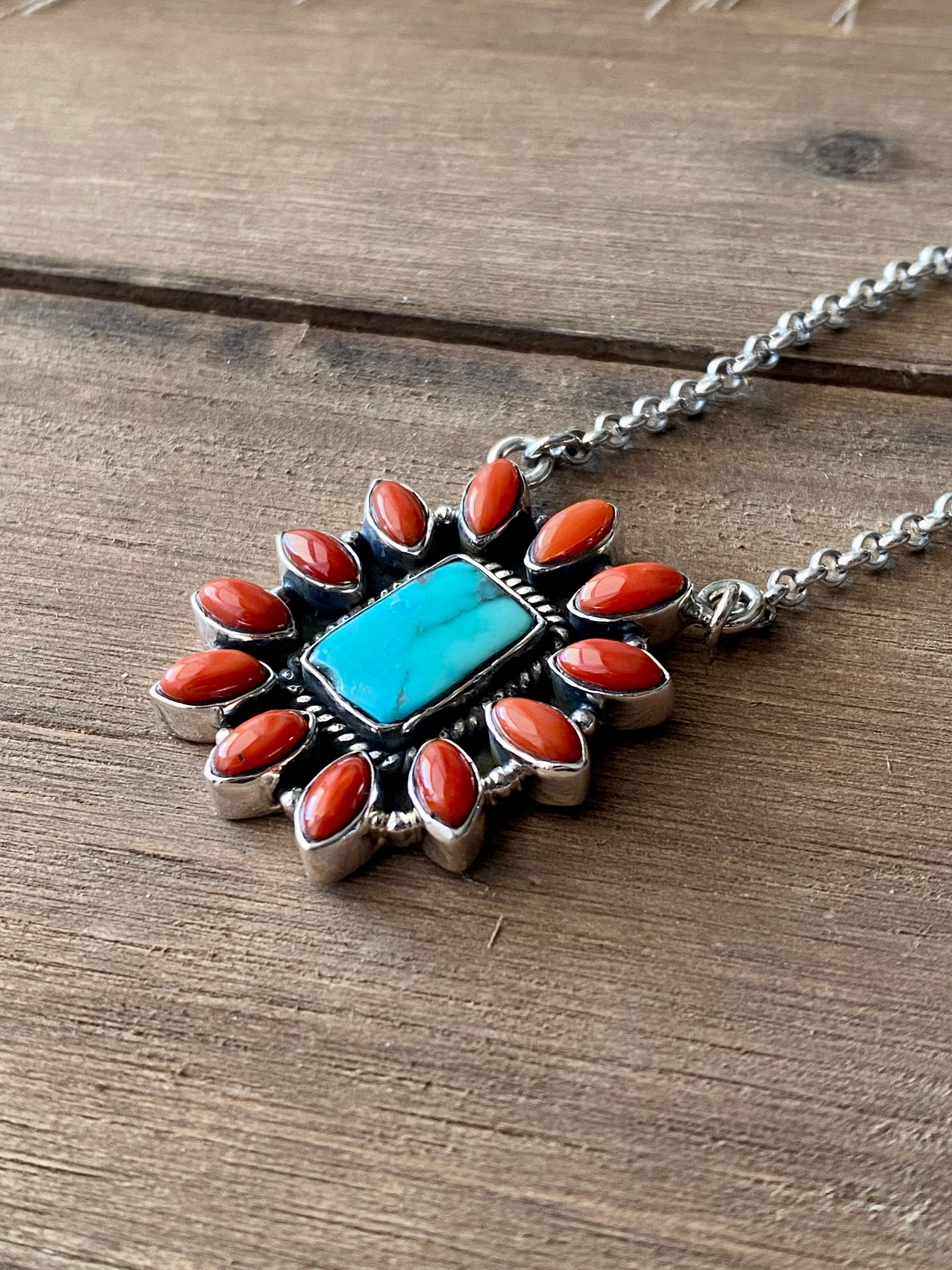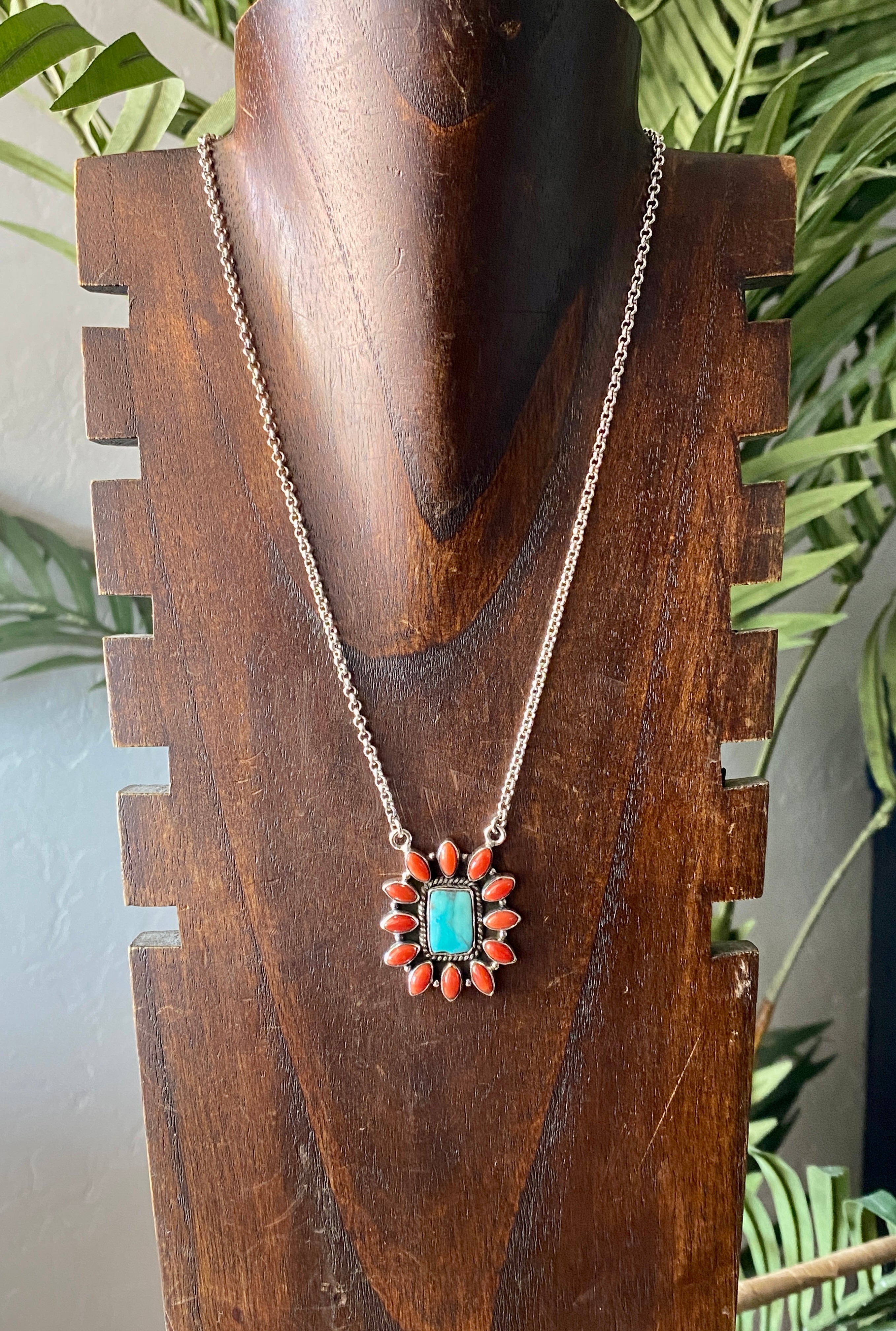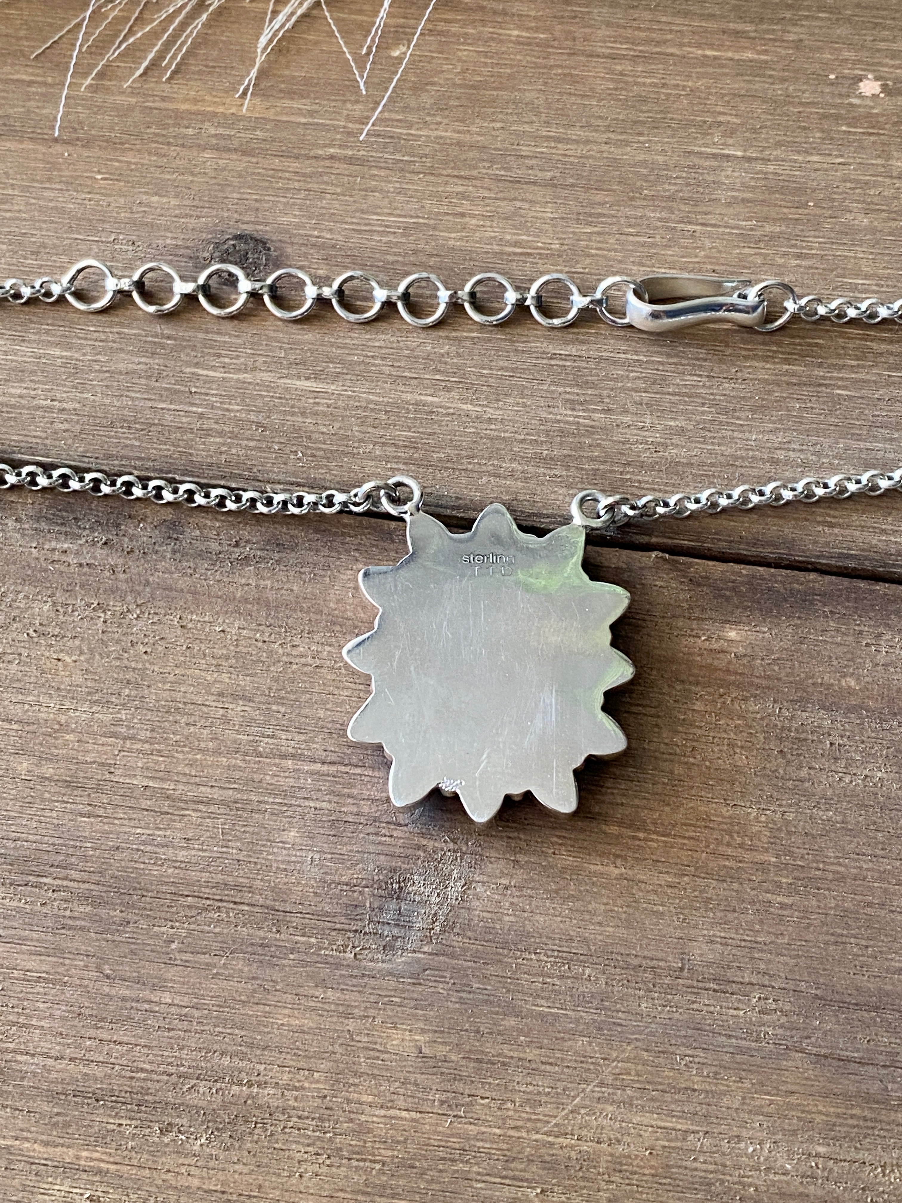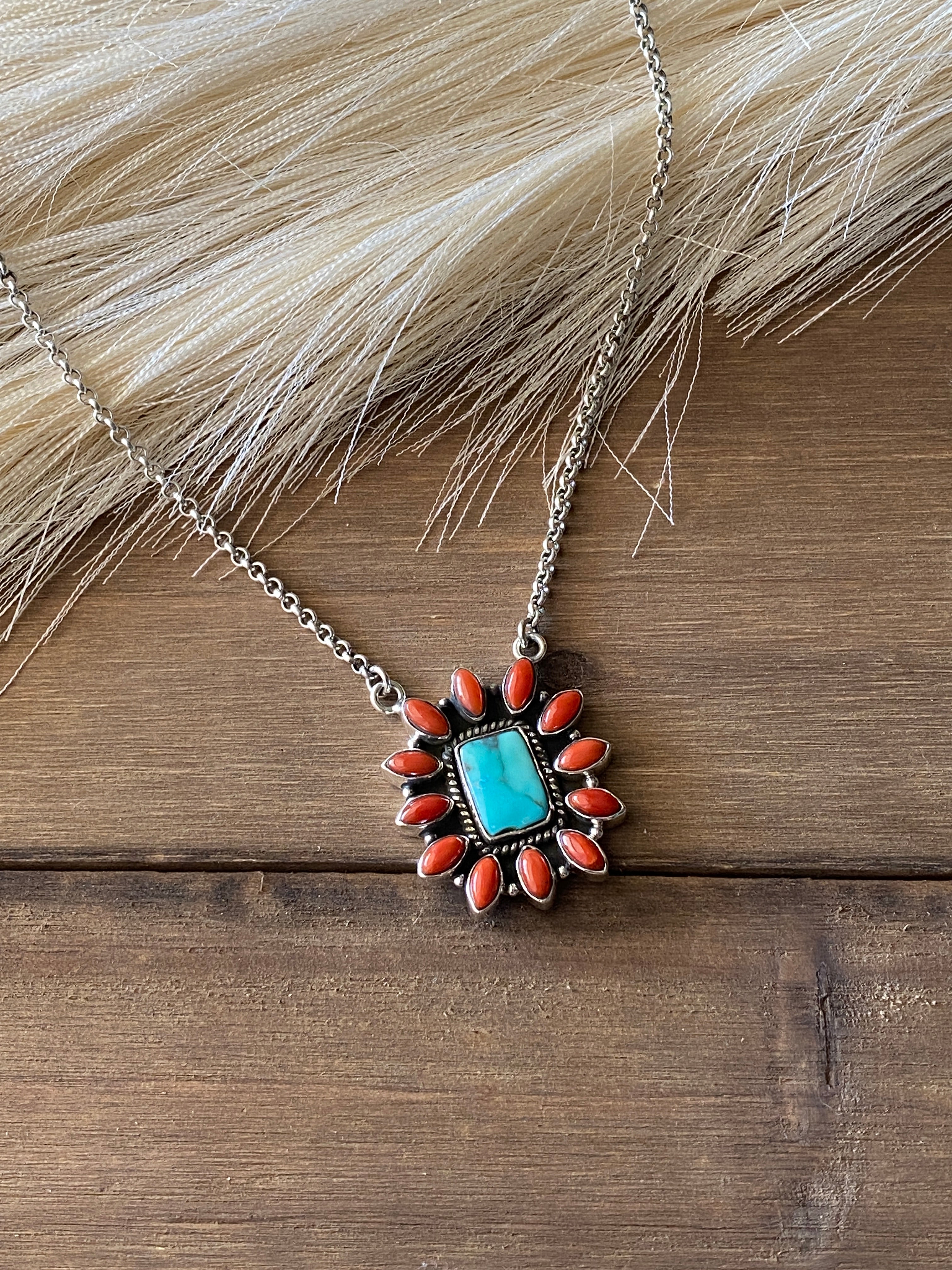 Southwest Handmade Multi Stone & Sterling Silver Cluster Necklace. The necklace measures 19 inches long with hang but can adjust down to 17 inches long. Signed by the artist and stamped sterling silver.