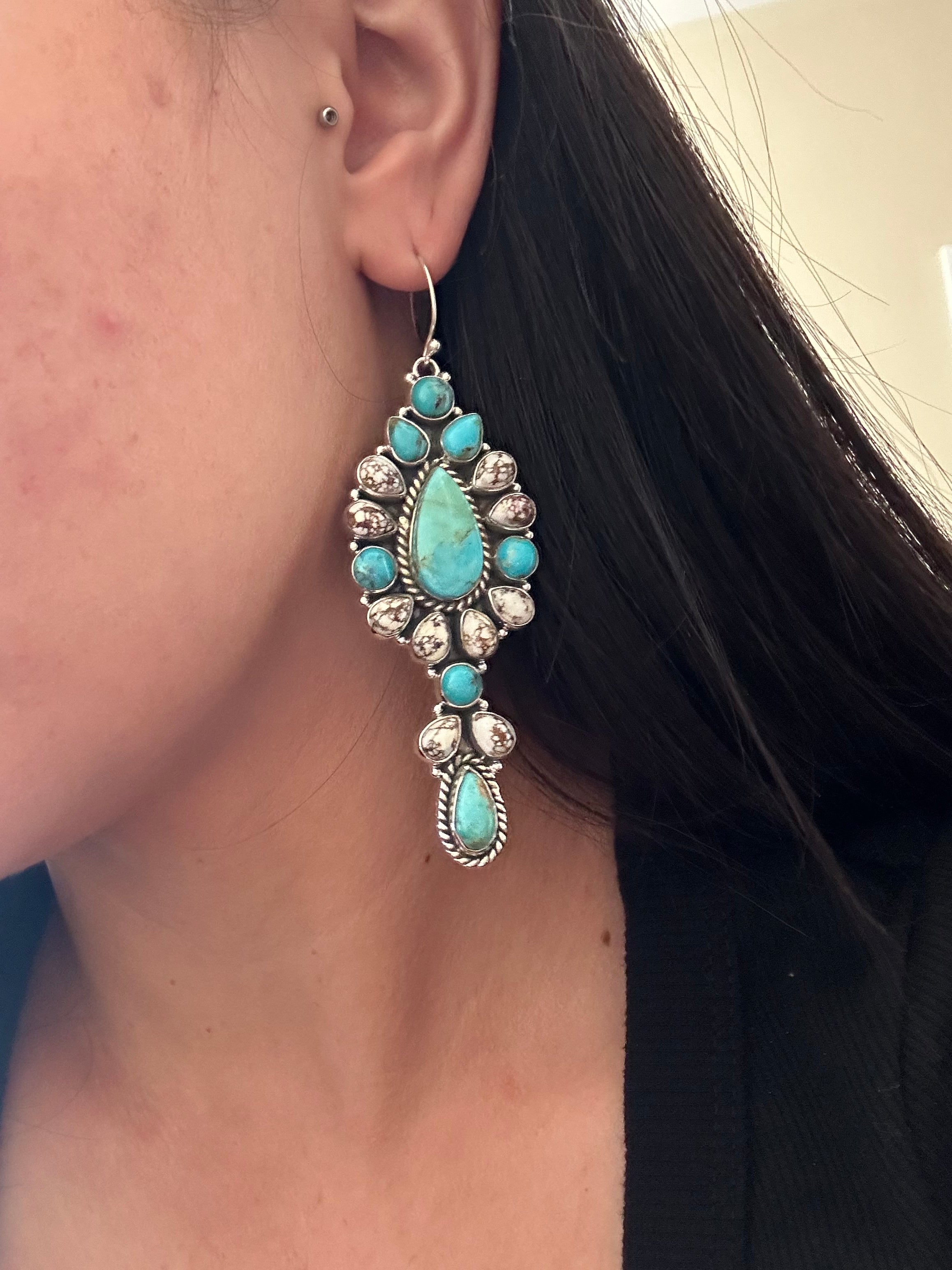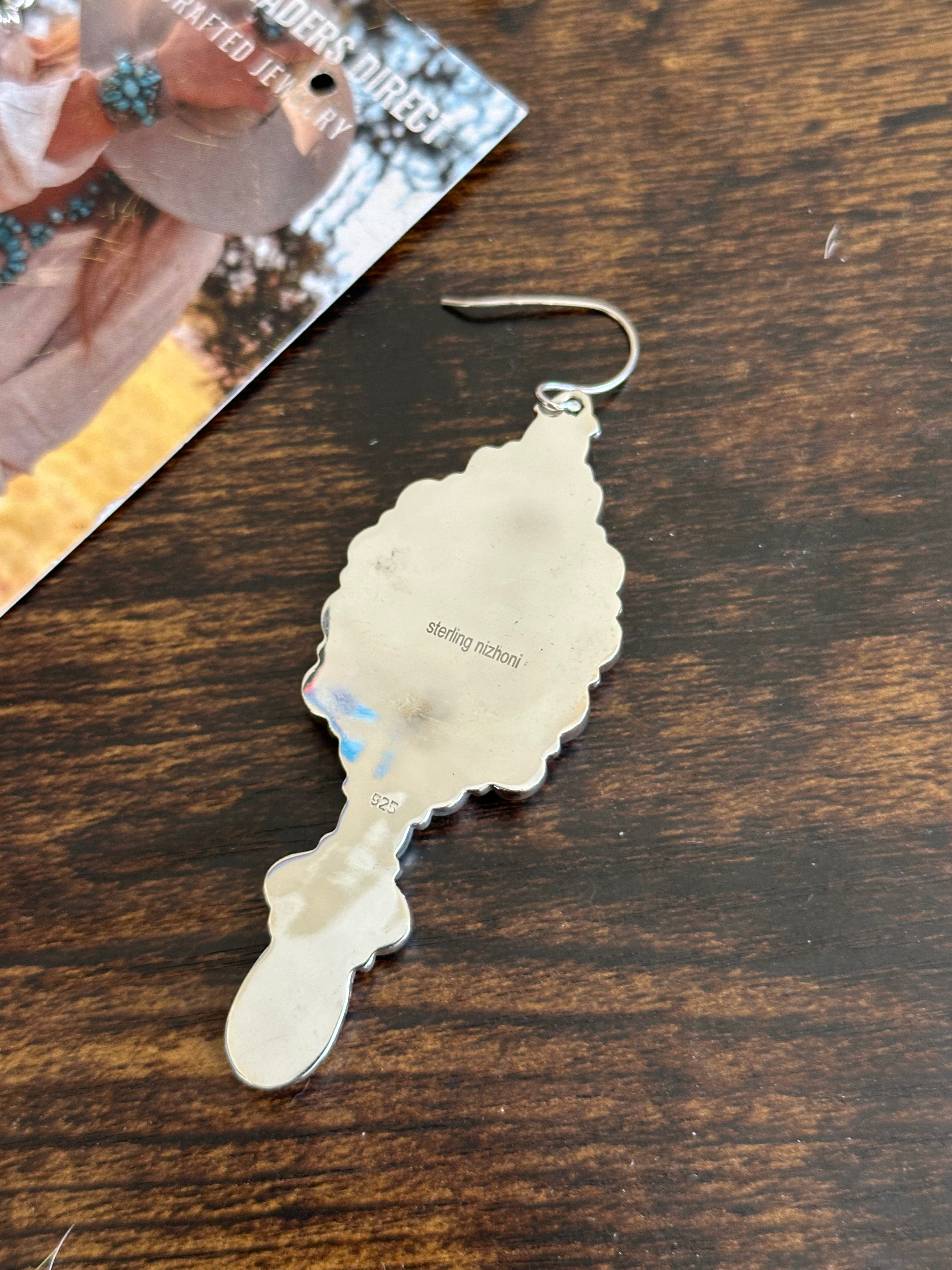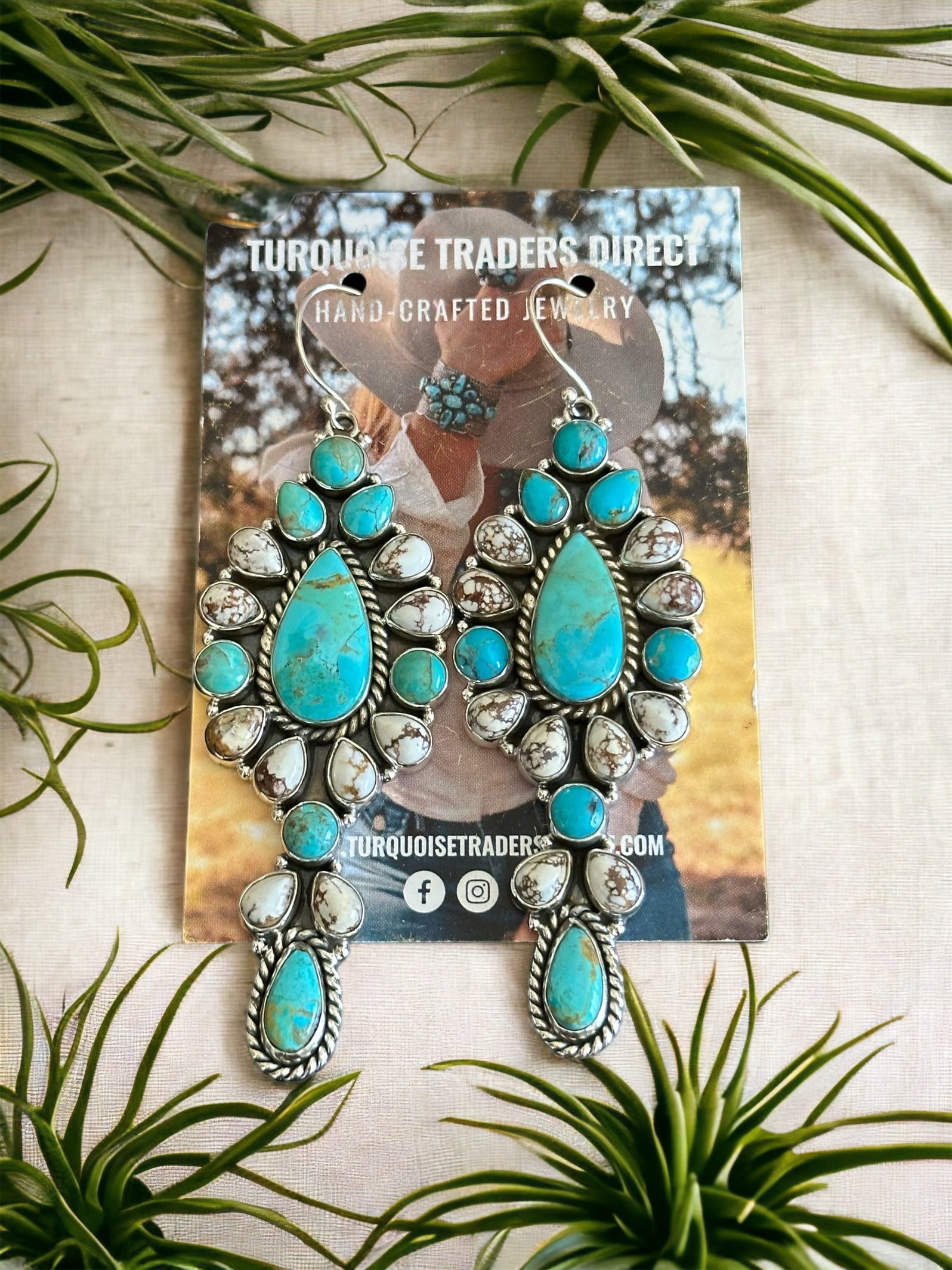 Breathtaking earrings. Southwest Handmade Multi Stone & Sterling Silver Dangle Cluster Earrings. It measures 3 1/2 inches long and 1 1/8 inches wide. Signed by the artist and stamped sterling silver.