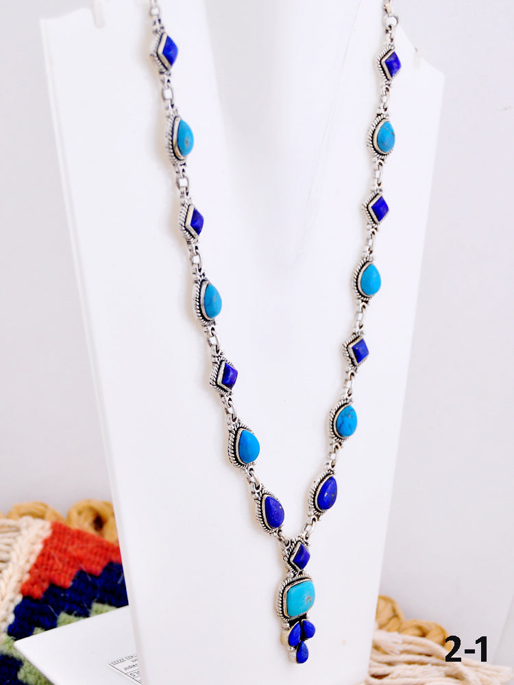 This stunning necklace features Lapis Lazuli with Kingman turquoise set in sterling silver, showcasing exceptional Southwest craftsmanship. It measures 27 inches long with hang and 12 inches long without hang.