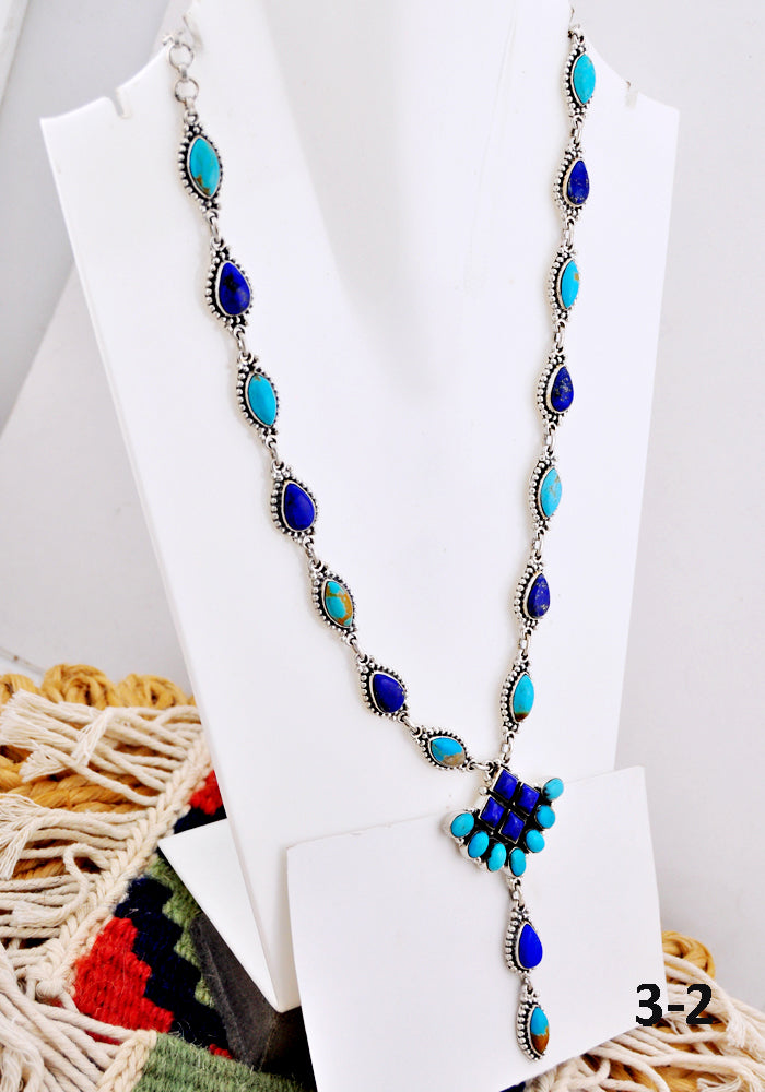 This stunning necklace features Lapis Lazuli with Kingman turquoise set in sterling silver, showcasing exceptional Southwest craftsmanship. It measures 32 inches long with hang and 12 inches long with drop 3 inches long.