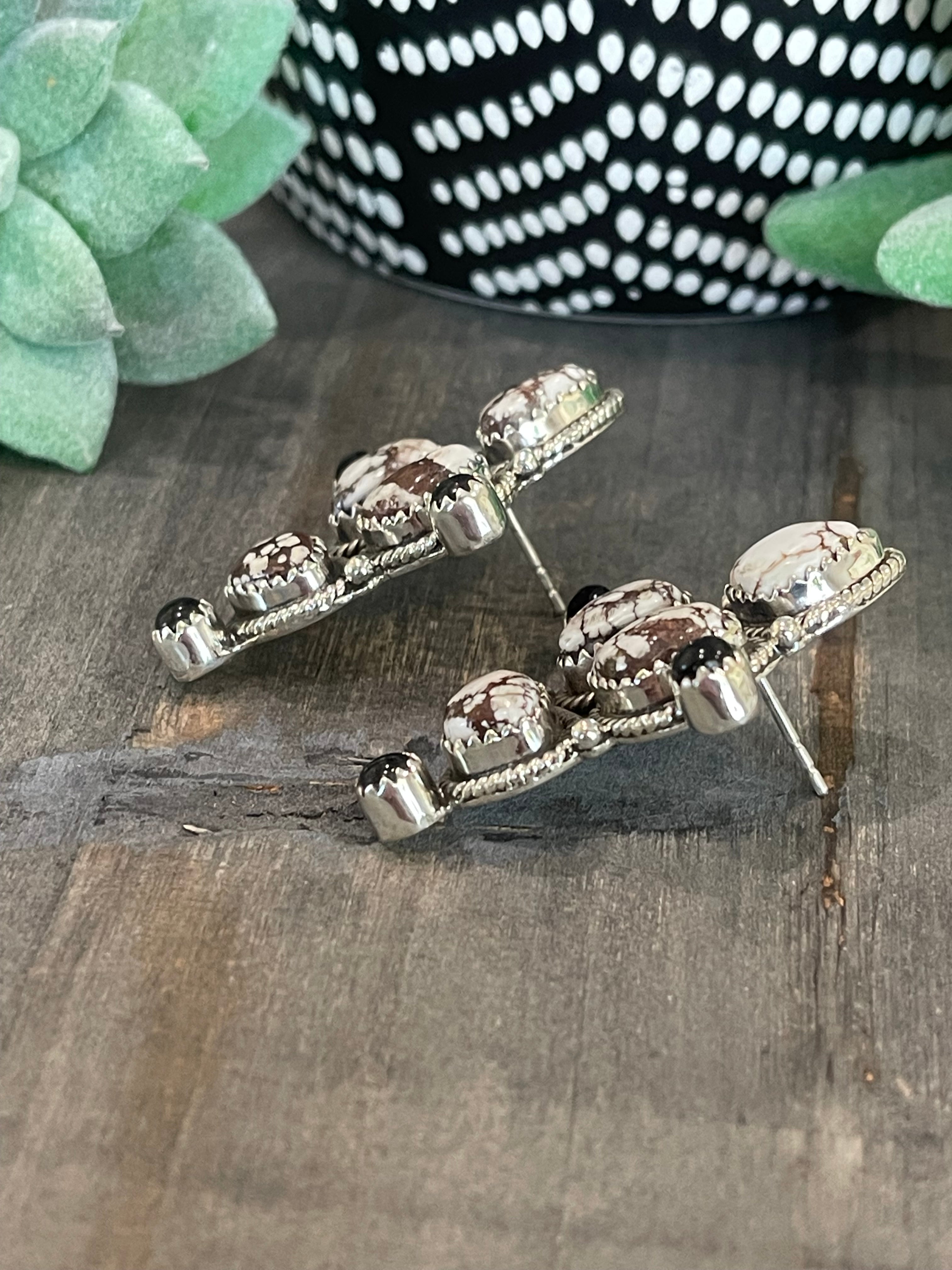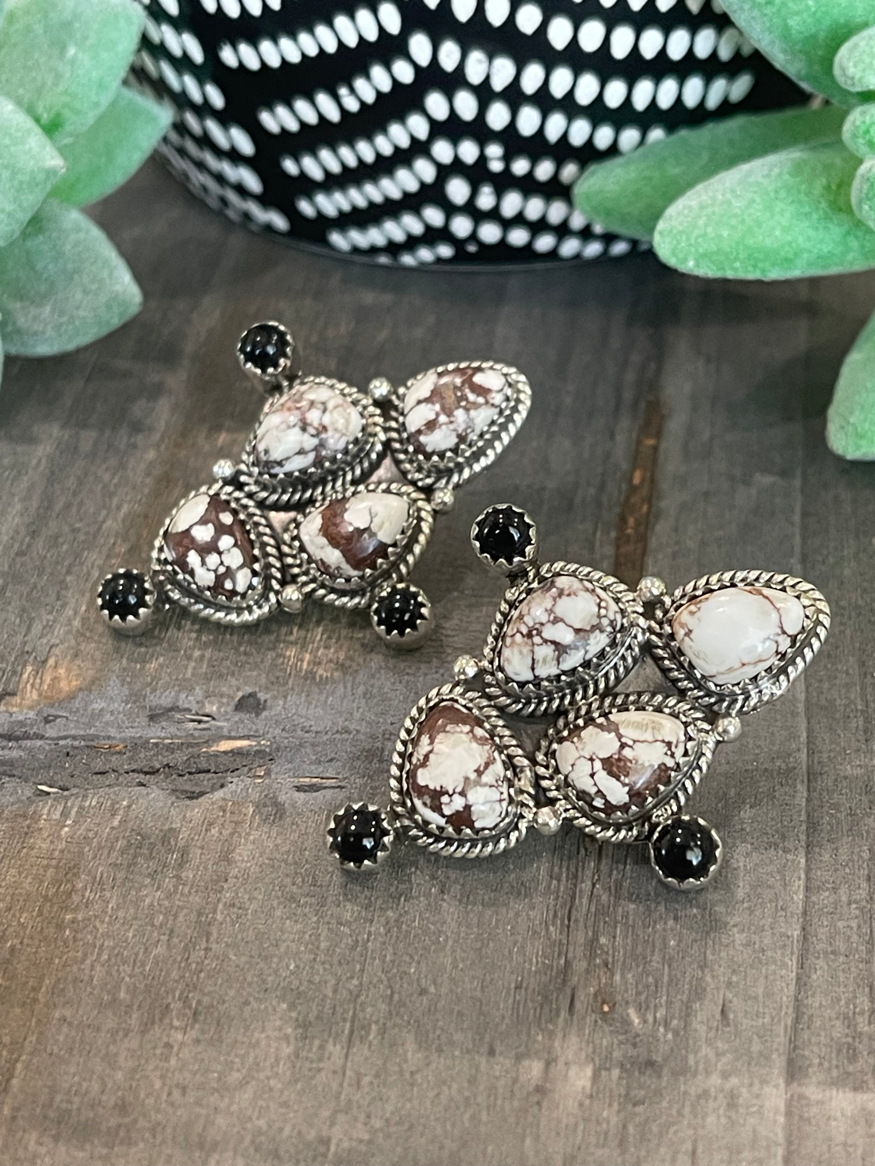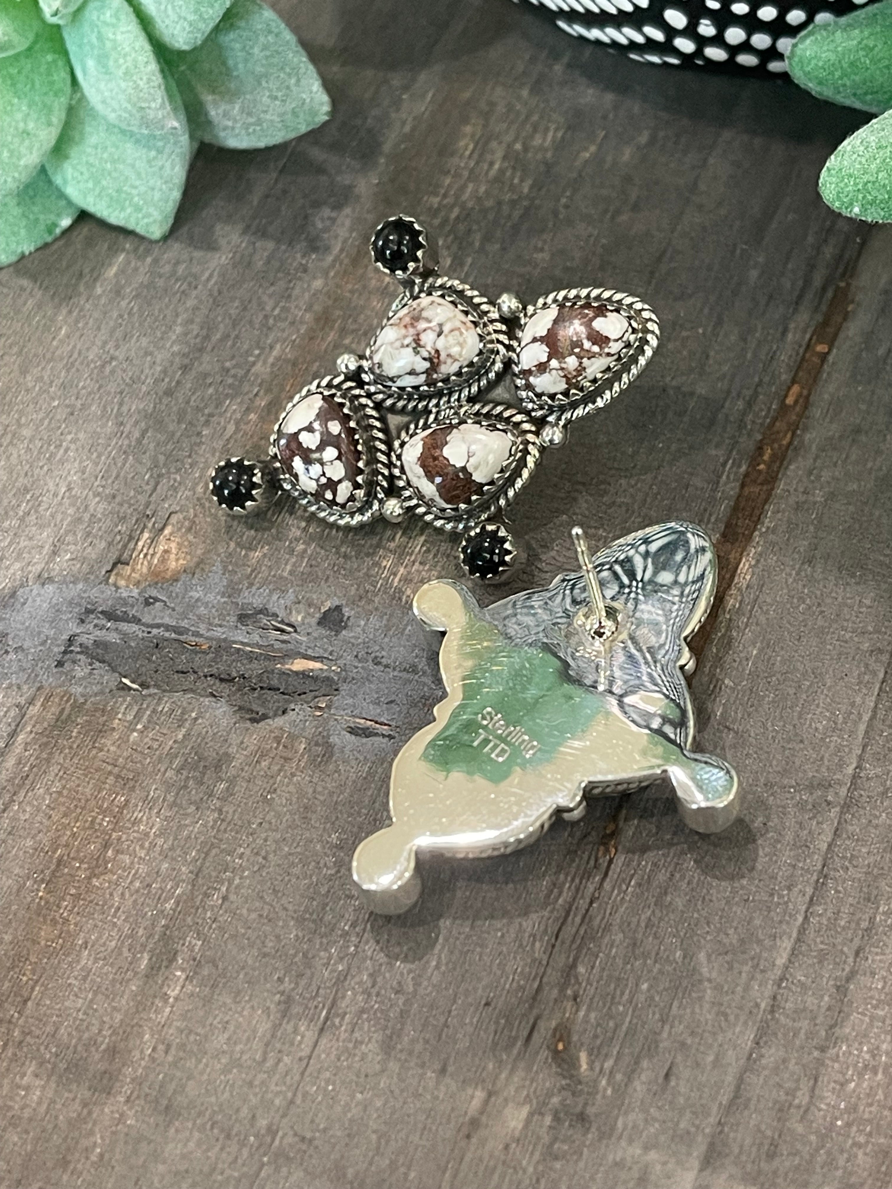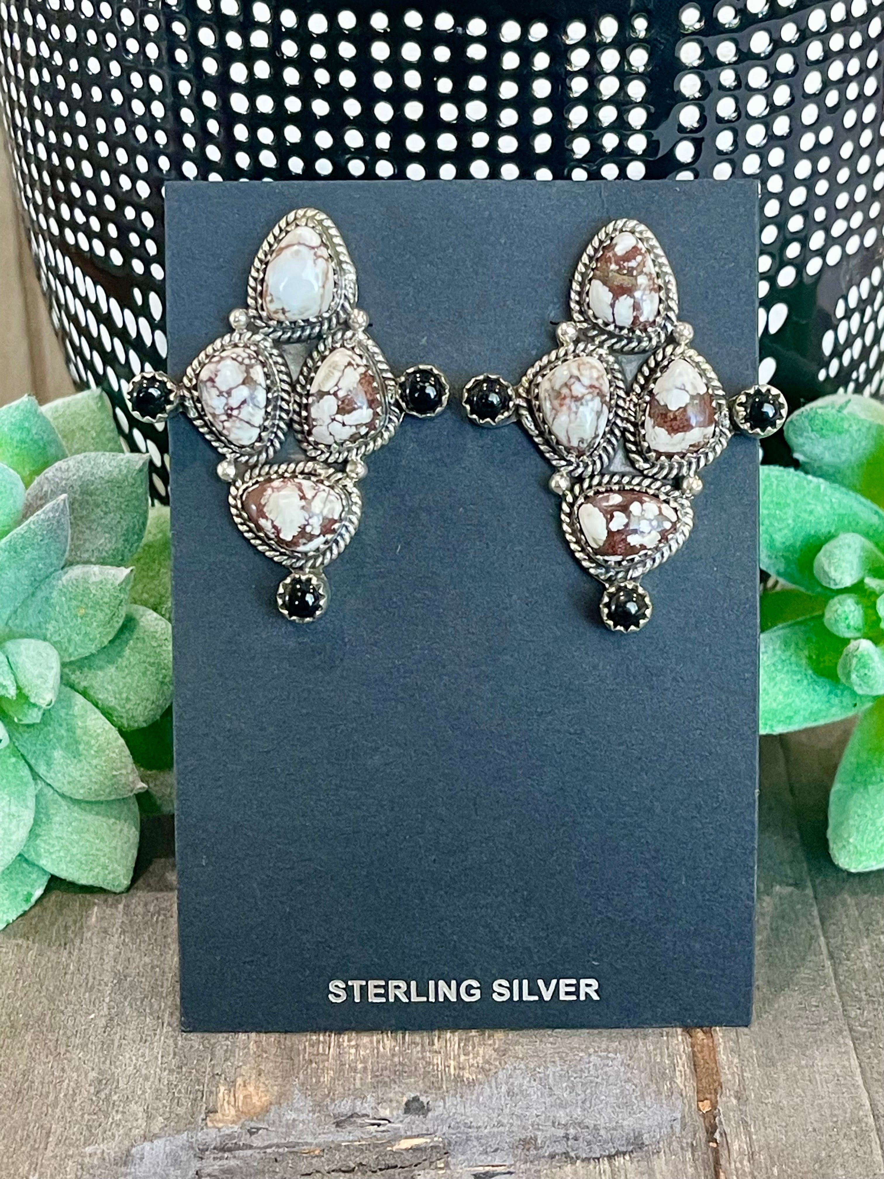 Breathtaking earrings. Southwest Handmade Wild Horse mixed with Black Onyx & Sterling Silver Post Cluster Earrings. It measures 1 5/8 inches long and 1 1/4 inches wide. Signed by the artist and stamped sterling silver.