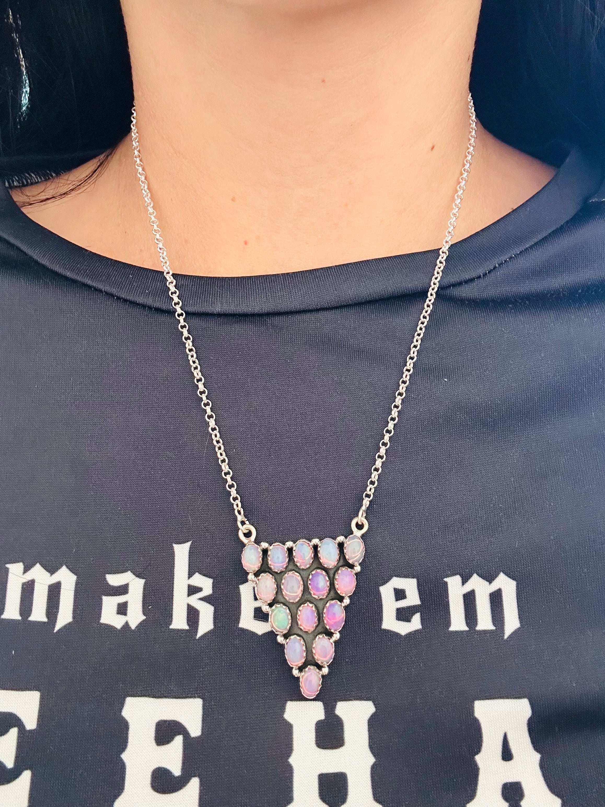 Beautiful necklace. Southwest Handmade Opal (Man Made) & Sterling Silver Cluster Necklace. It measures 22 inches long with hang while the chain by itself measures 19 inches long but can be adjusted down. Signed by the artist and stamped sterling silver.