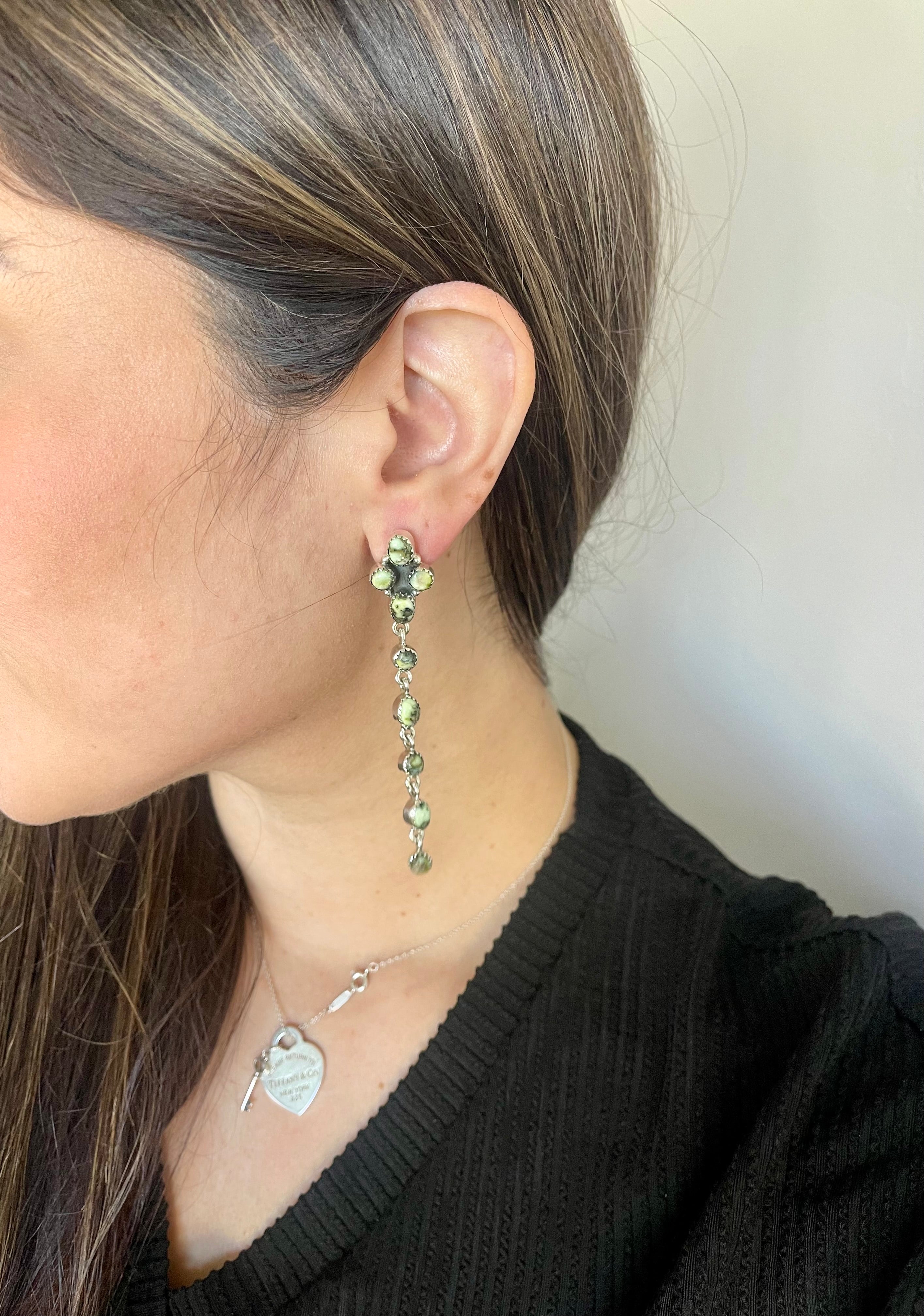 Breathtaking earrings. Southwest Handmade Palomino Variscite & Sterling Silver Post Dangle Earrings. It measures 3 1/4 inches long and 1/2 of an inch wide. Signed by the artist and stamped sterling silver.