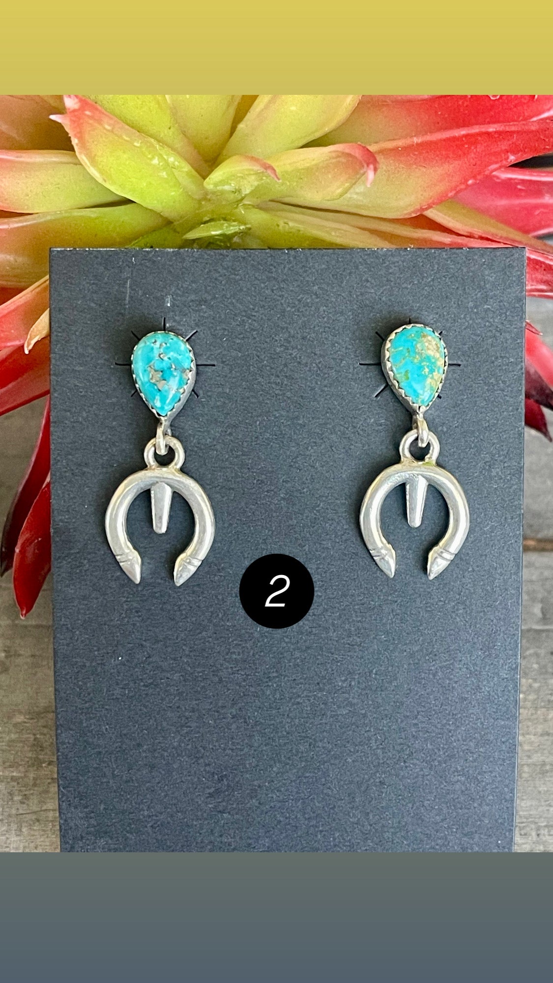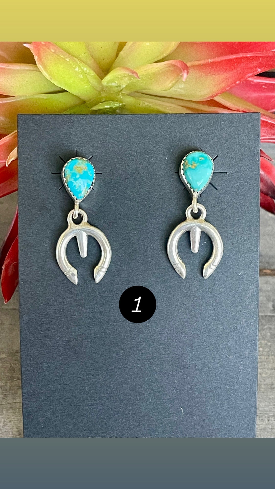 Breathtaking earrings. Southwest Handmade Kingman Turquoise & Sterling Silver Post Dangle Naja Earrings. They measures 1 3/8 inches long and just over 1/2 of an inch wide. Stamped sterling silver.