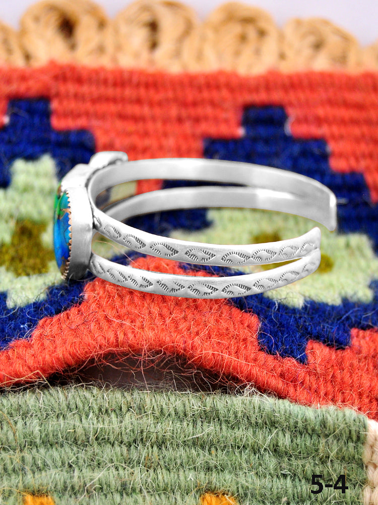 Southwest Handmade Peacock Dahlia & Sterling Silver Bangle Bracelet. It measures 3/4 of an inch wide with an inside circumference of 6 3/4 inches and a gap of 5/8 inch. Signed by the artist and stamped sterling silver.