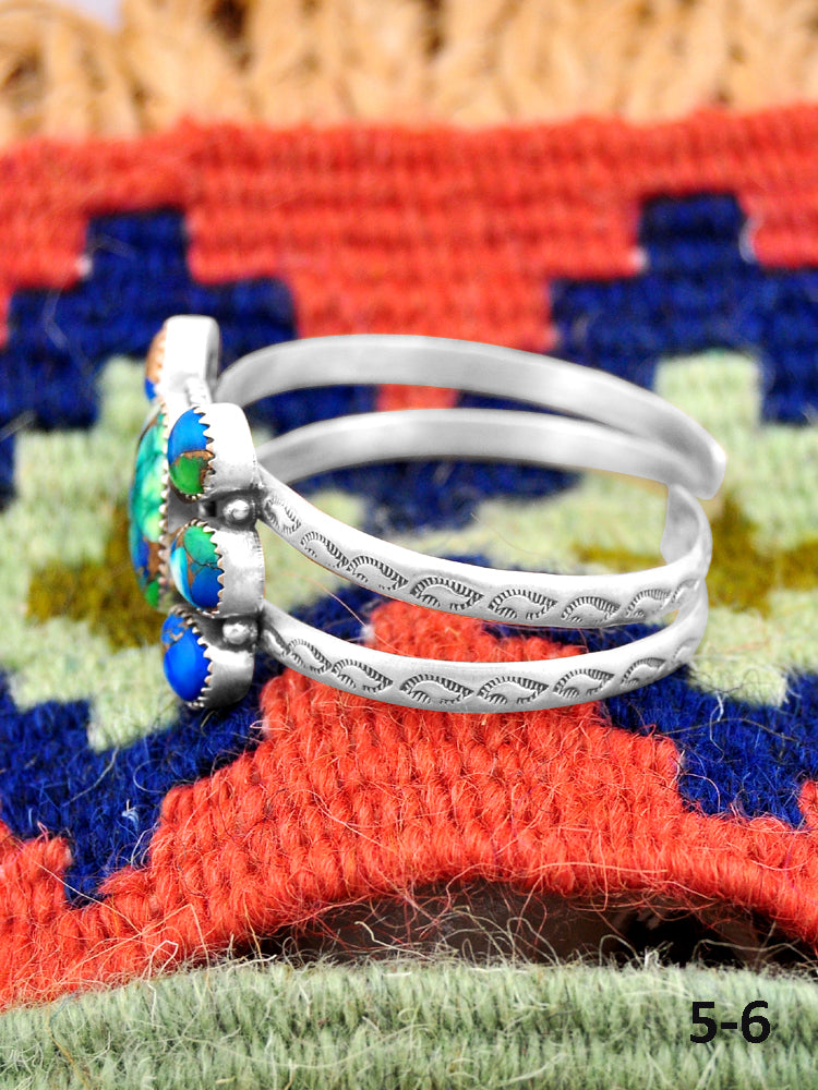 Southwest Handmade Peacock Dahlia & Sterling Silver Bangle Bracelet. It measures 1 1/8 inch wide with an inside circumference of 6 3/8 inches and a gap of 3/4 of an inch. Signed by the artist and stamped sterling silver.