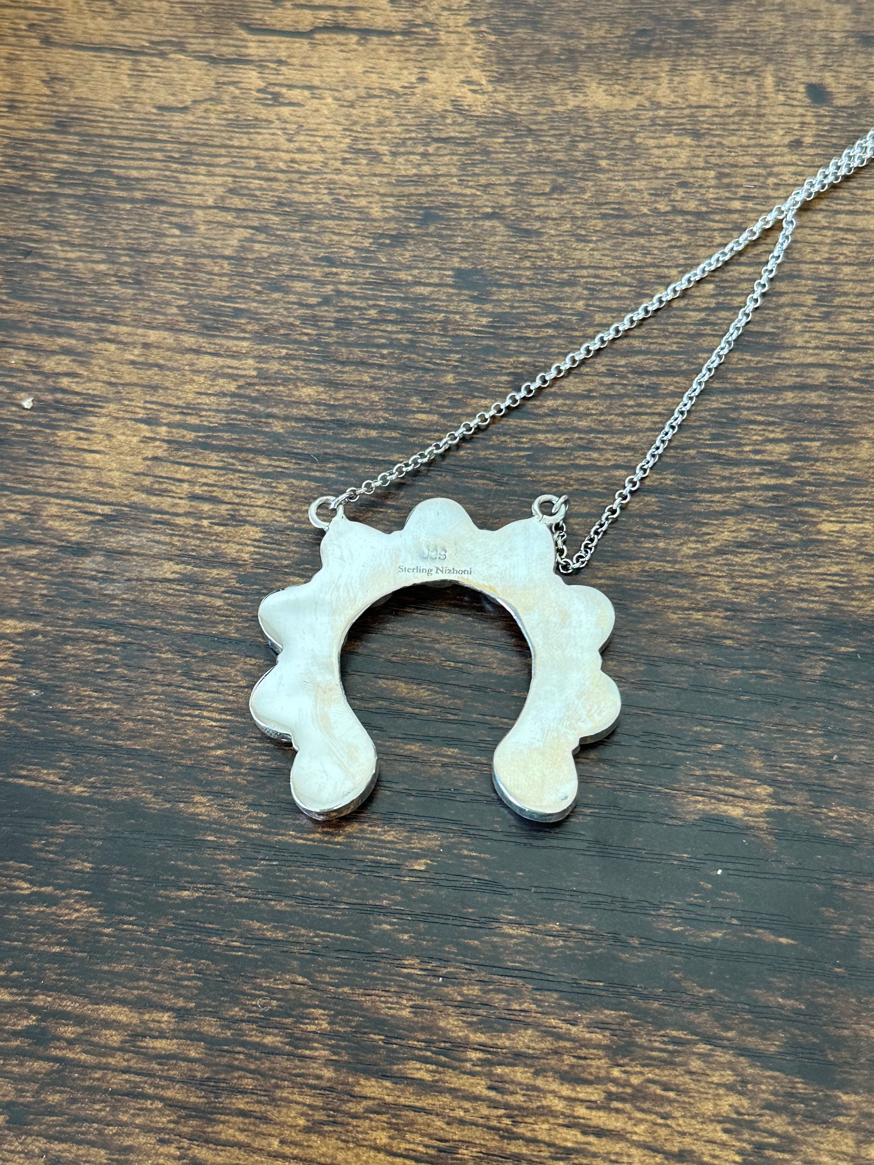 Beautiful necklace, great sterling around stone. Southwest Handmade Pink Conch & Sterling Silver Naja Necklace. It measures 20 inches long with hang while the chain by itself measures 17 inches long but can adjust down to 15 inches long. Signed by the artist and stamped sterling silver. Stones will differ due to natural stones.
