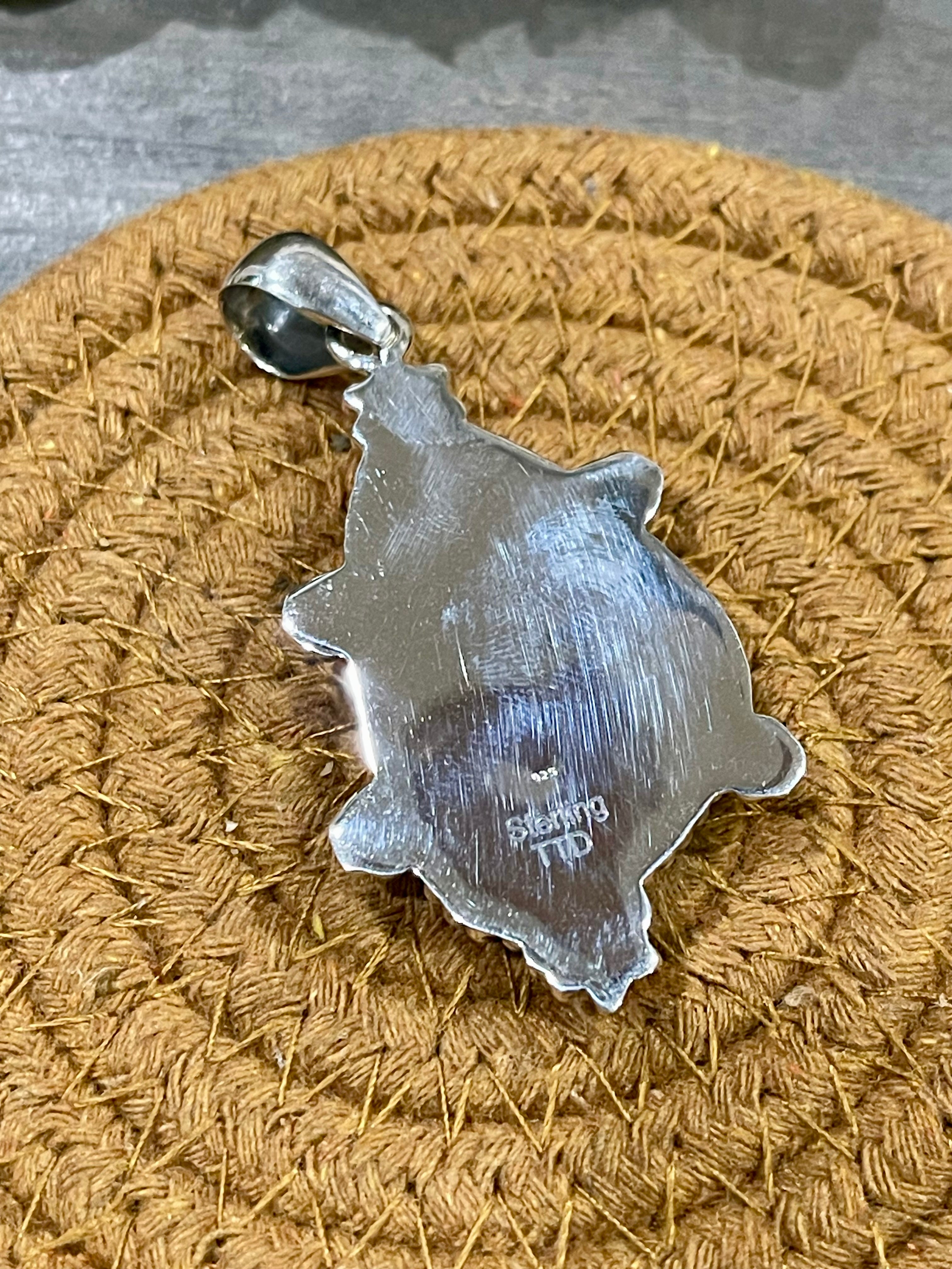 Beautiful craftsmanship. Southwest Handmade Pink Larimar & Sterling Silver Pendant. It measures 2 1/2 inches long and 1 1/8 inches wide. Pendant Only. Signed by the artist and stamped sterling silver.