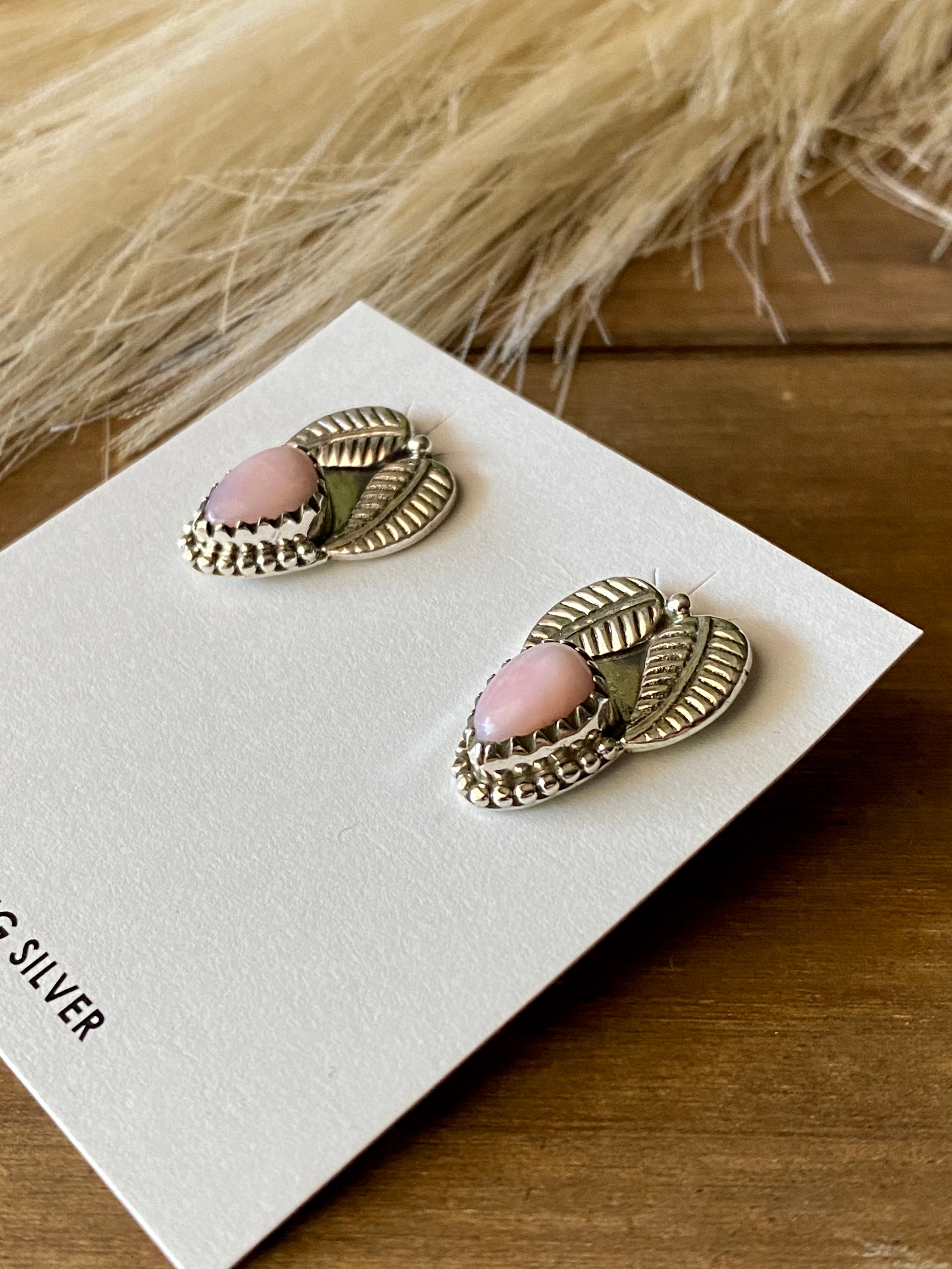 A beautiful Southwest Handmade Pink Opal & Sterling Silver Post Earrings. They measure 7/8 of an inch long and just over 5/8 of an inch wide. Signed by the artist and stamped sterling silver.