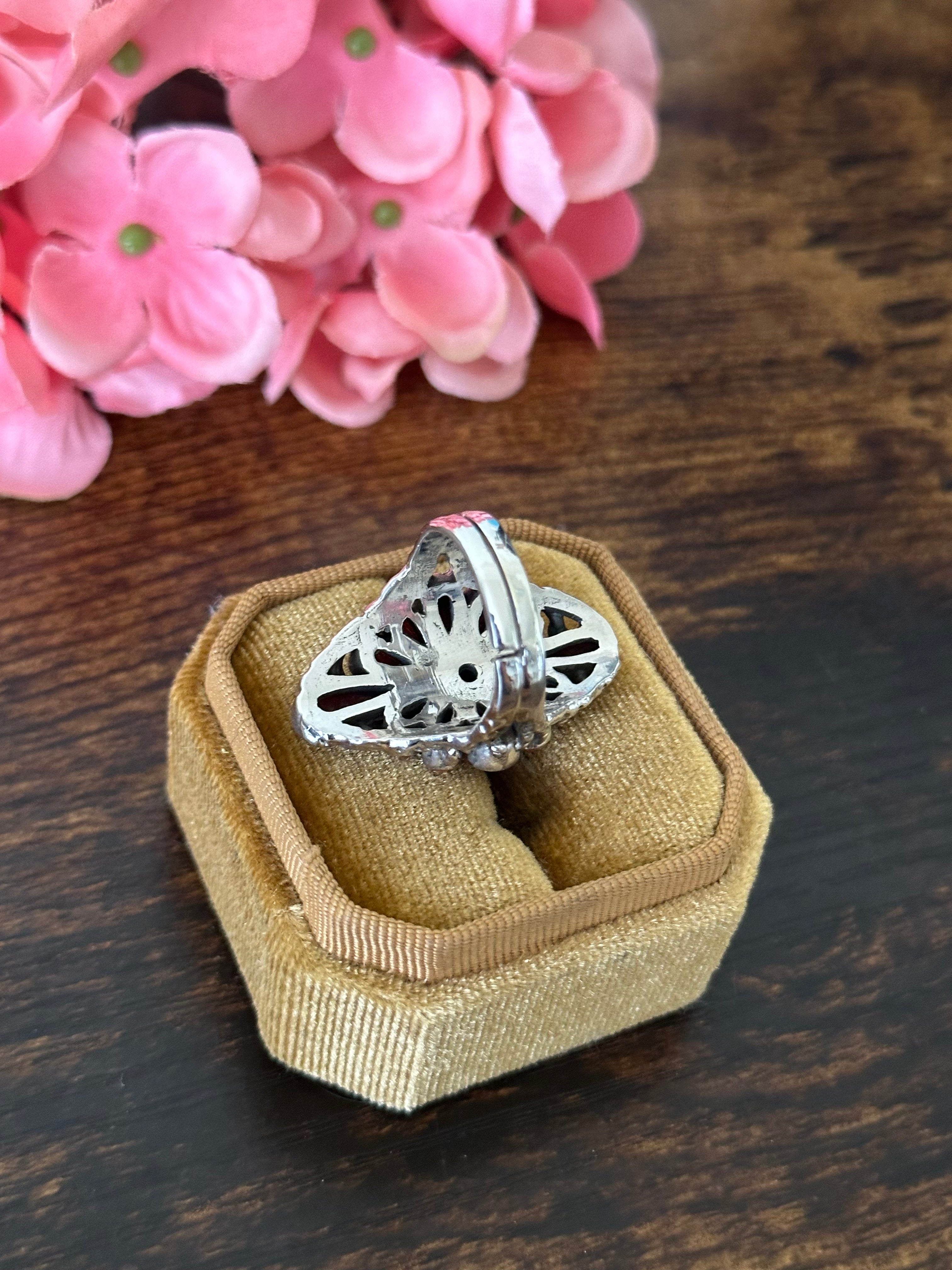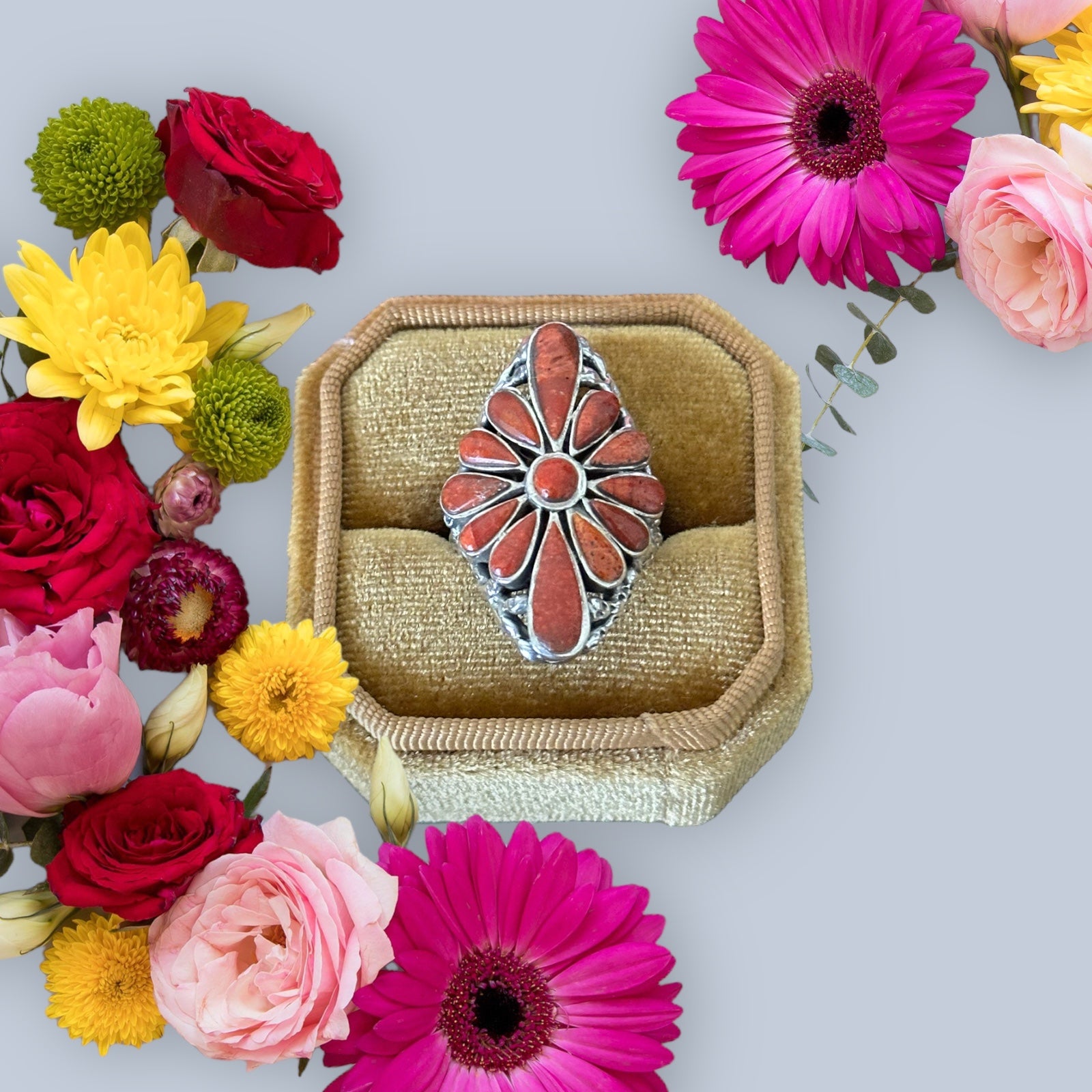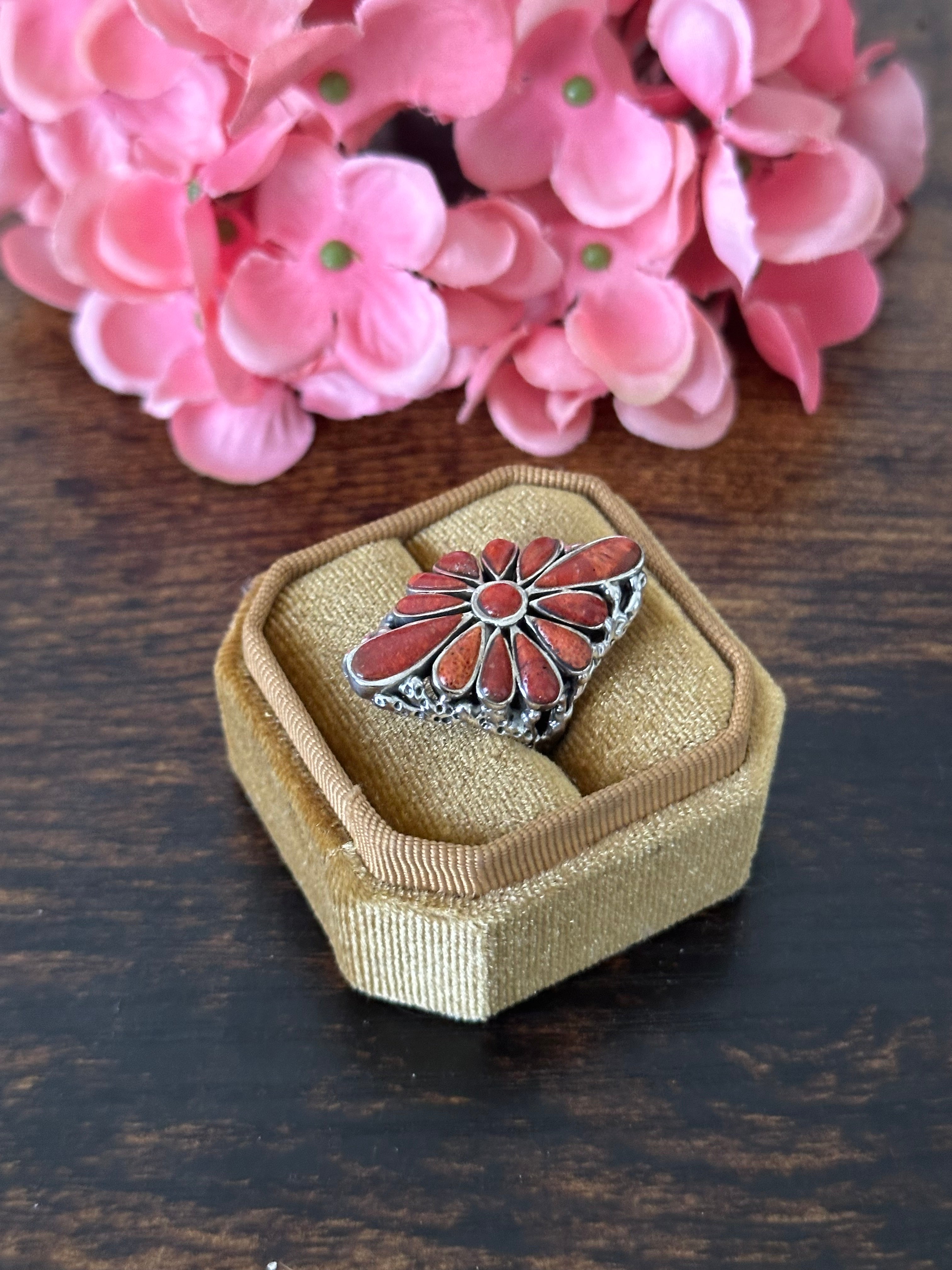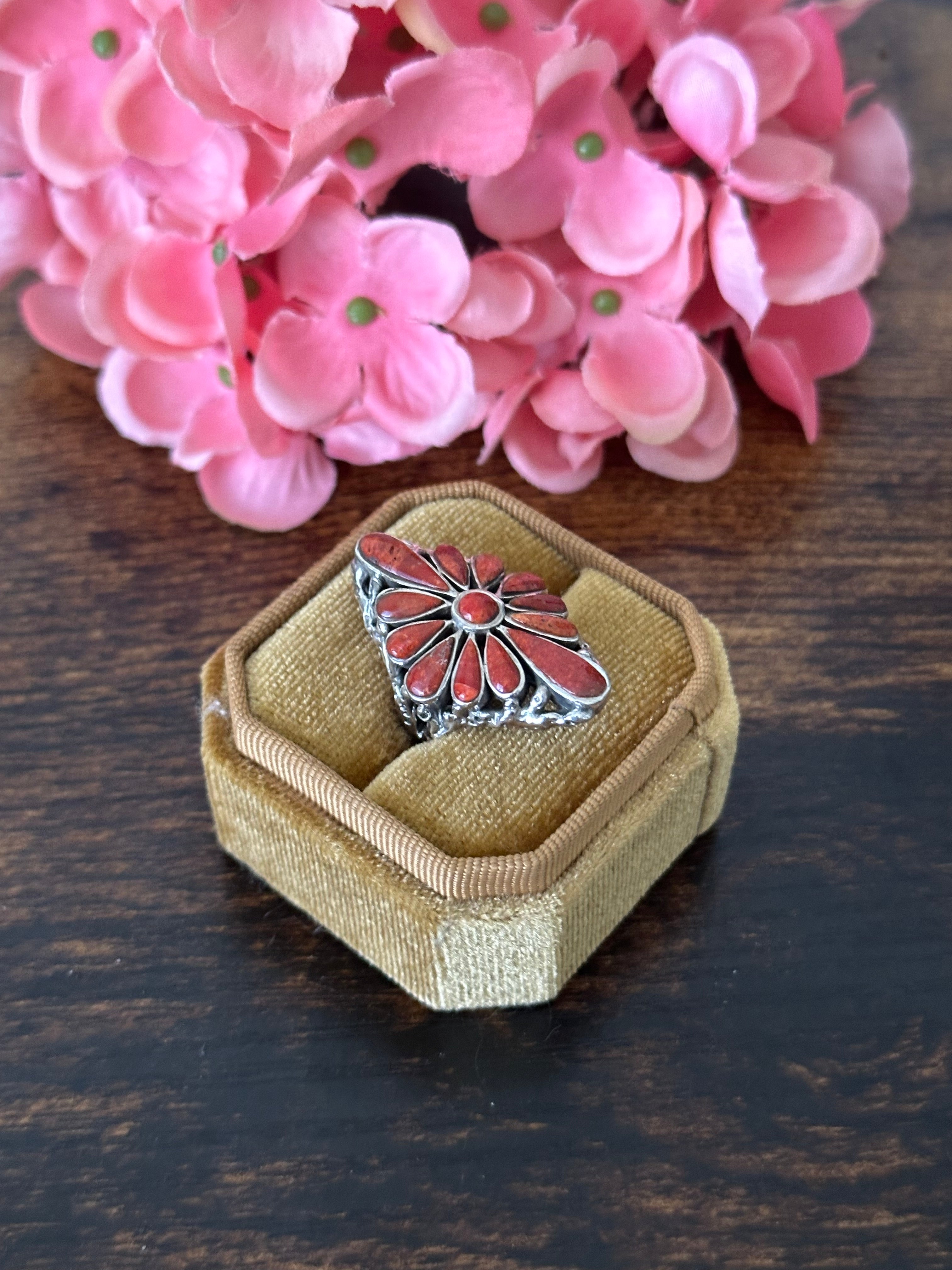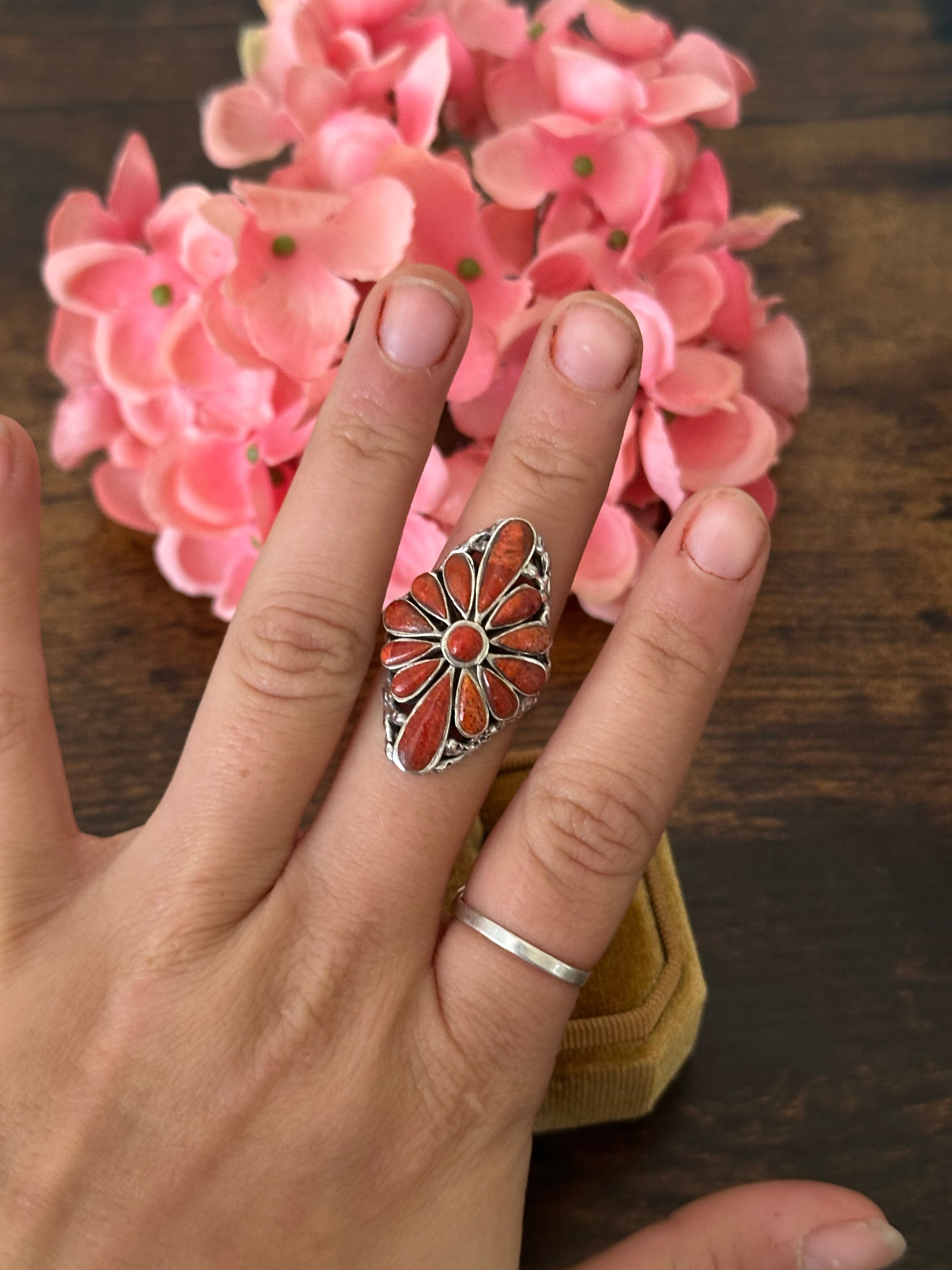 Beautiful ring. Southwest Handmade Red Coral & Sterling Silver Cluster Adjustable Ring. It measures 1 1/4 inches long and 7/8 of an inches wide. Signed by the artist and stamped sterling silver. Stones will differ due to natural stones.