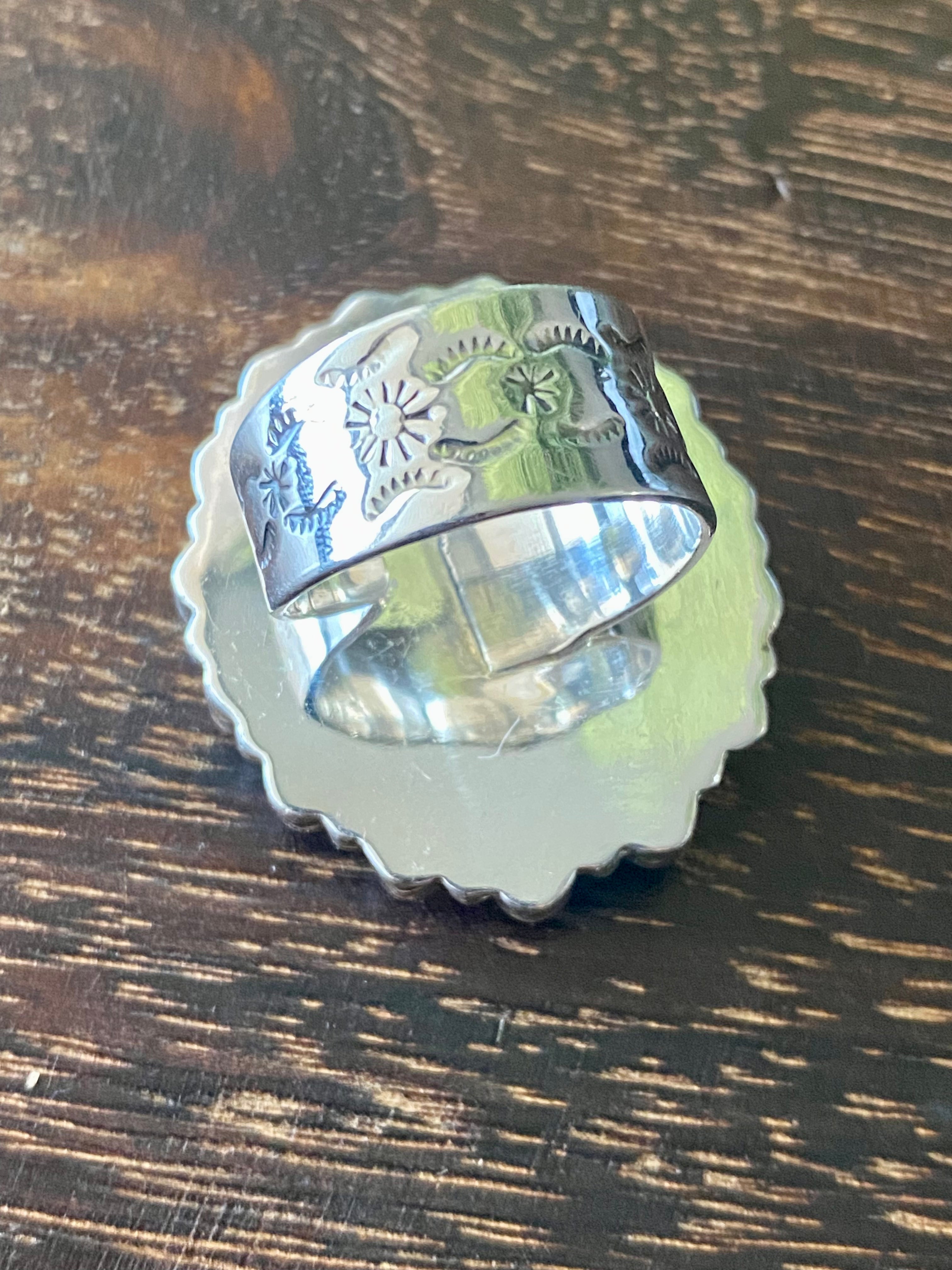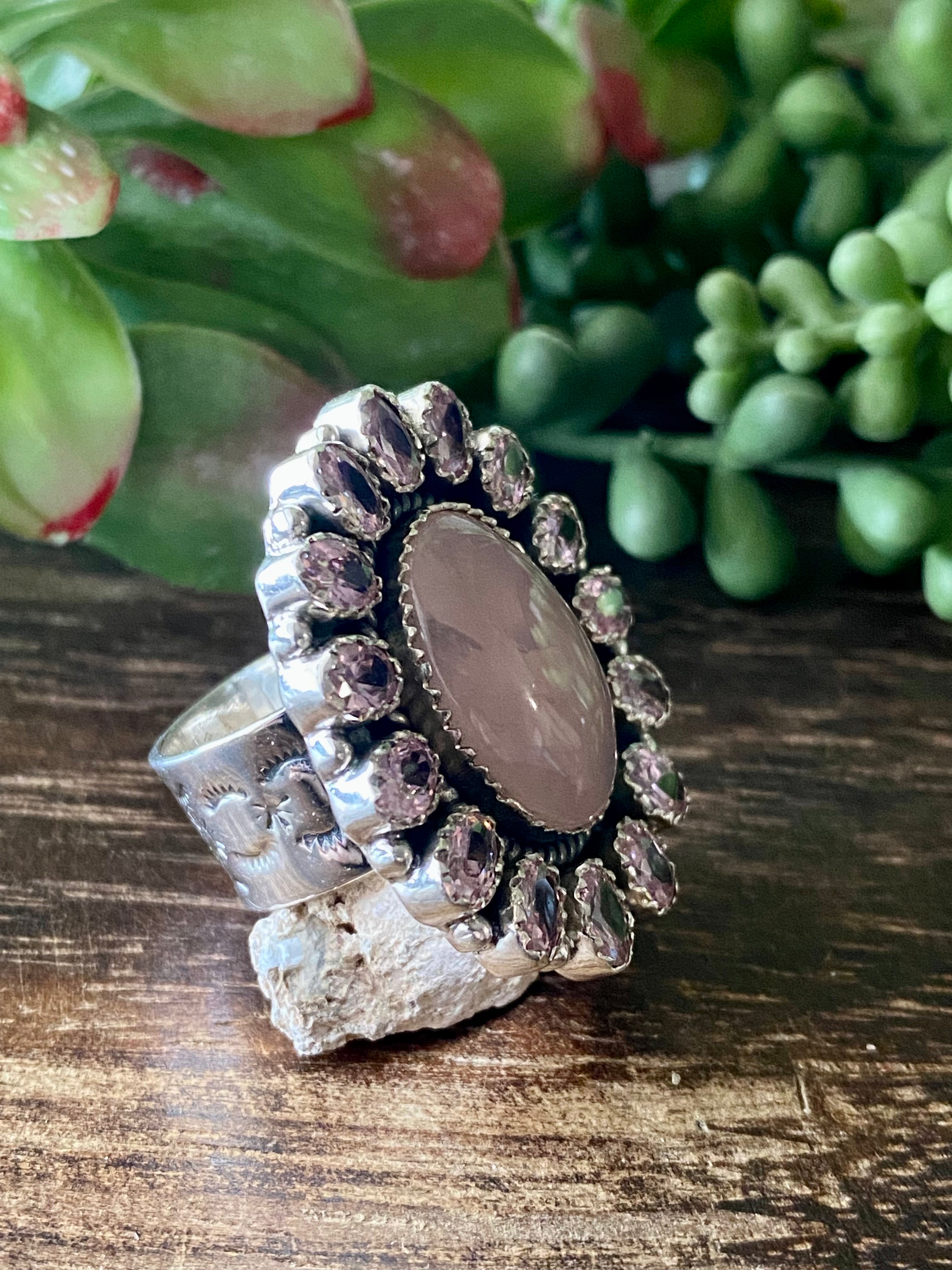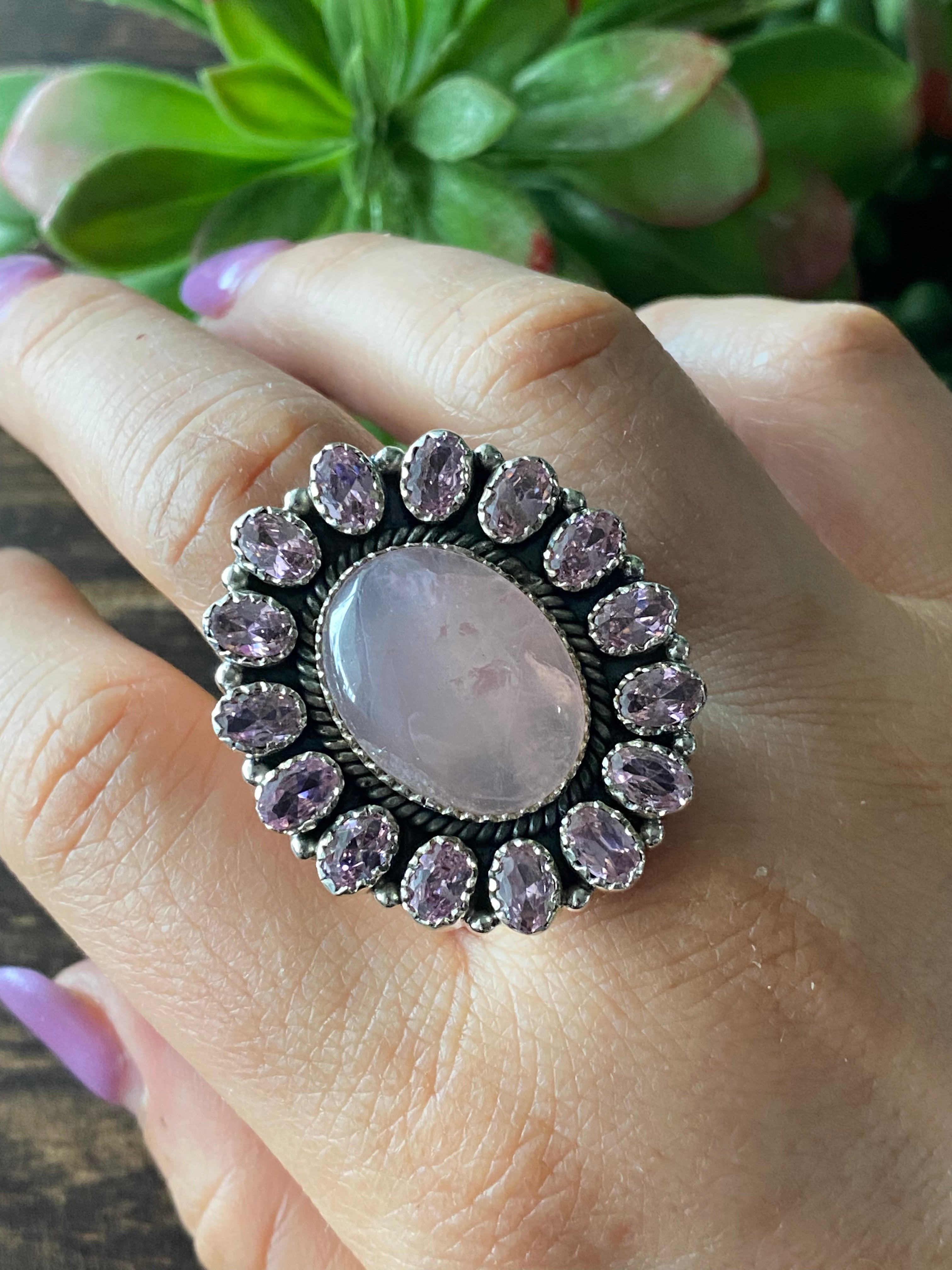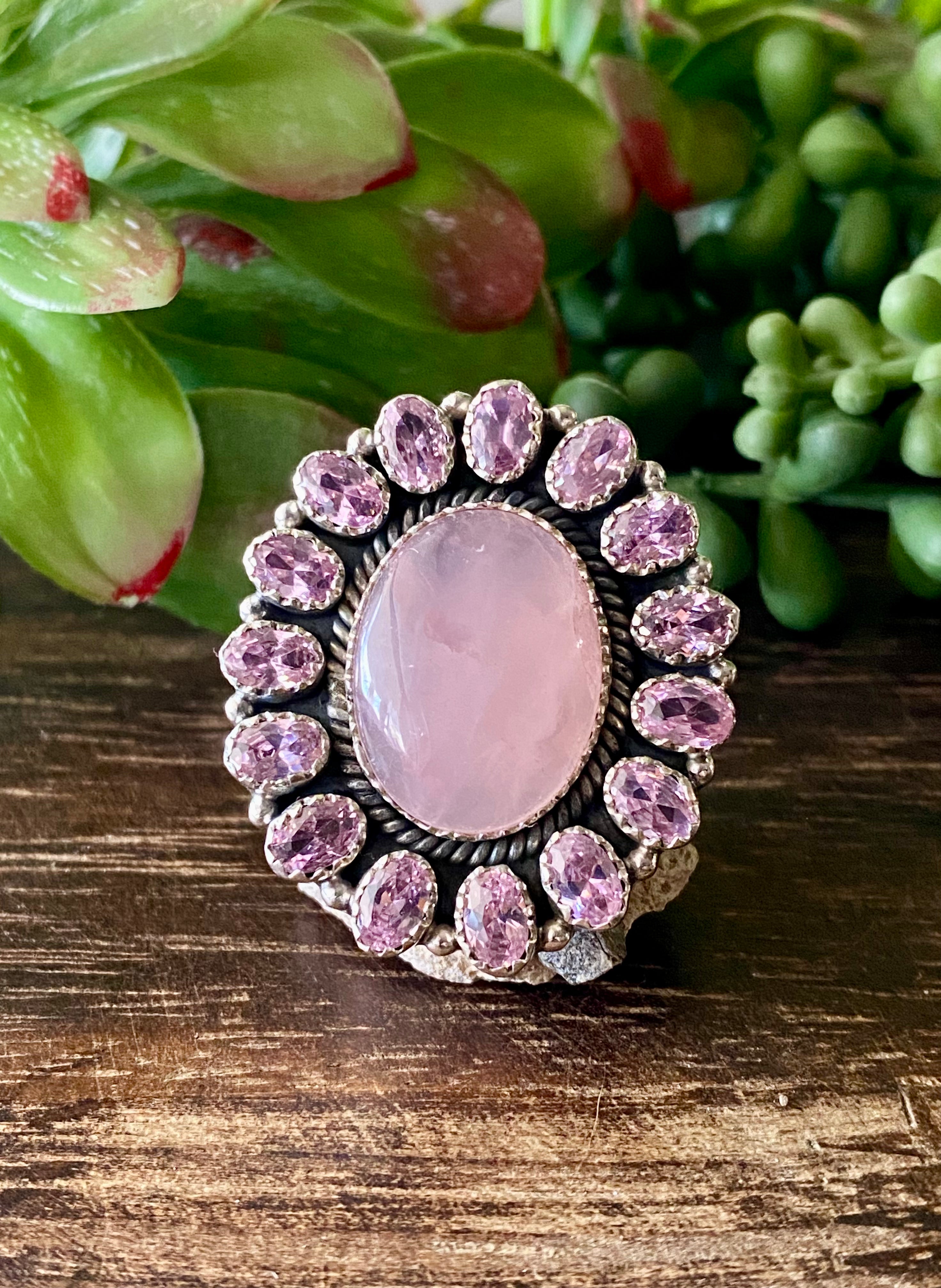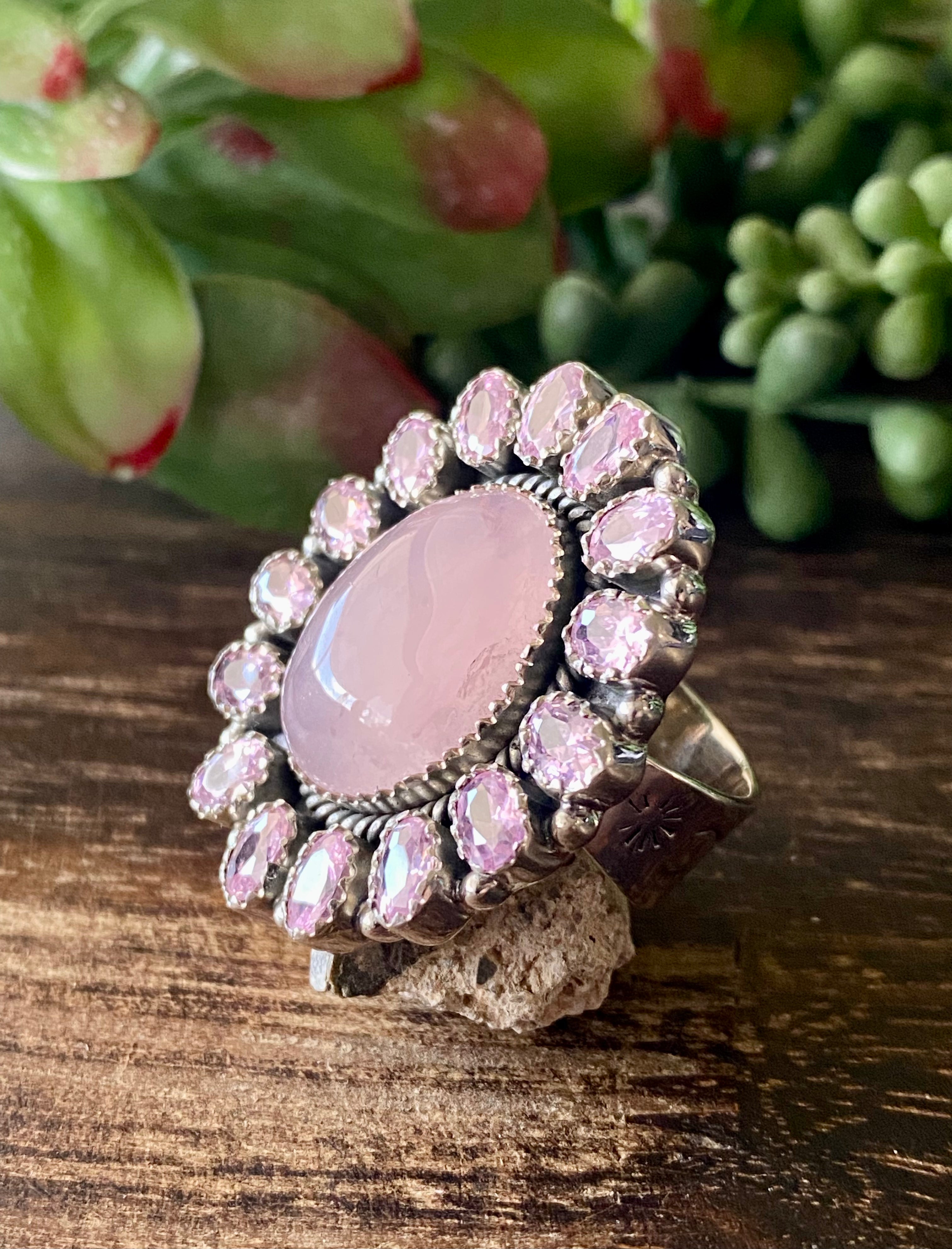 Southwest Handmade Rose Quartz & Tourmaline Sterling Silver Cluster Adjustable Ring Size 5.5