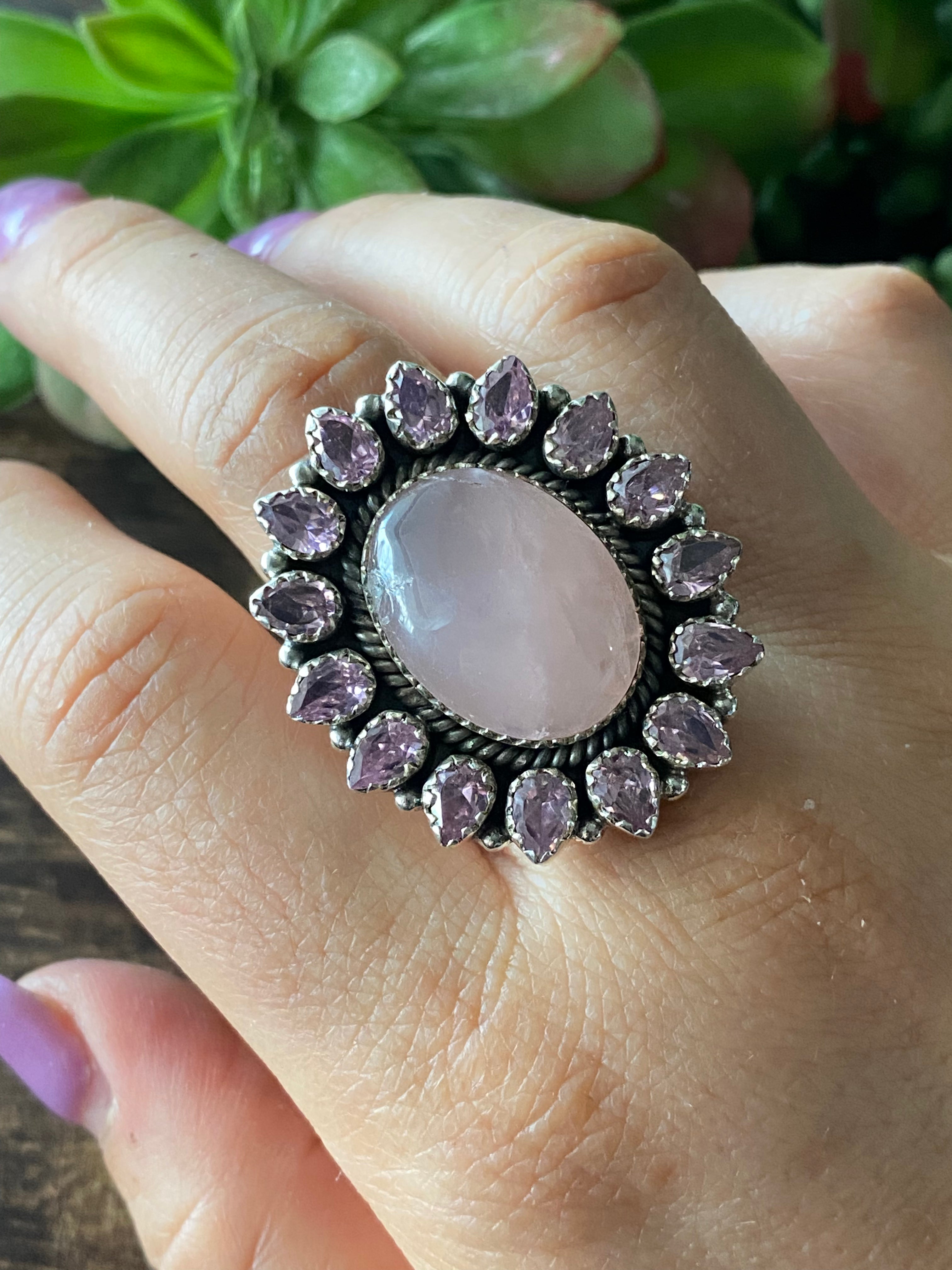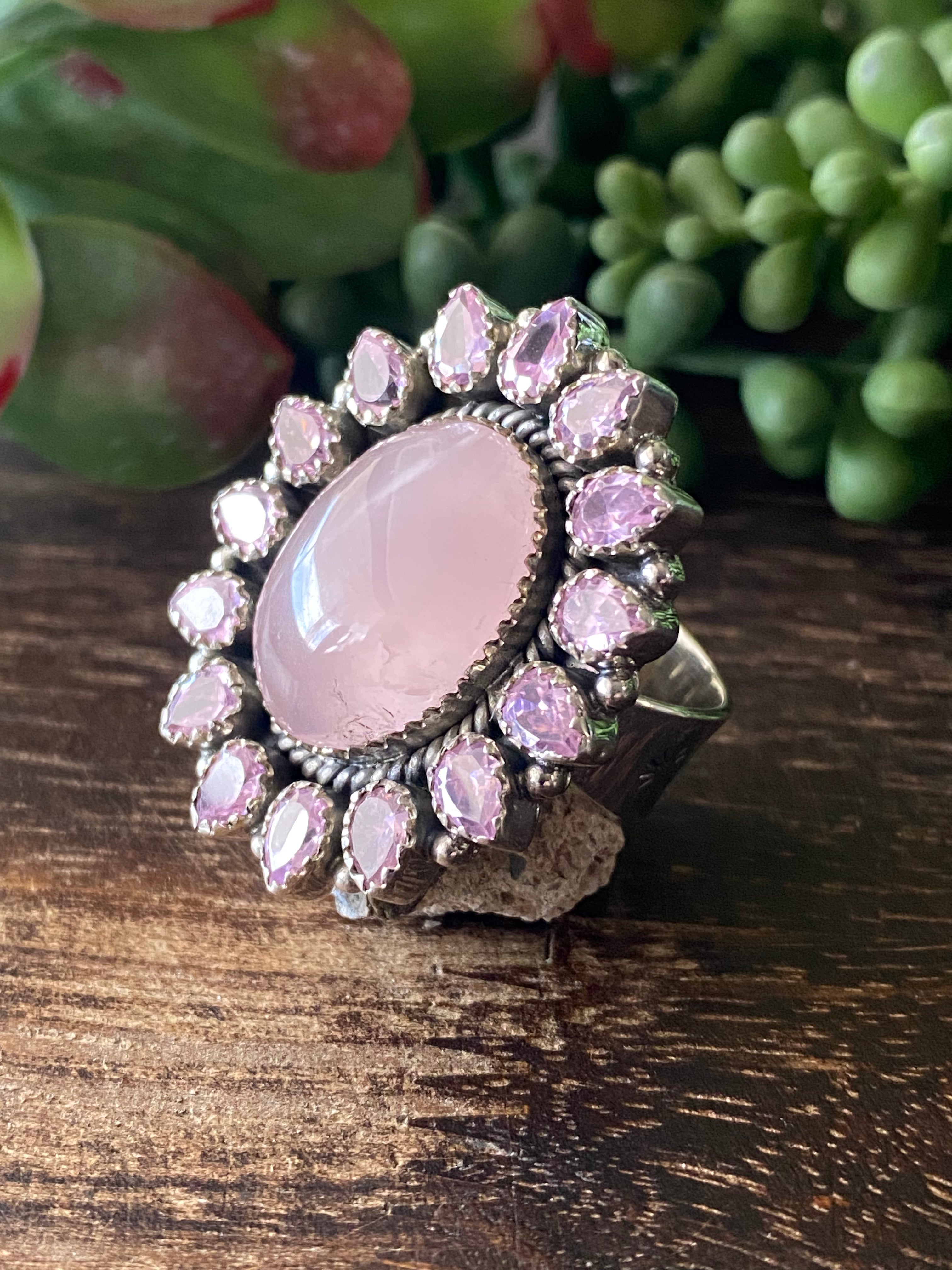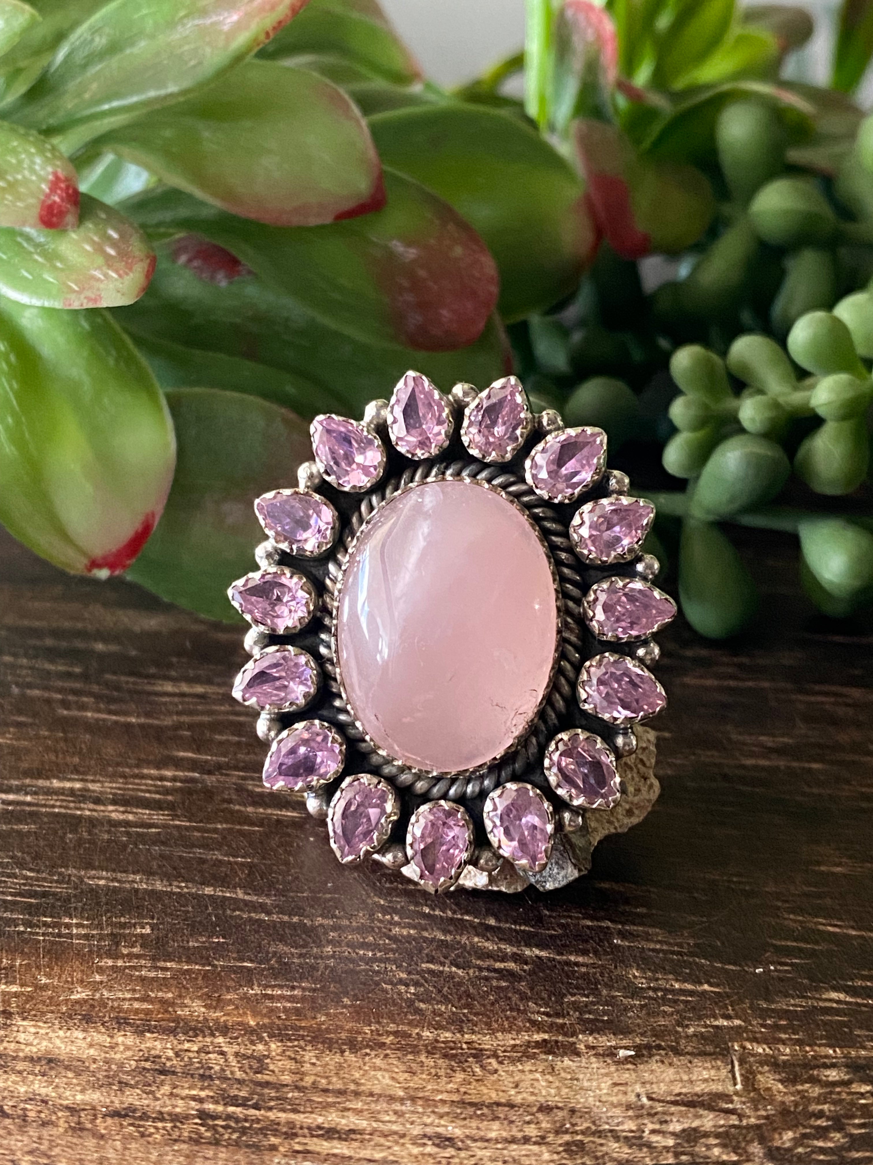 Southwest Handmade Rose Quartz & Tourmaline Sterling Silver Cluster Adjustable Ring Size 8.5