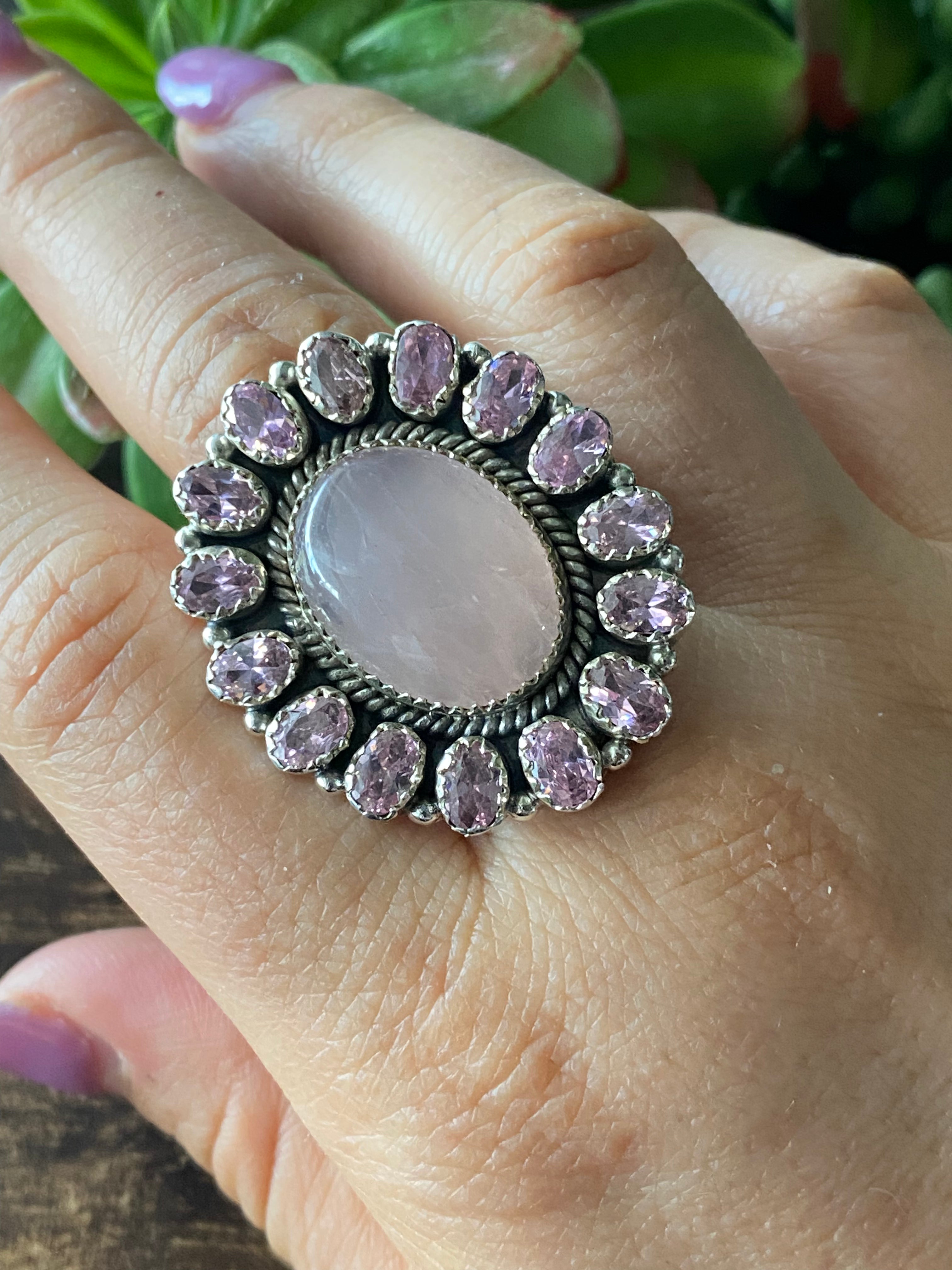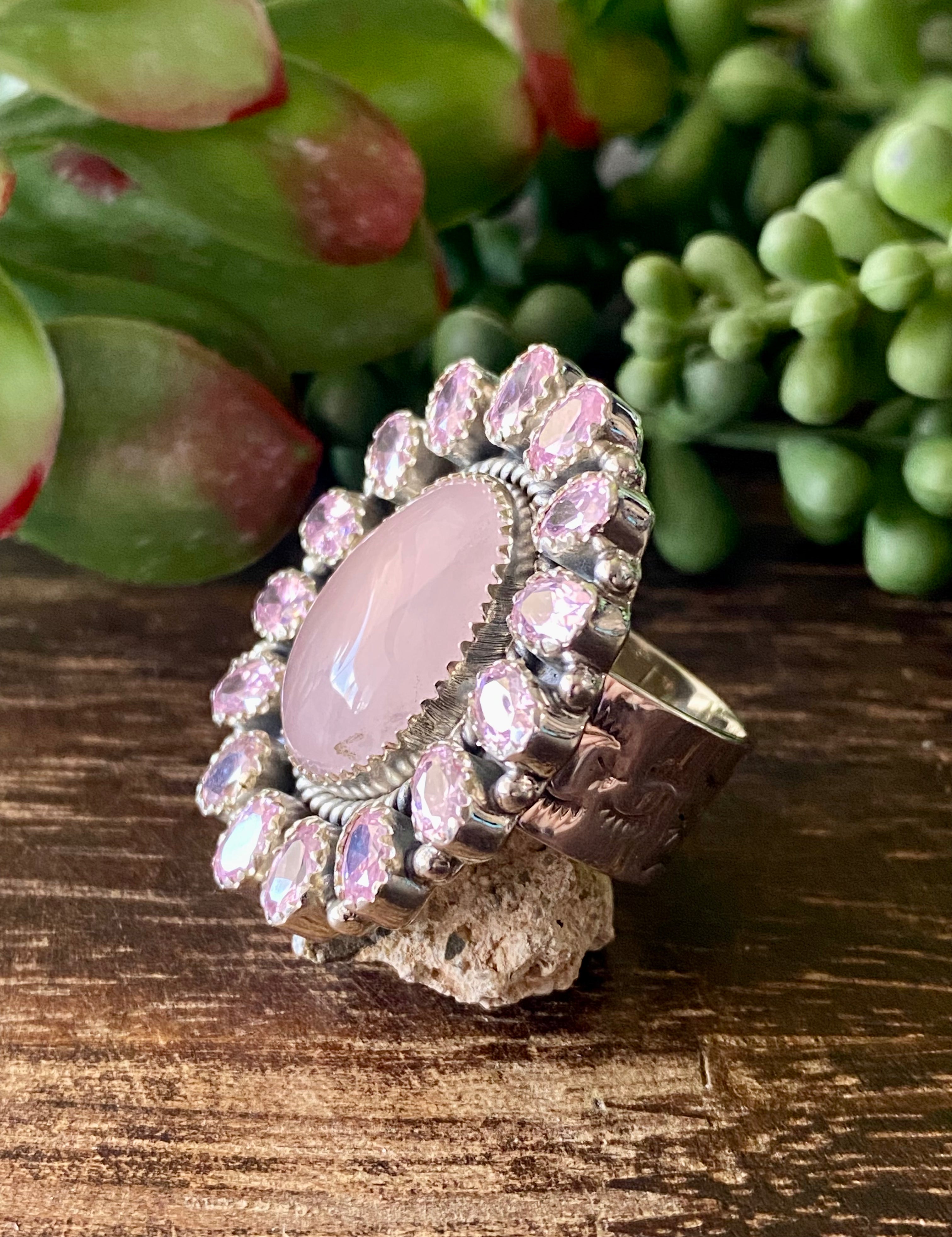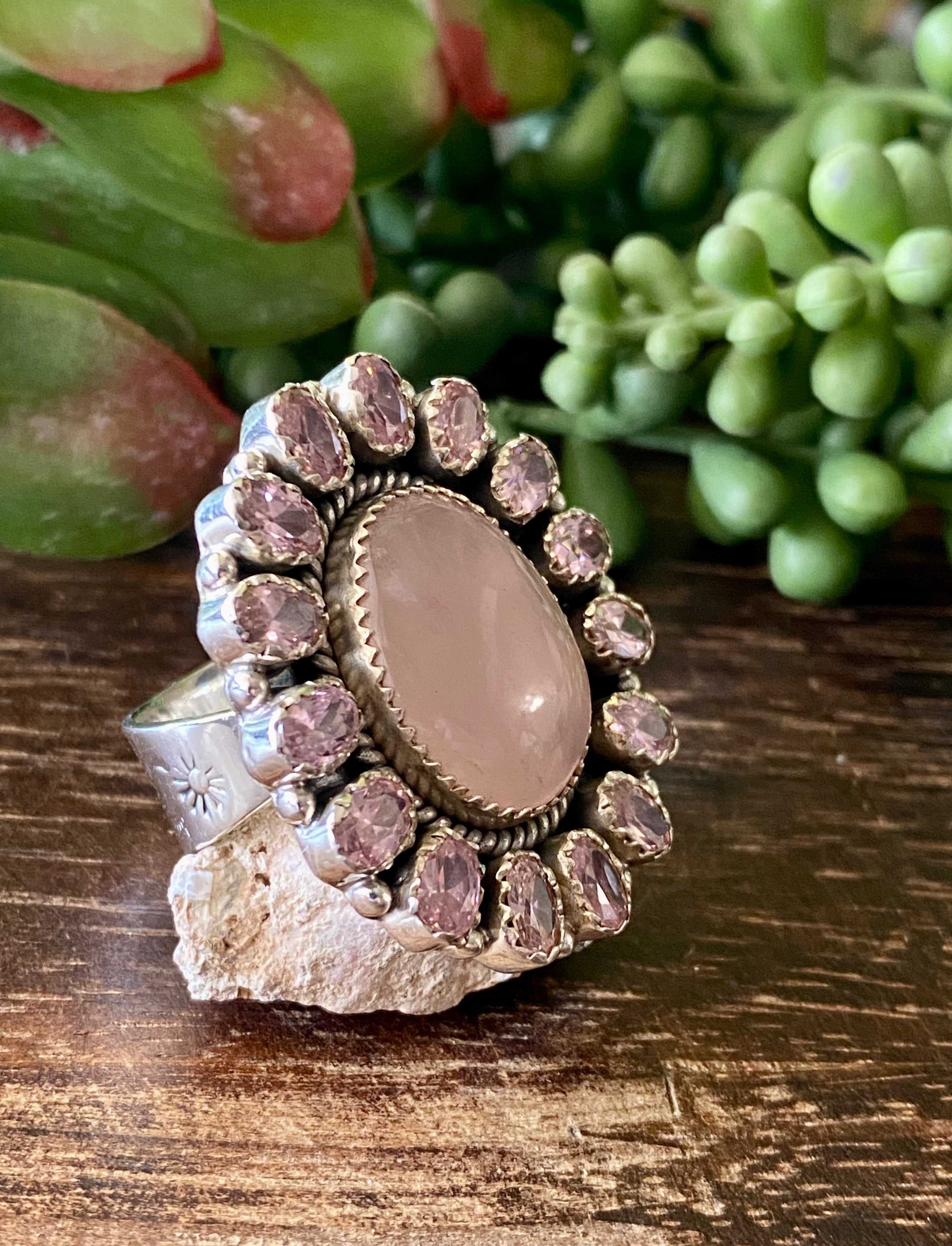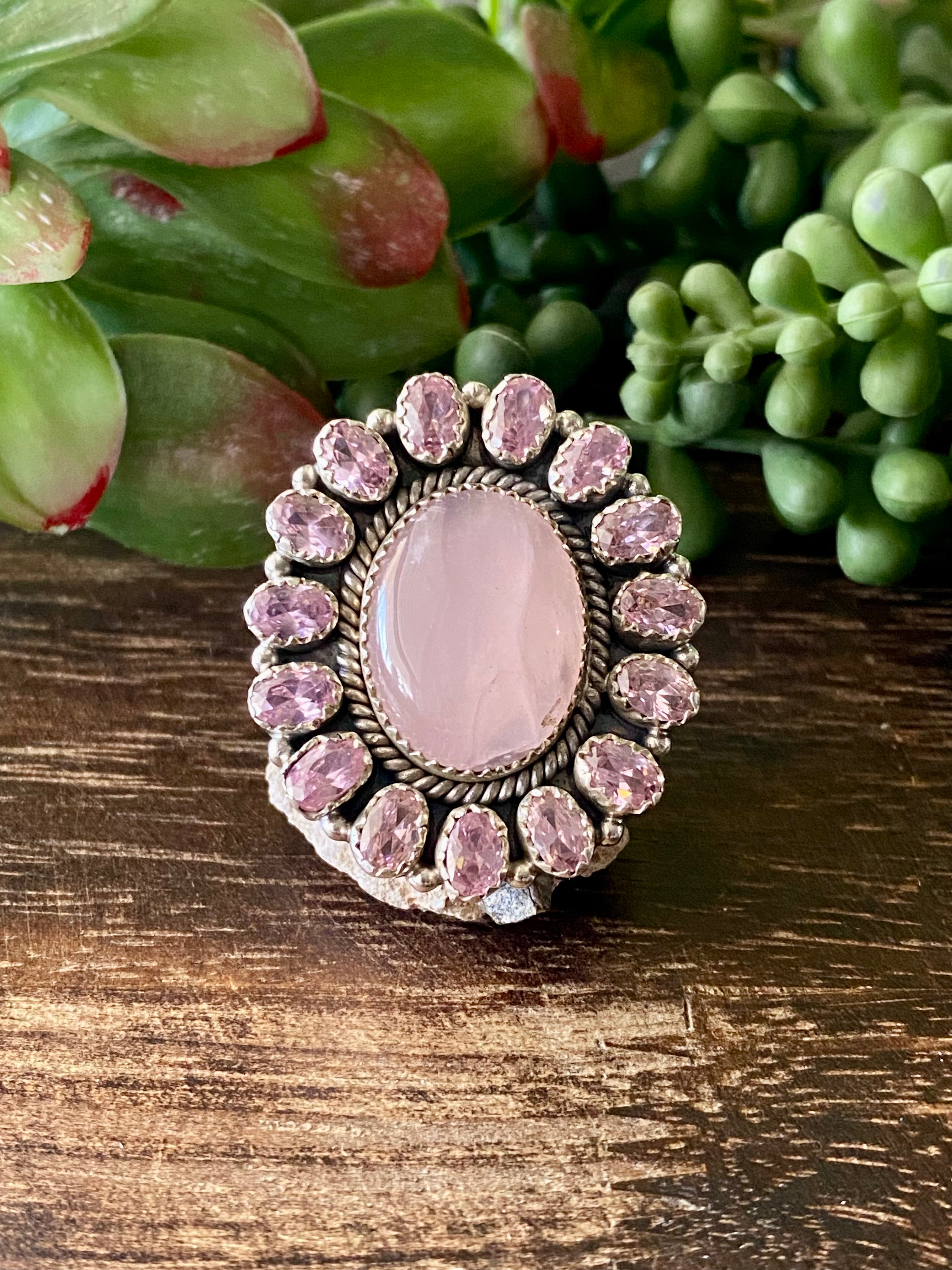 Southwest Handmade Rose Quartz & Tourmaline Sterling Silver Cluster Adjustable Ring Size 9