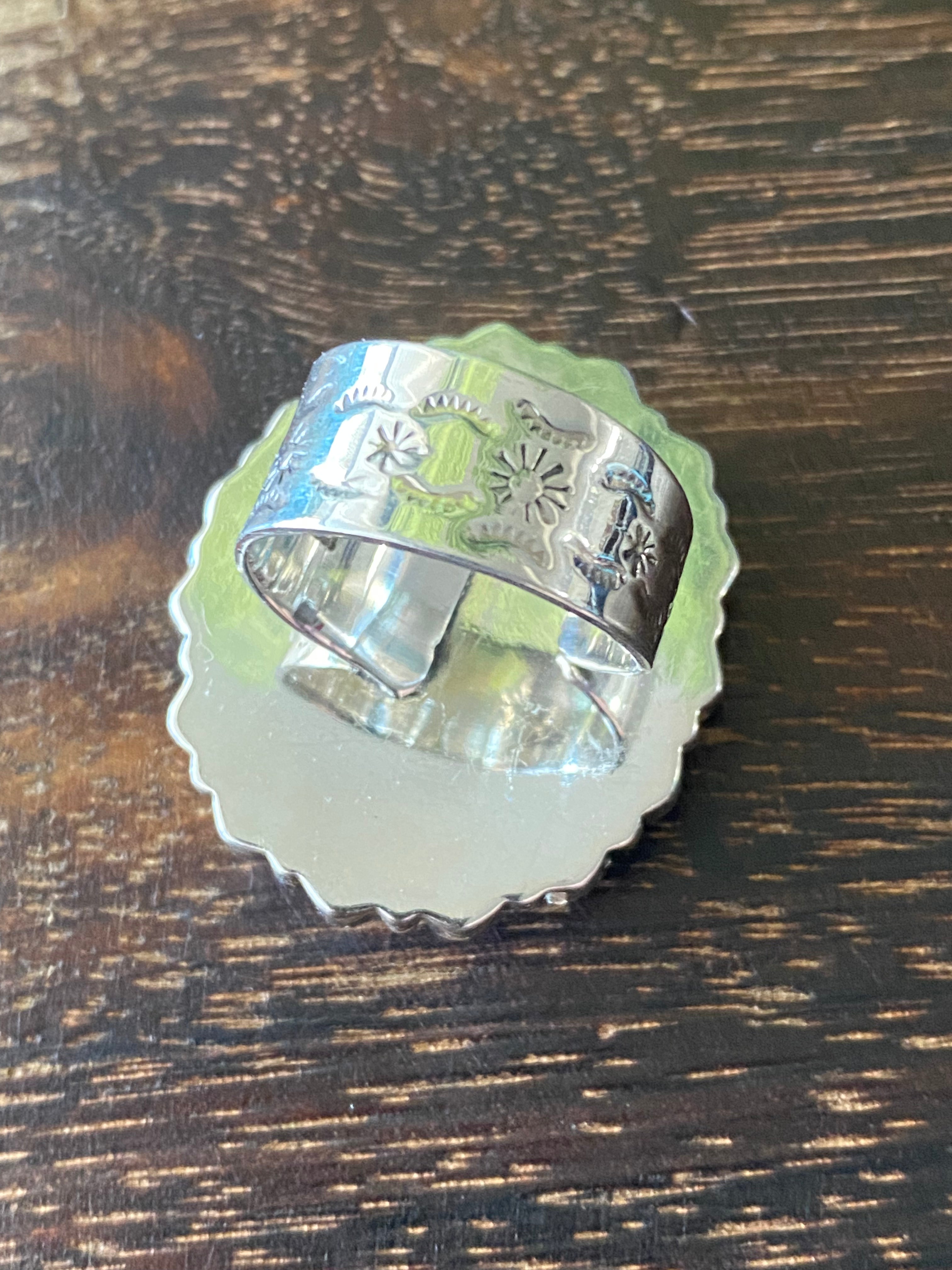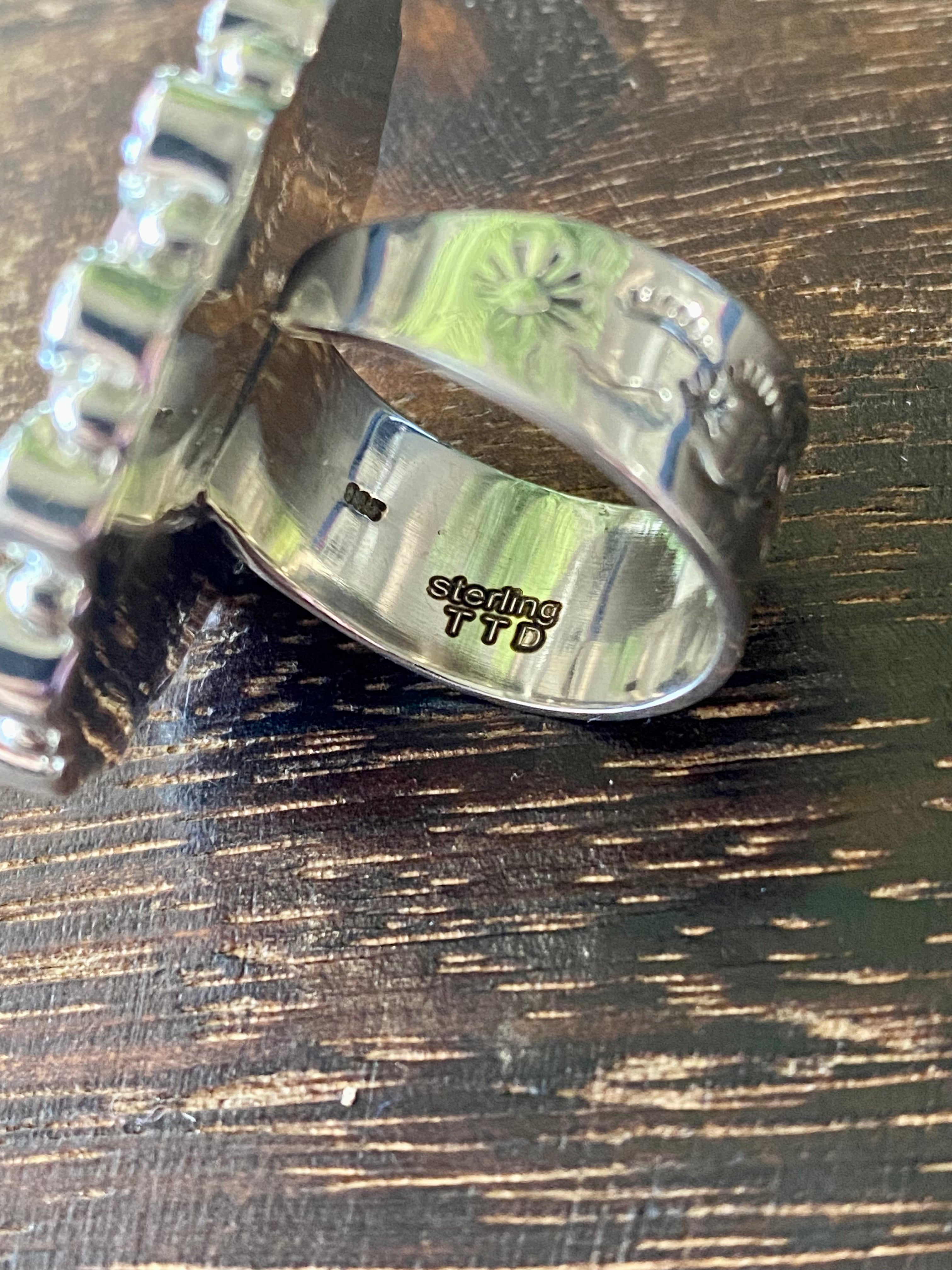 Southwest Handmade Rose Quartz & Tourmaline Sterling Silver Cluster Adjustable Ring Size 9. It measures 1 1/2 inches long and 1 1/4 inches wide. Signed by the artist and stamped sterling silver.