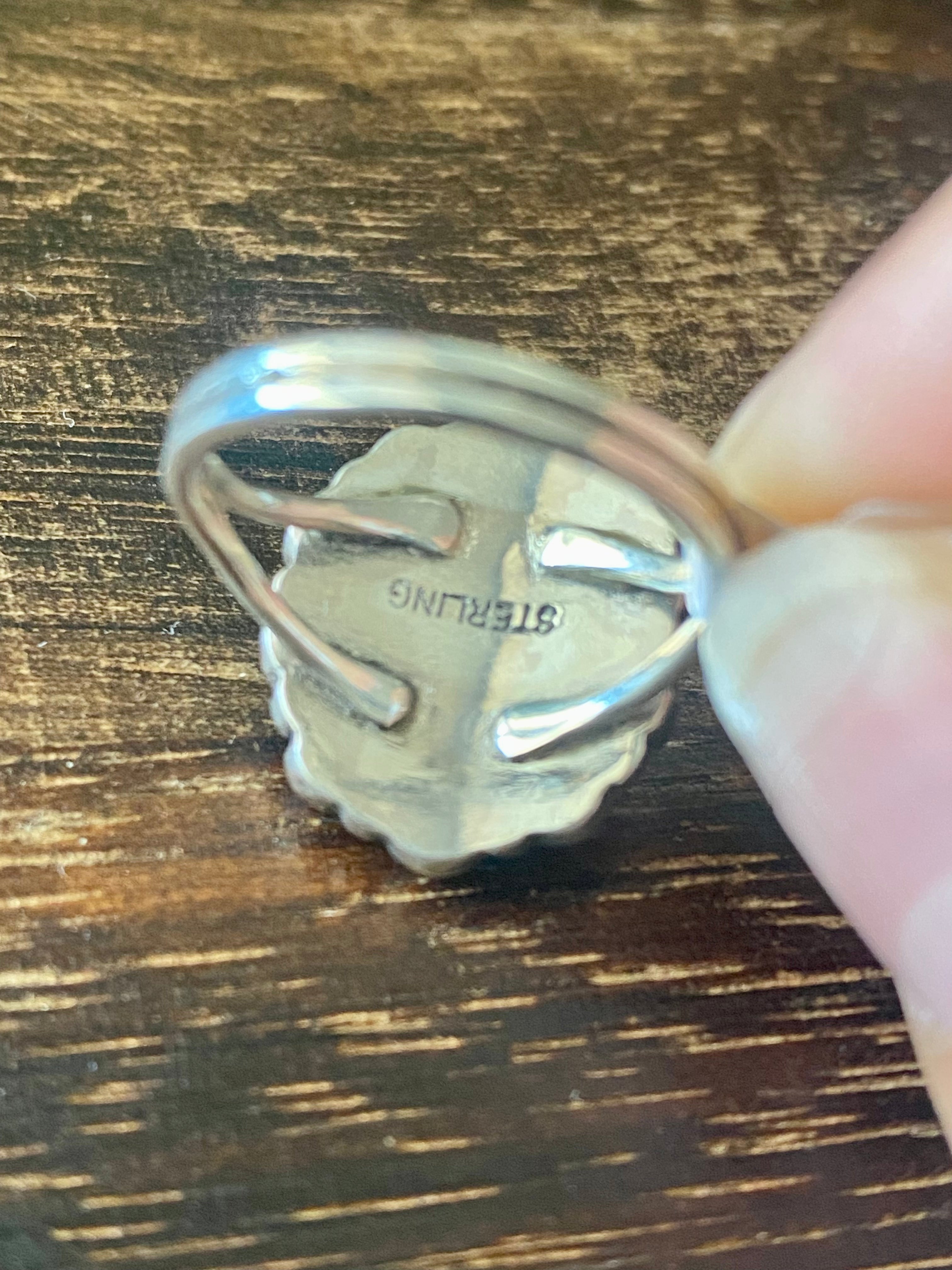 Southwest Handmade Sleeping Beauty Turquoise & Sterling Silver Ring Size 7. It measures 3/4 of an inch long and just over 5/8 of an inch wide. Stamped sterling silver.