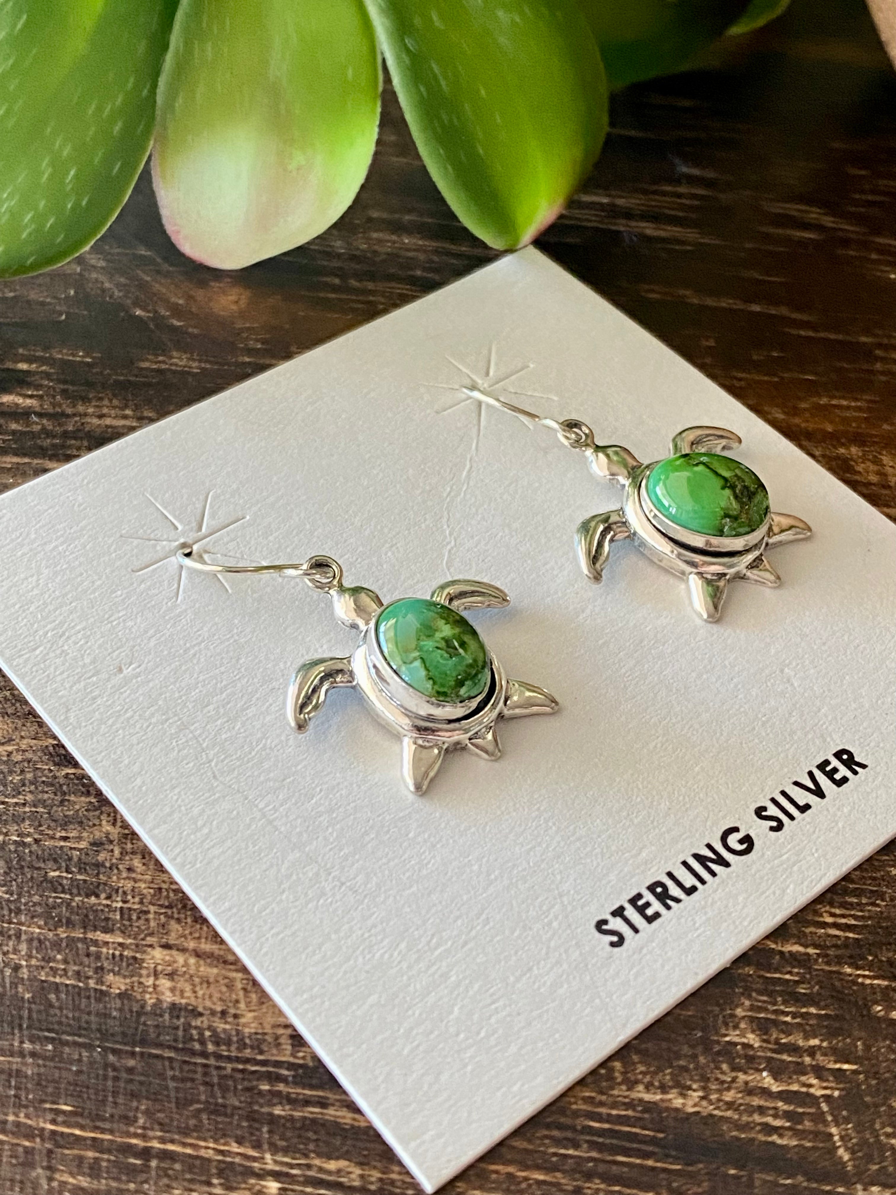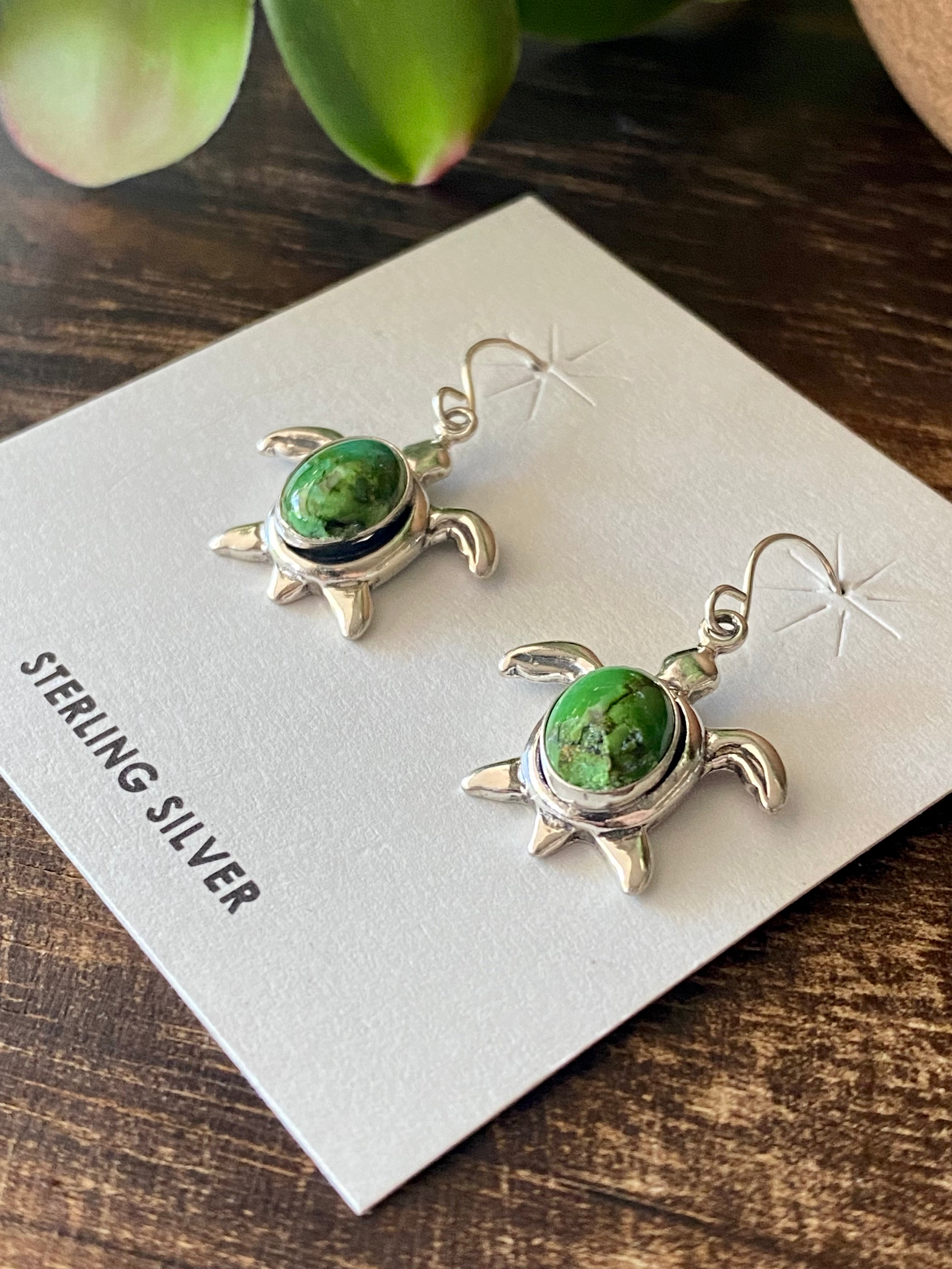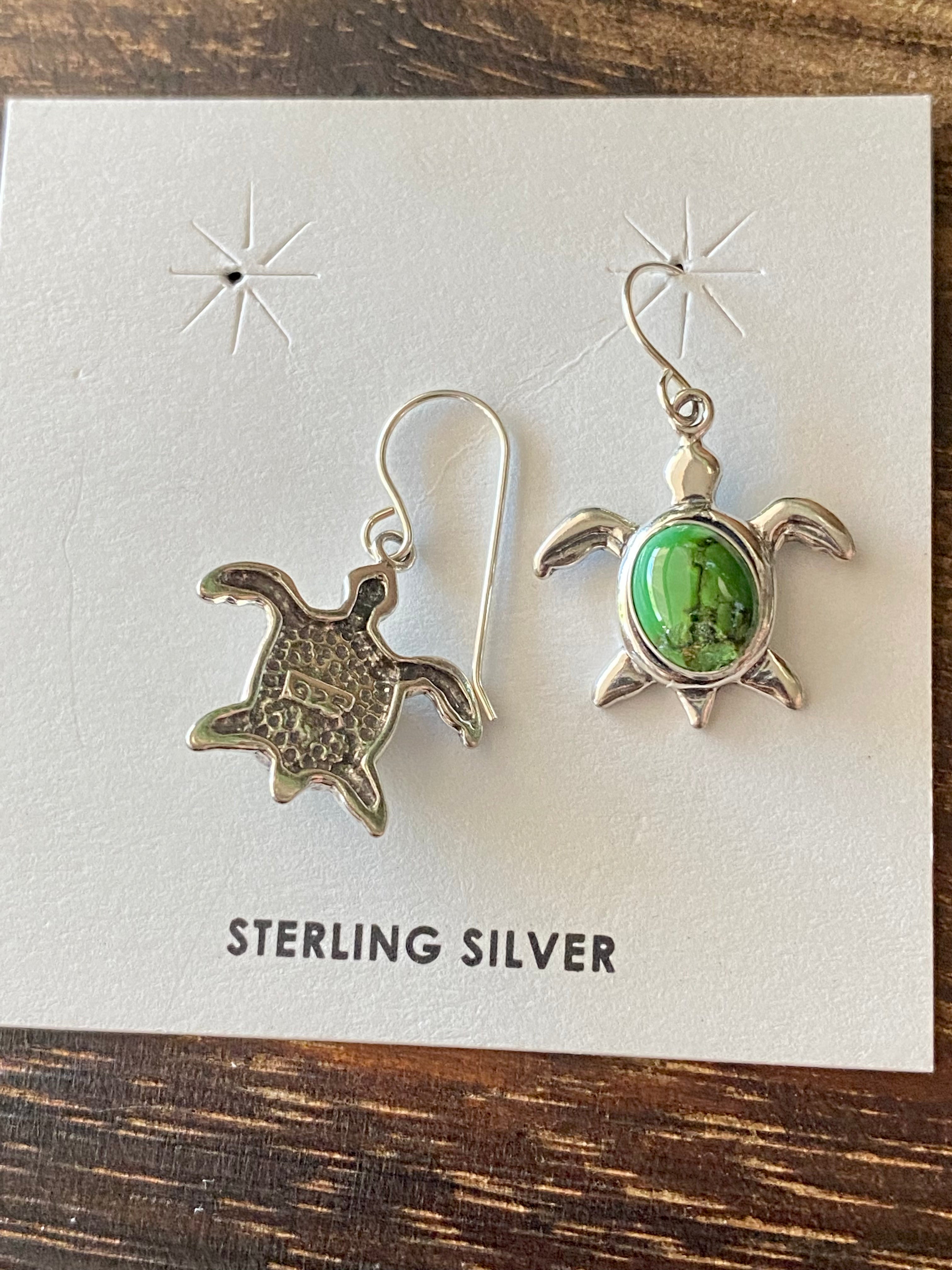 Southwest Handmade Sonoran Gold Turquoise & Sterling Silver Turtle Dangle Earrings. They measure 1 1/4 inches long and 3/4 of an inch wide. Stamped sterling silver. Stones will differ due to natural stones.