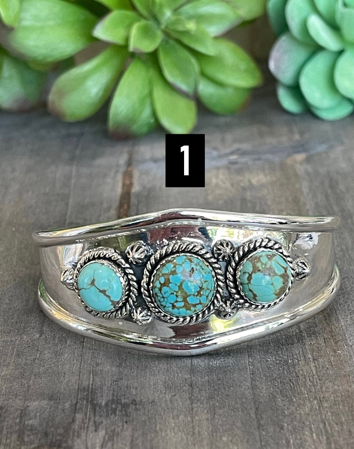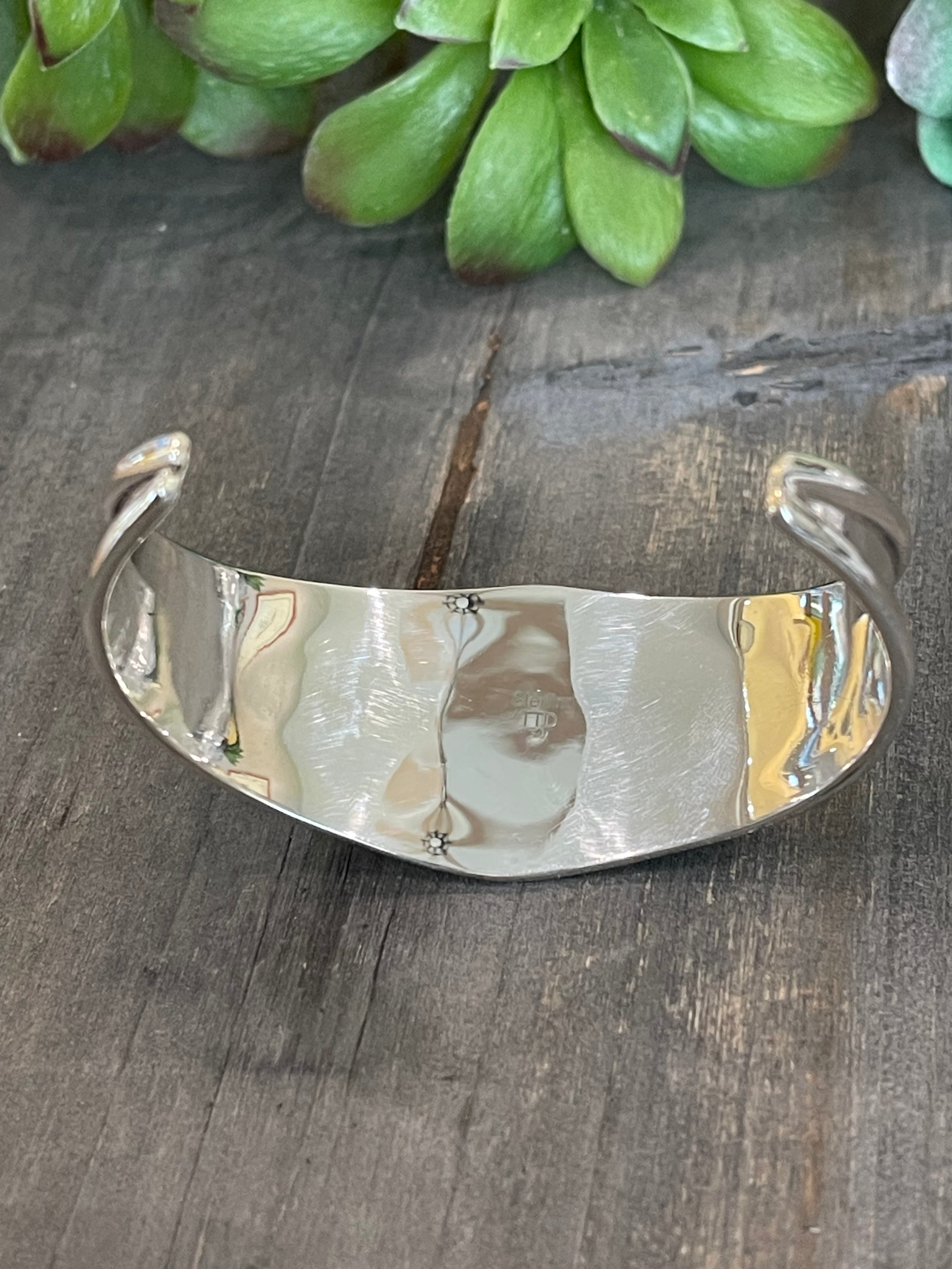 Southwest Made Number 8 Turquoise & Sterling Silver Cuff Bracelet. It measures 1 1/8 inches wide with an inside circumference of 5 1/4 inches and a gap of 1 5/8 inches. Signed by artist and stamped sterling silver. Cuff has flex to it.