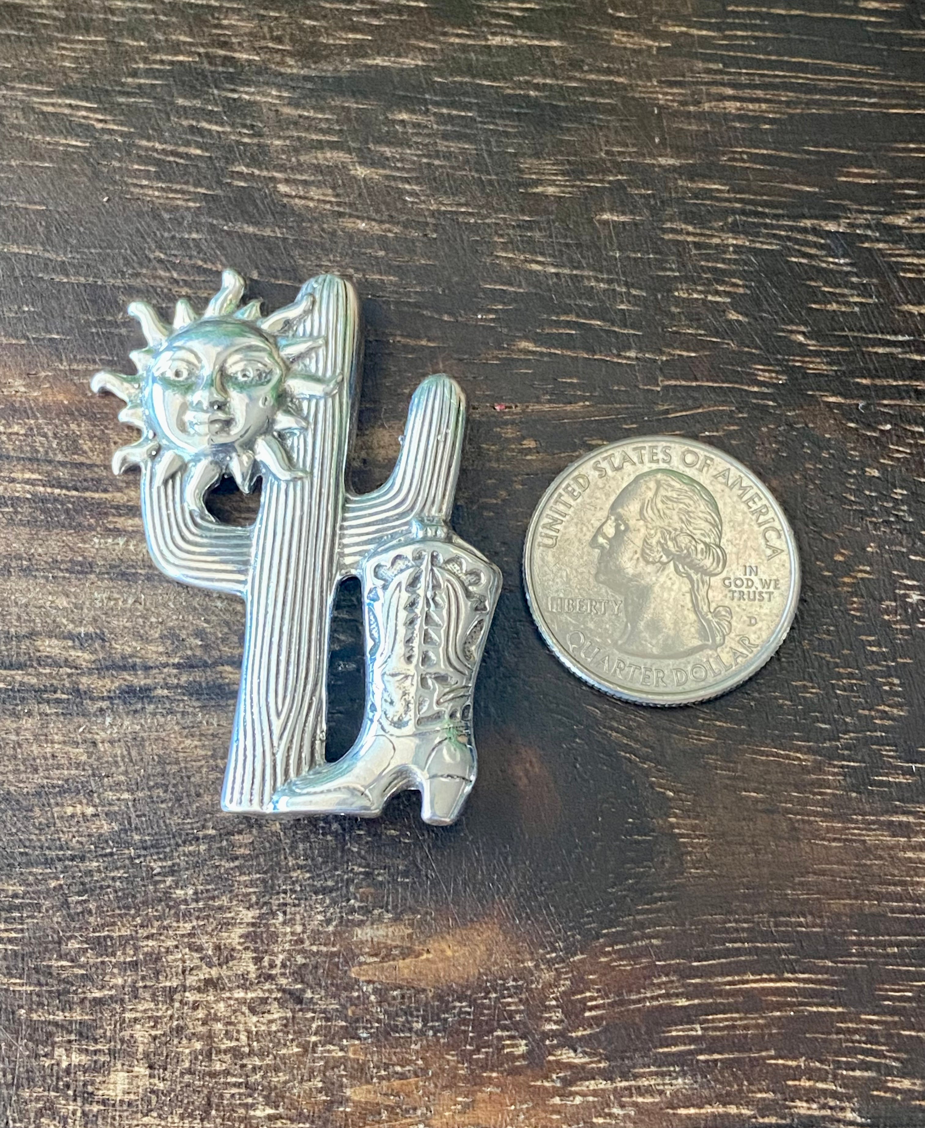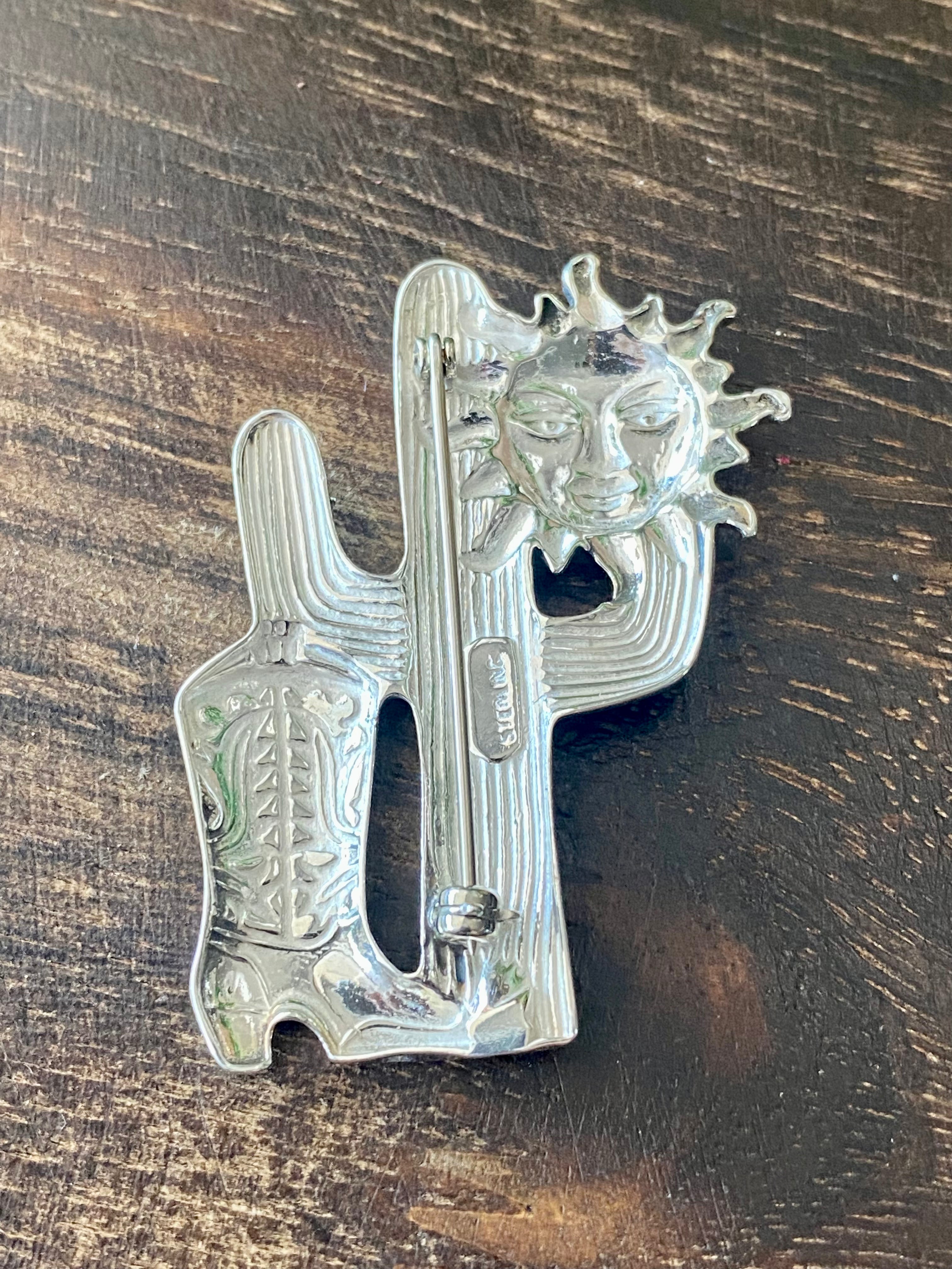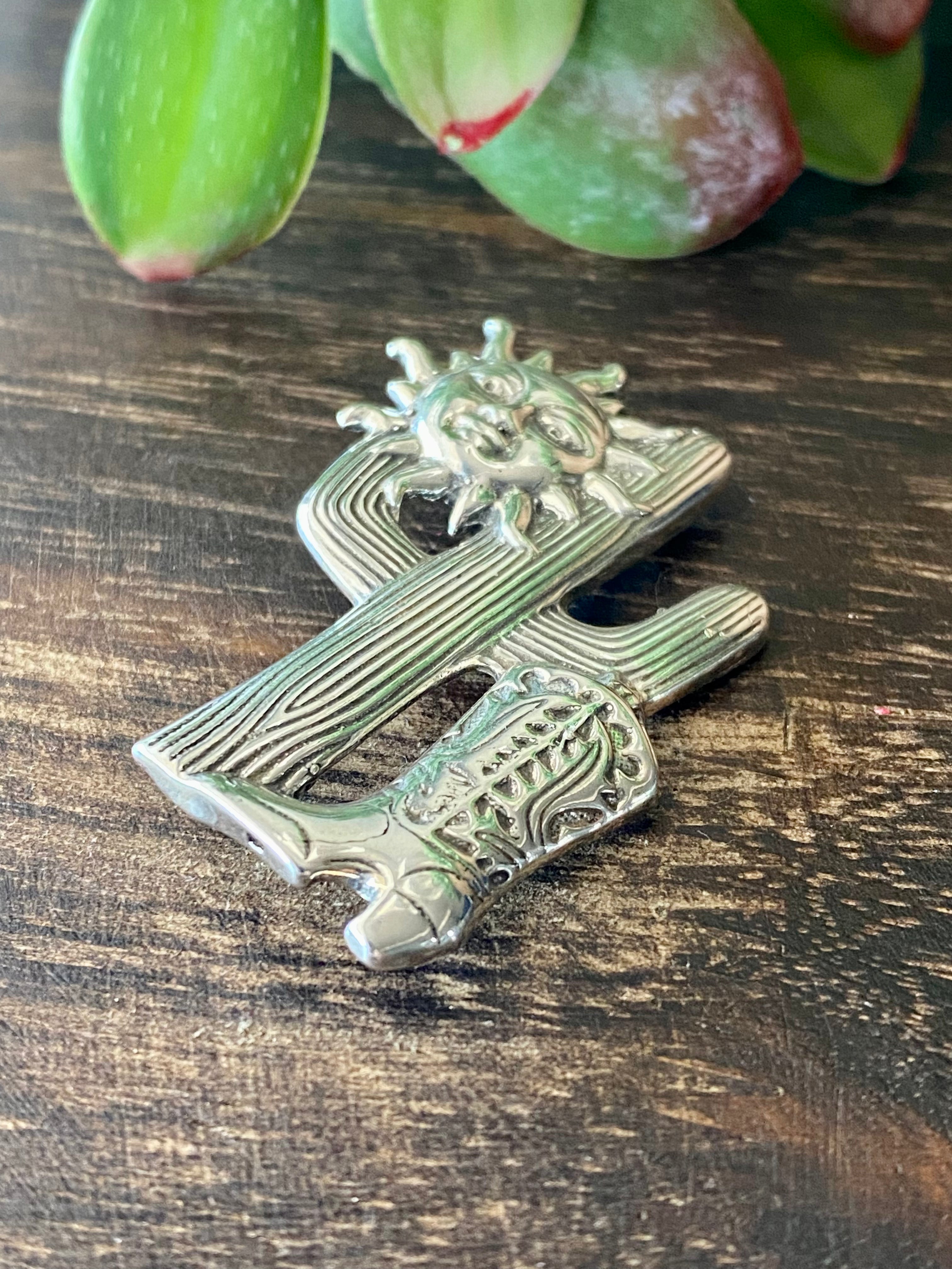 Southwest Handmade Sterling Silver Sahuaro Pin. It measures 1 7/8 inches long and 1 1/2 inches wide. Stamped sterling silver.