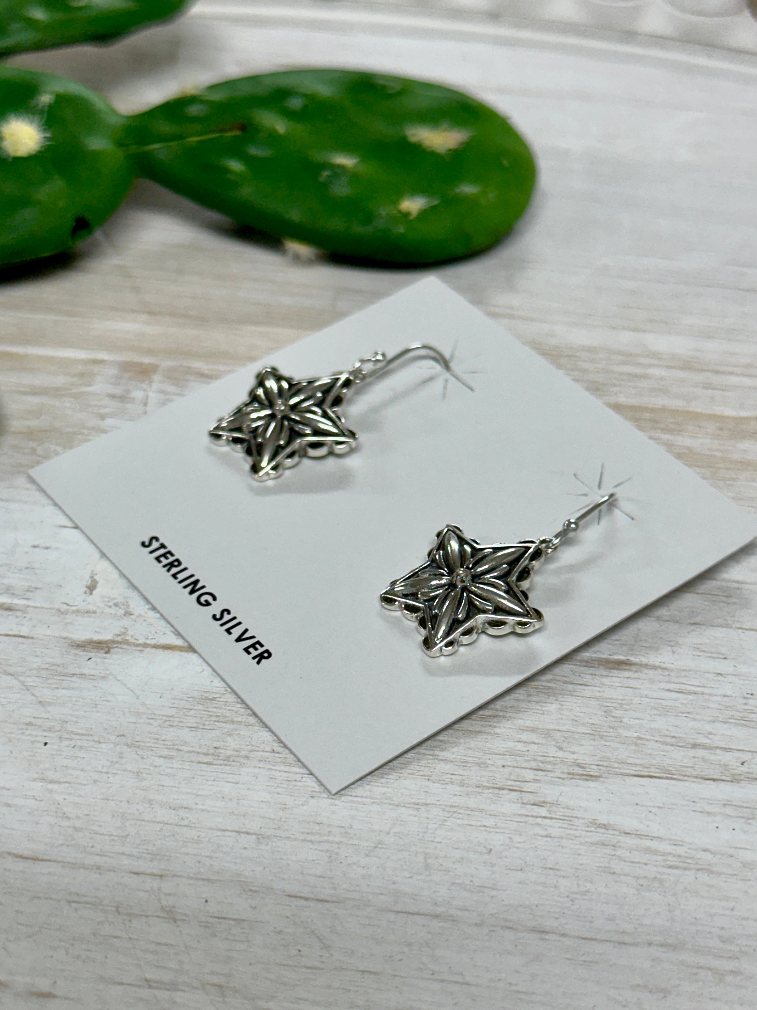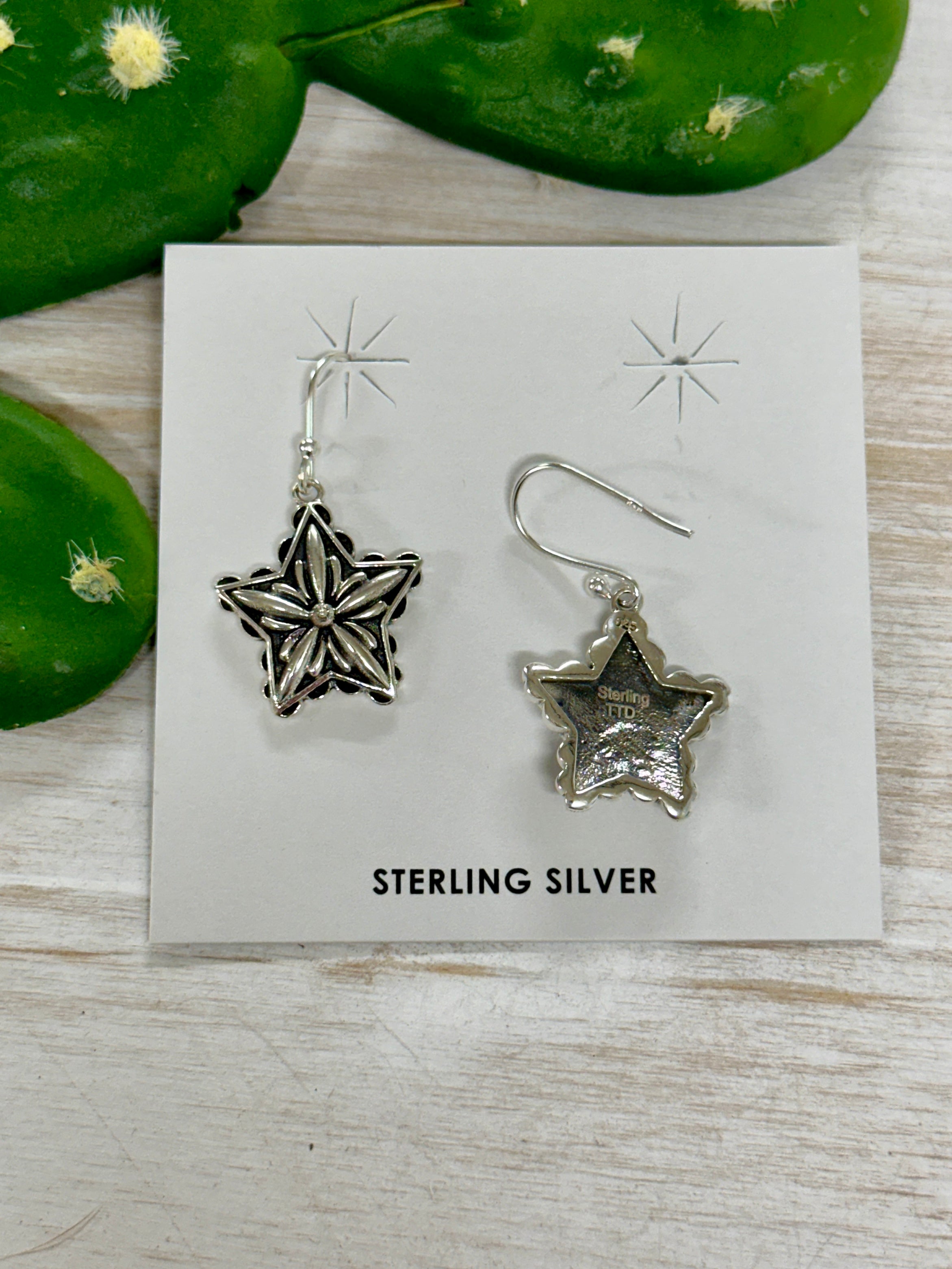 Southwest Handmade Sterling Silver Star Dangles Earrings. They measure 1 1/4 inches long and 3/4 of an inch wide. Signed by the artist and stamped sterling silver.