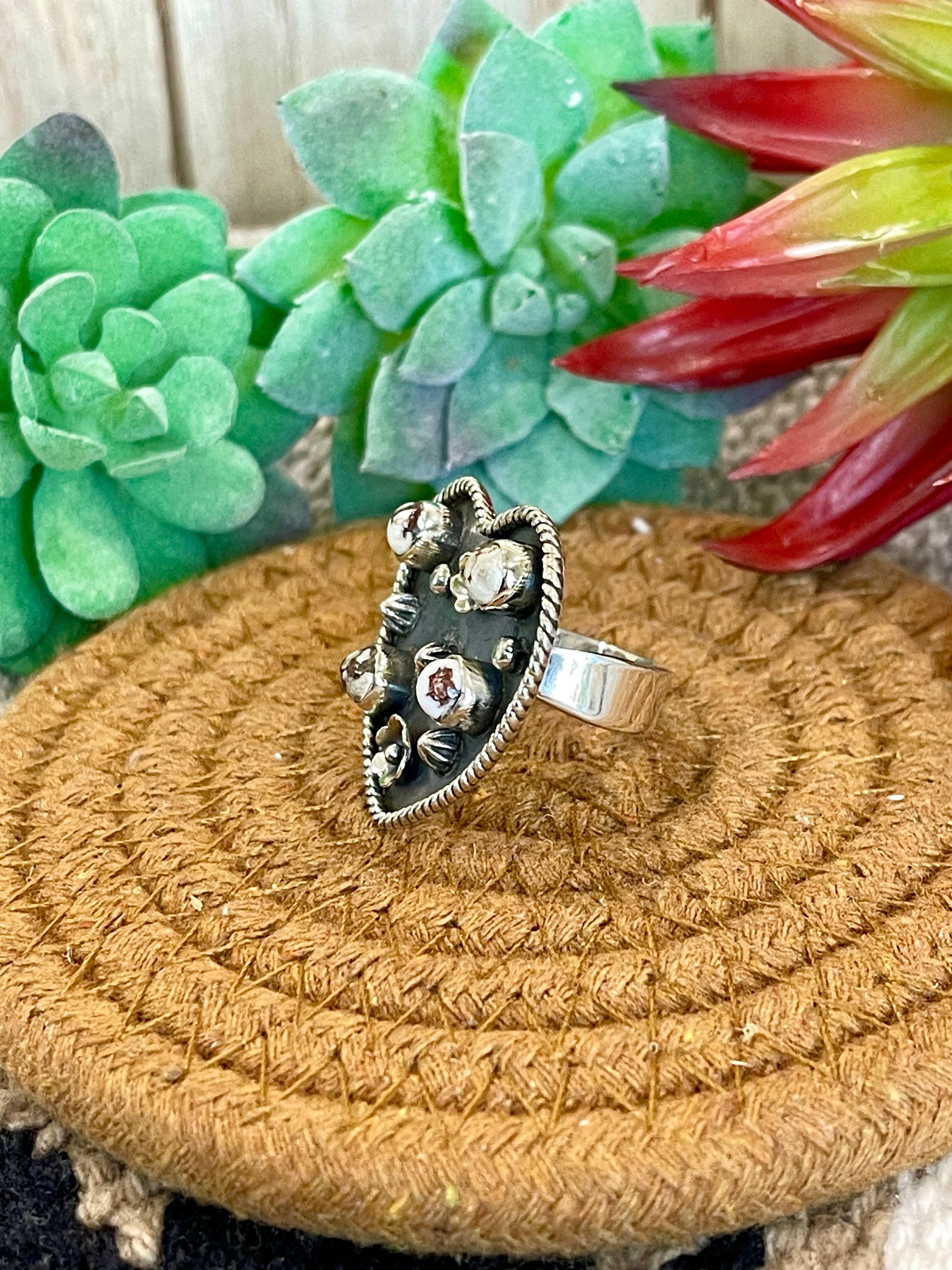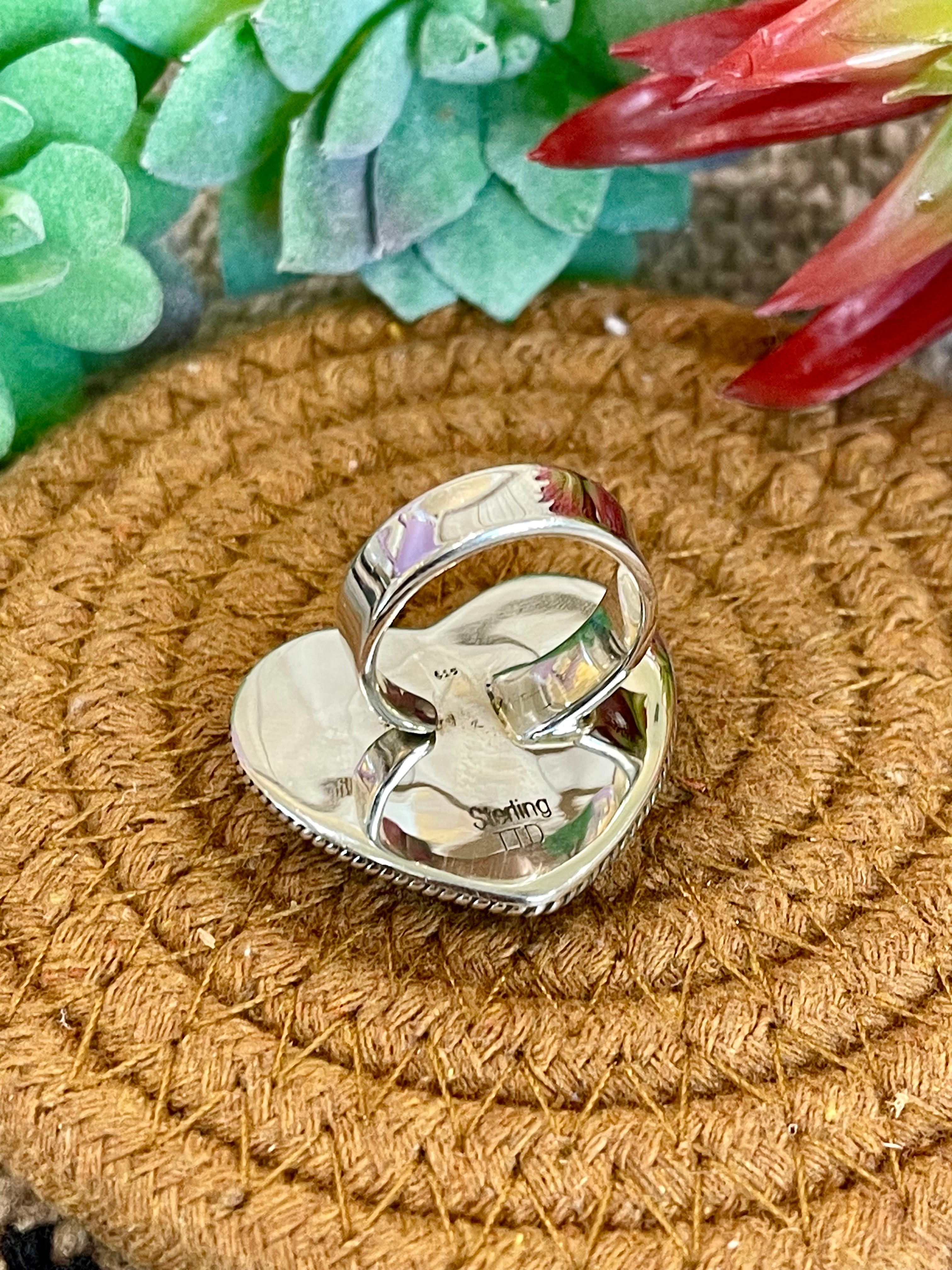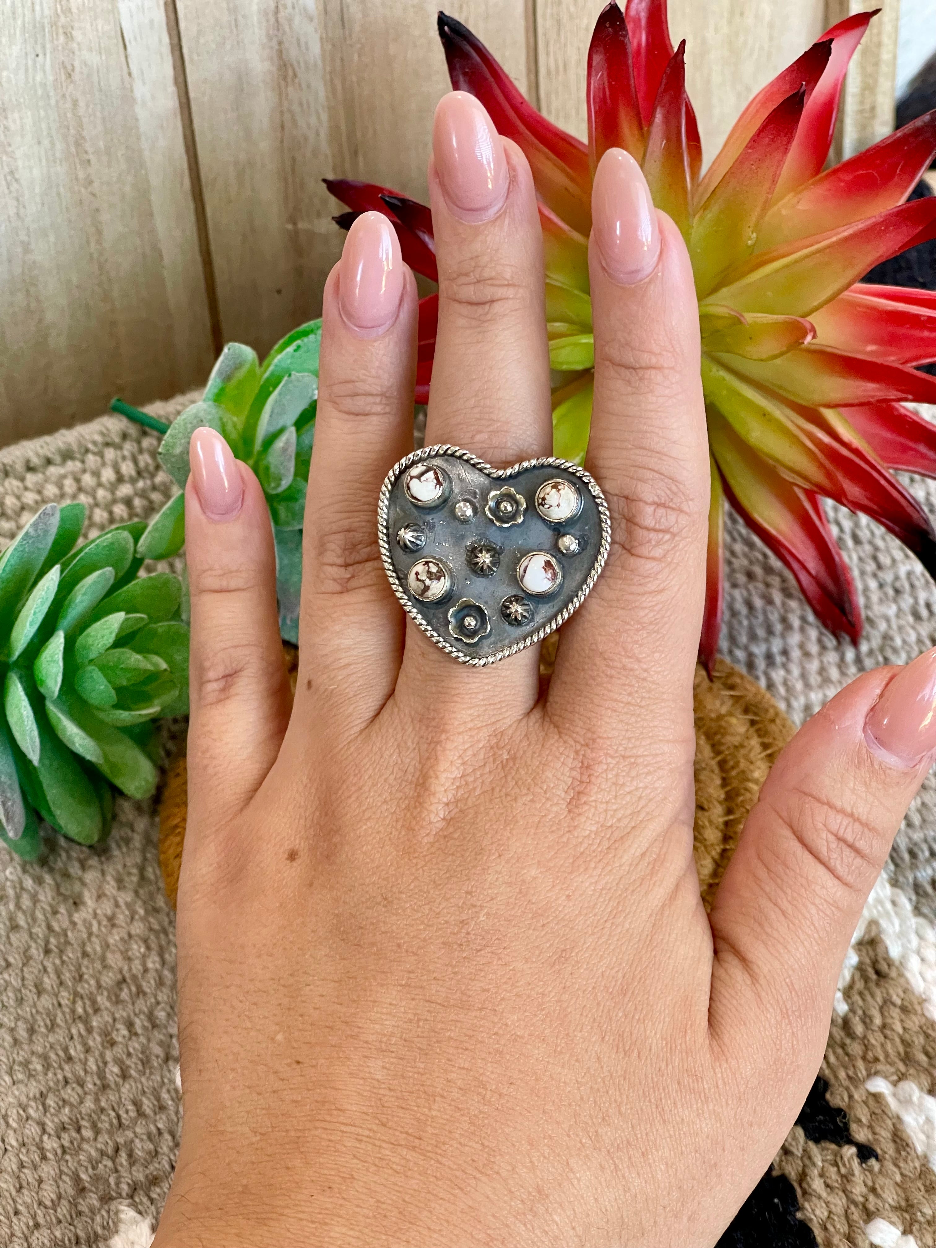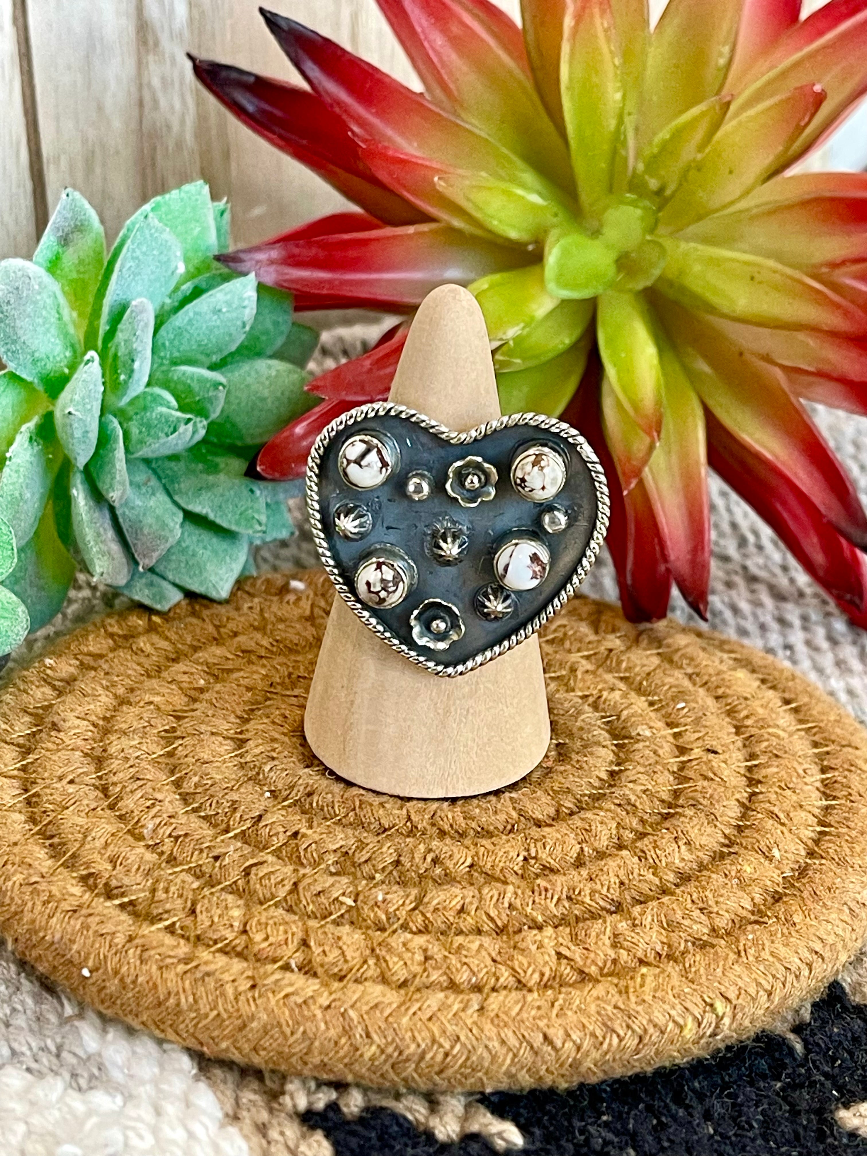 Beautiful heart ring. Southwest Handmade Wild Horse & Sterling Silver Adjustable Heart Ring. It measures 1 1/4 inches long and 1 1/4 inches wide. Signed by the artist and stamped sterling silver.