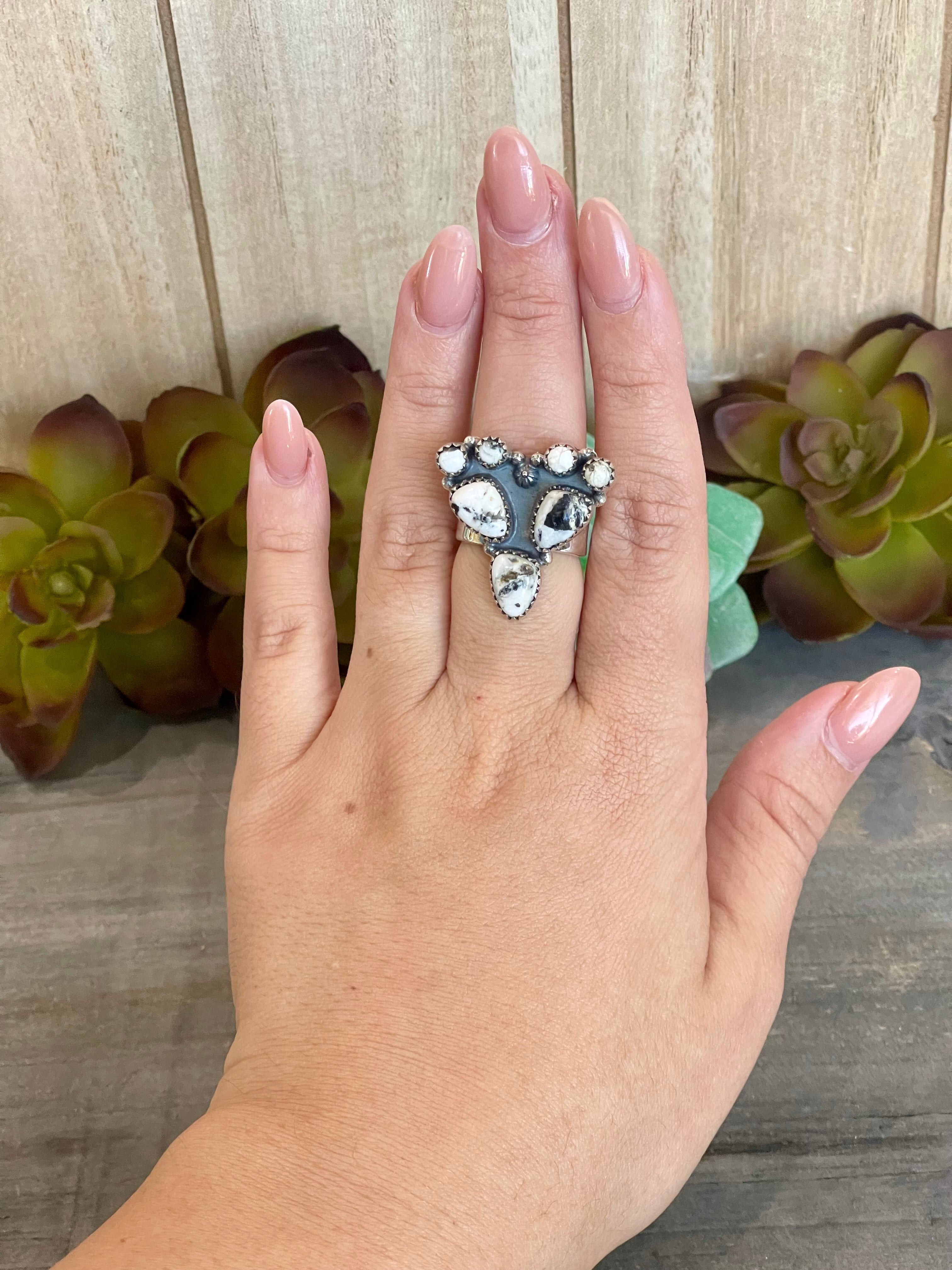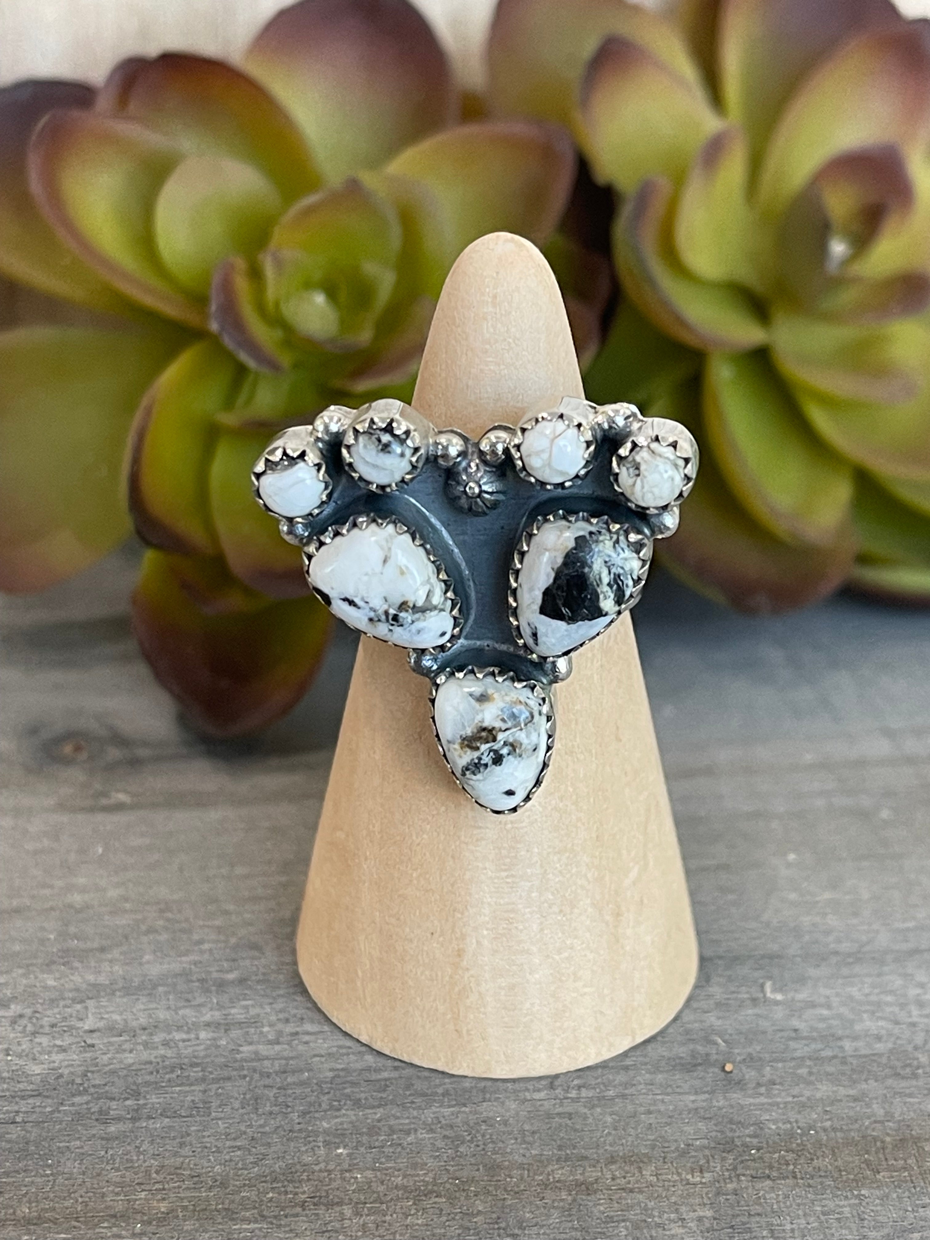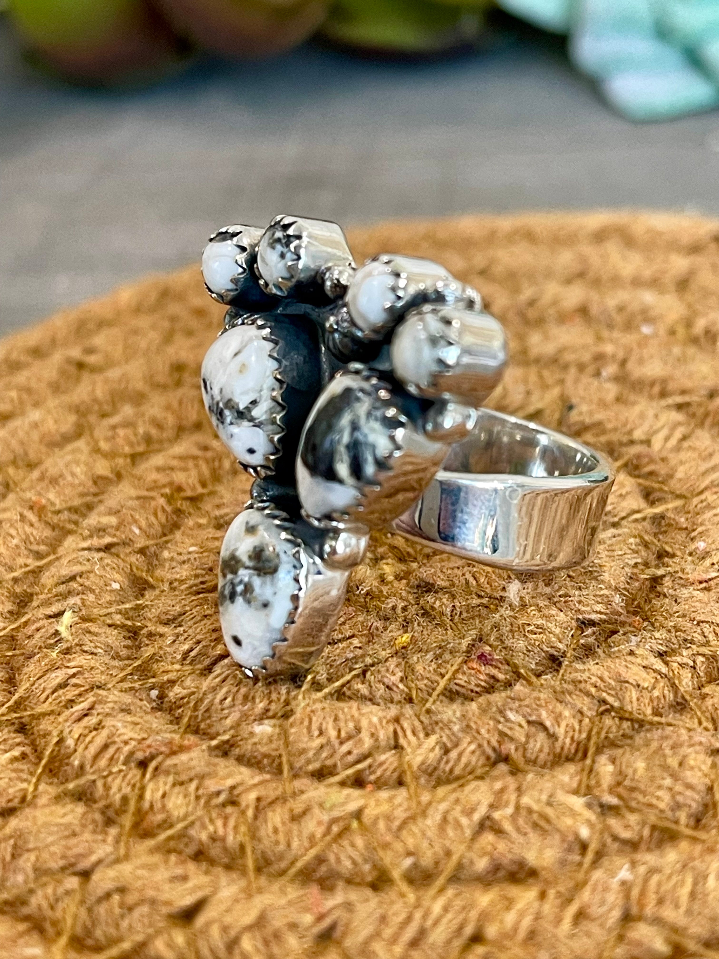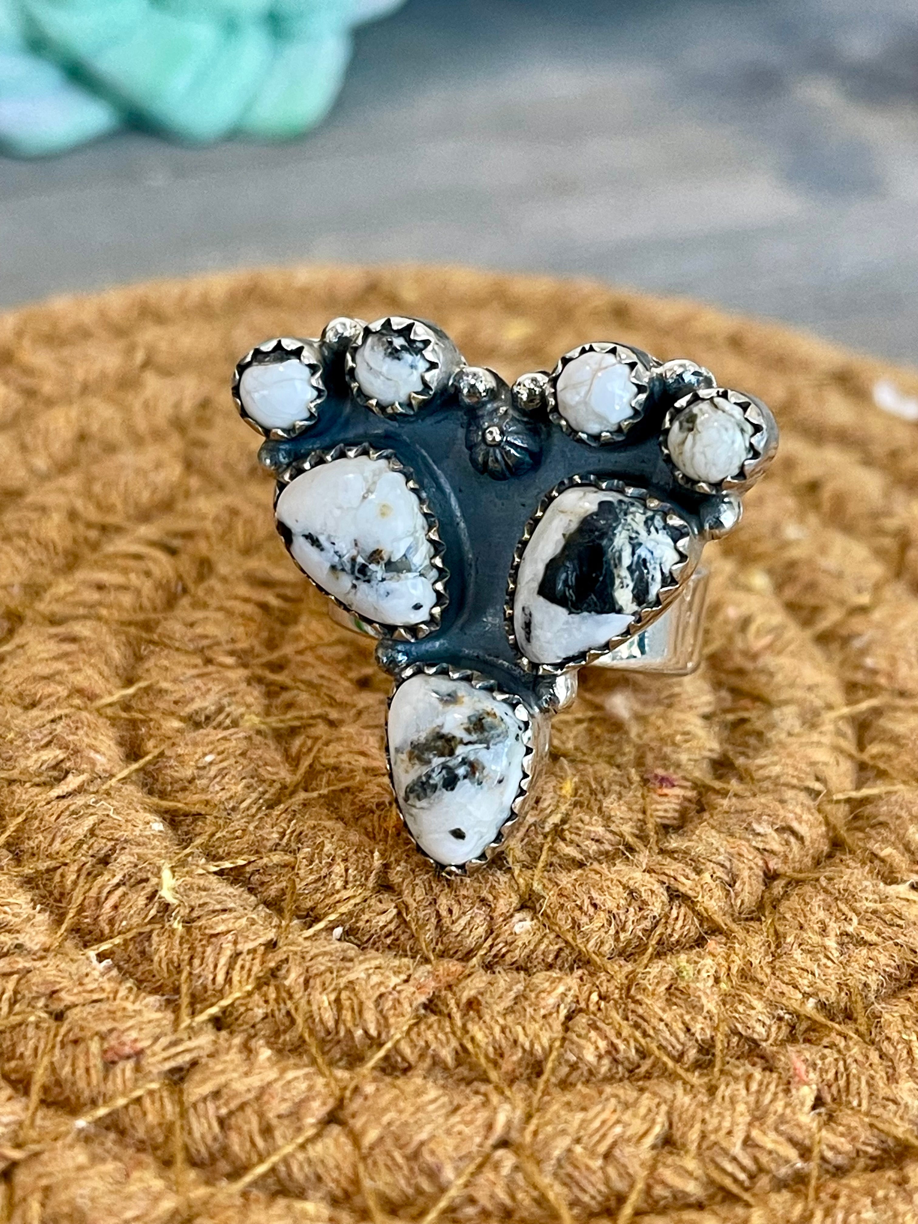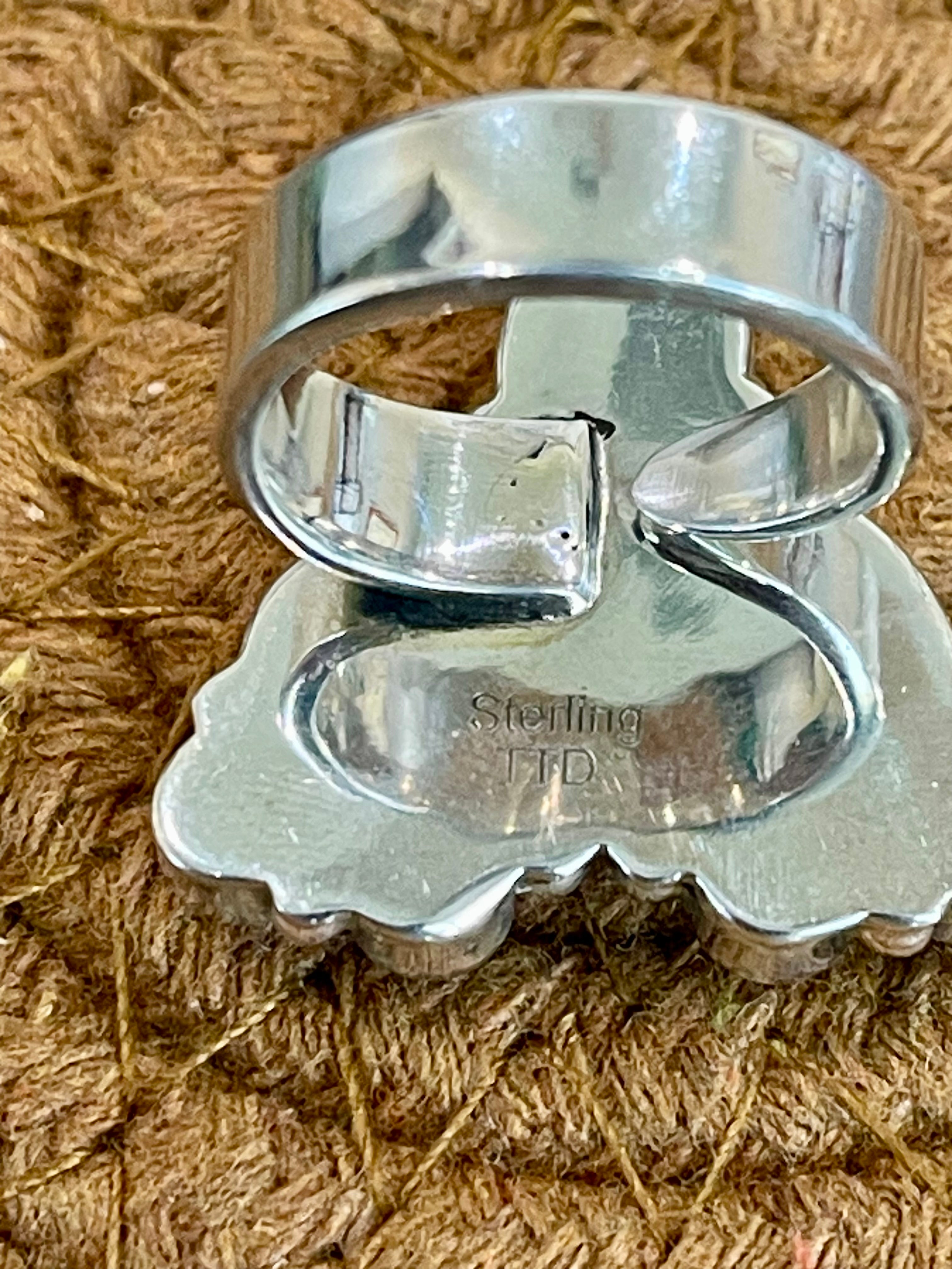Beautiful ring. Southwest Handmade White Buffalo & Sterling Silver Adjustable Ring. It measures 1 1/8 inches long and 1 1/8 inches wide. Signed by the artist and stamped sterling silver.