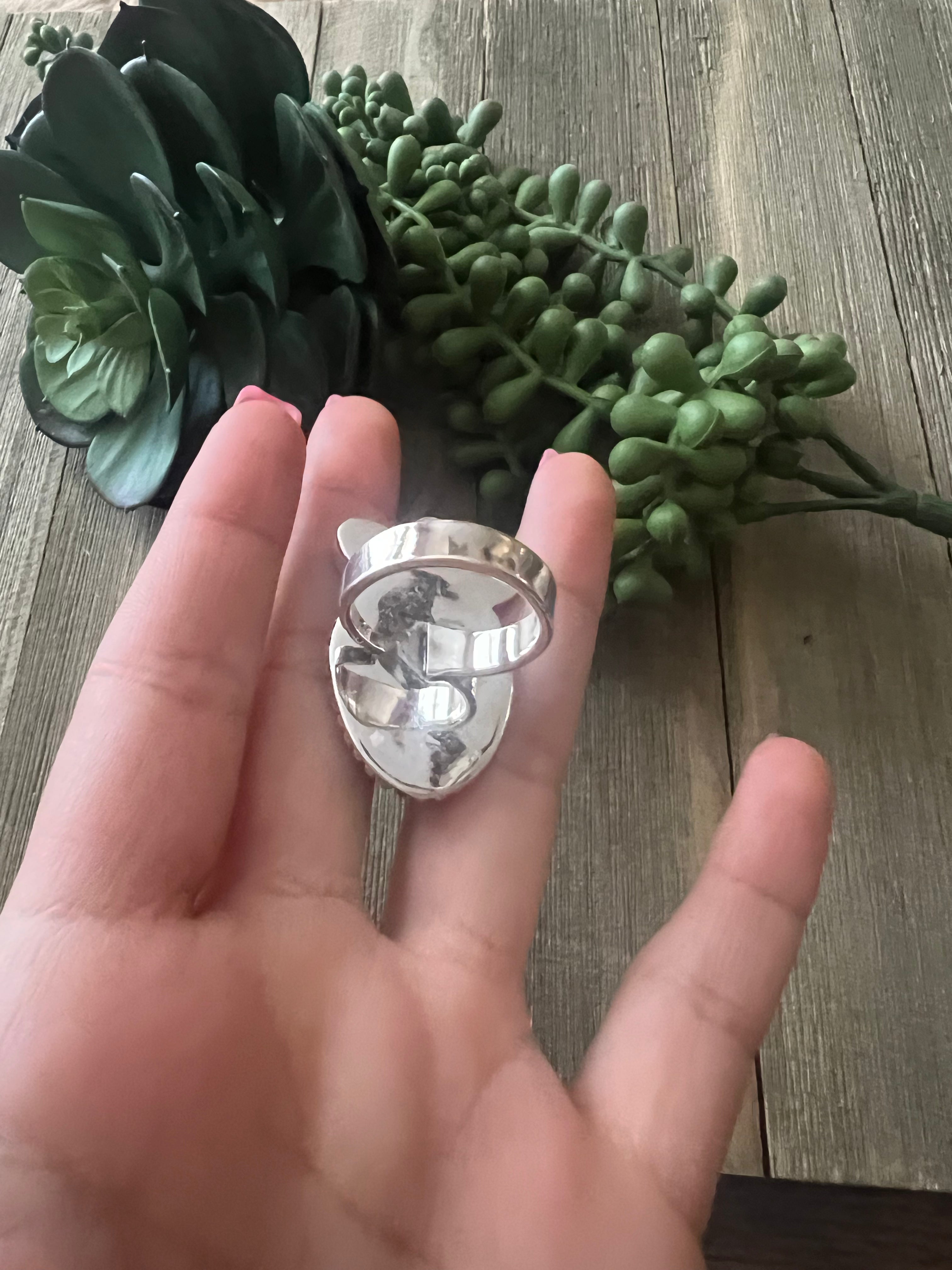 Southwest Kingman Turquoise & Sterling Silver Adjustable Ring. It measures 1 3/8 inches long and just over 7/8 of an inch wide. Stamped sterling silver.