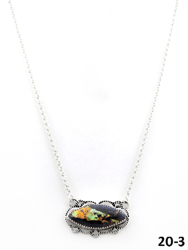 Southwest Made Black Jack Turquoise & Sterling Silver Necklace. It measures 19 inches long with hang while the chain measures 18 inches long, and the stones are 1 2/8 of an inch long, and 1/2 an inch wide. Signed by the artist and stamped sterling silver.