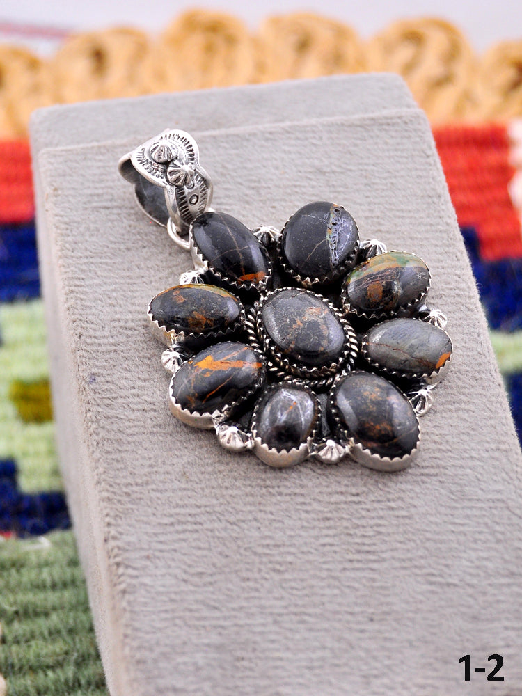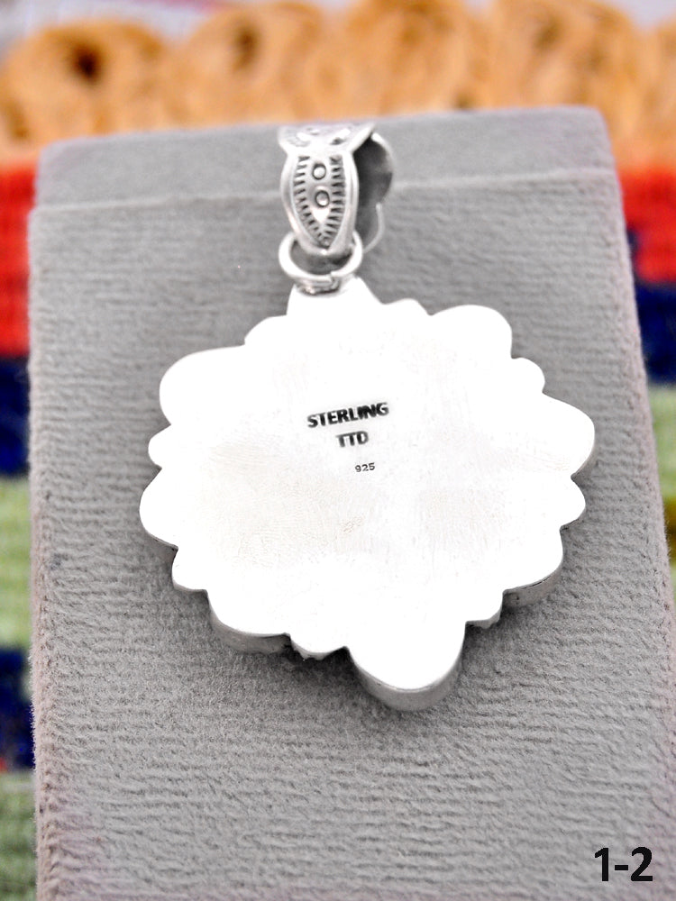 Southwest Black Jack Turquoise & Sterling Silver Pendant. It measures 2 1/2 inches long and 1 3/4 inches wide. Pendant Only. Signed by the artist and stamped sterling silver.