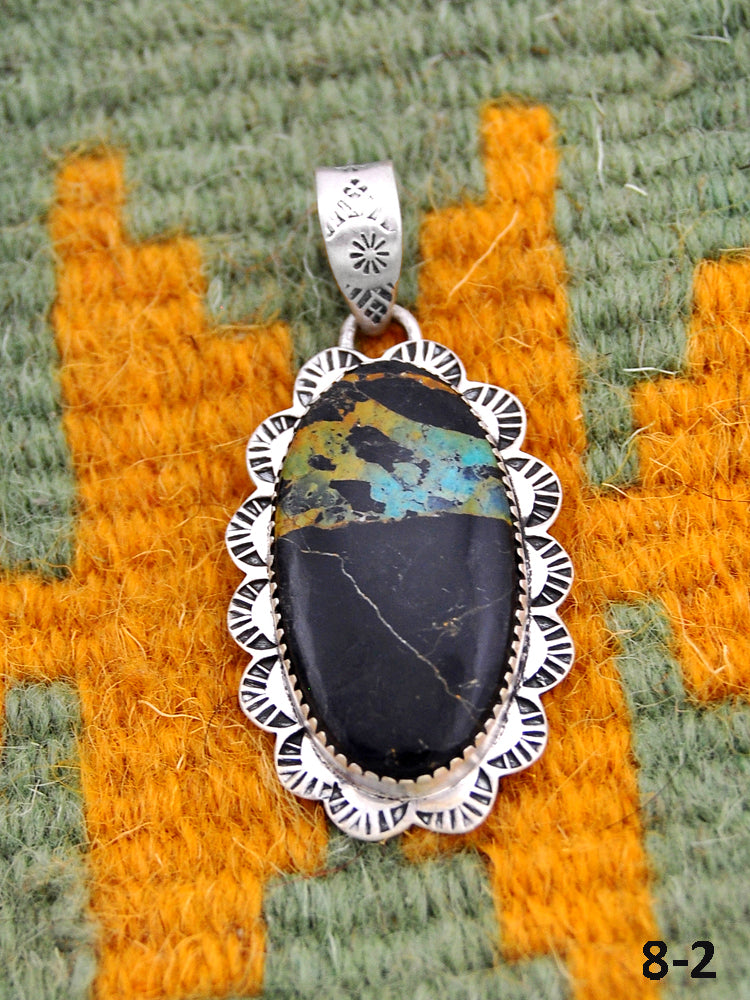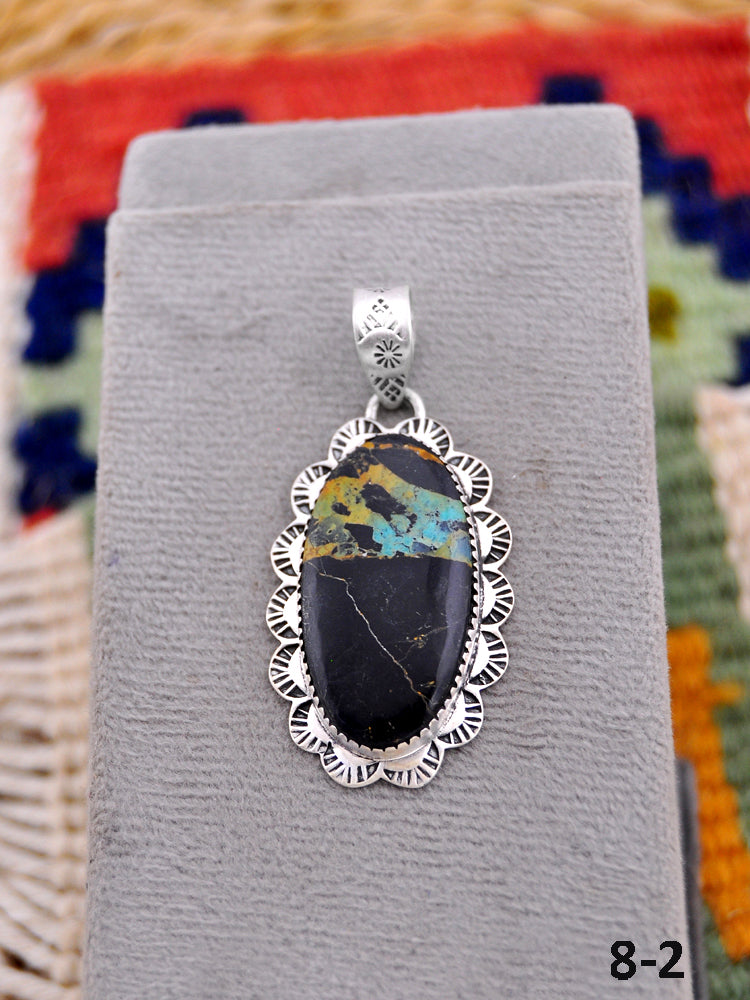 Southwest Black Jack Turquoise & Sterling Silver Pendant. It measures 2 1/8 inches long and 1 inches wide. Pendant Only.