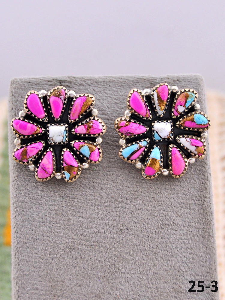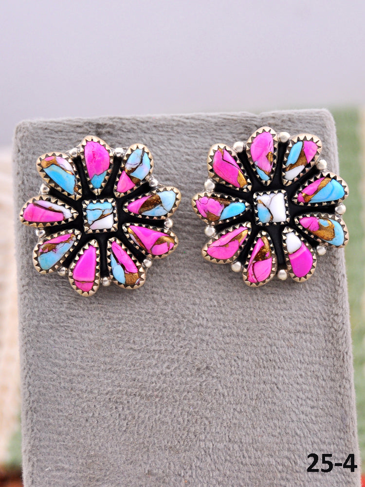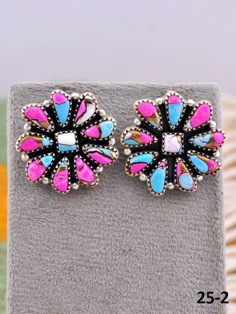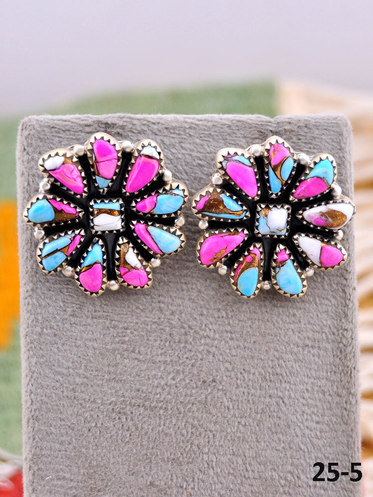 Southwest Made Cotton Candy & Sterling Silver Post Earrings. It measures 1 1/8 inches long and 1 1/8 inches wide. Stamped and signed.