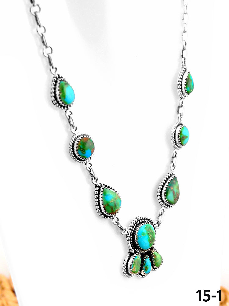 Southwest Made Sonoran Mountain Turquoise & Sterling Silver Necklace. It measures 16 inches long with hang while the chain measures 9 4/8 inches long, and stones are 1/2 of an inch wide. Signed by the artist and stamped sterling silver.