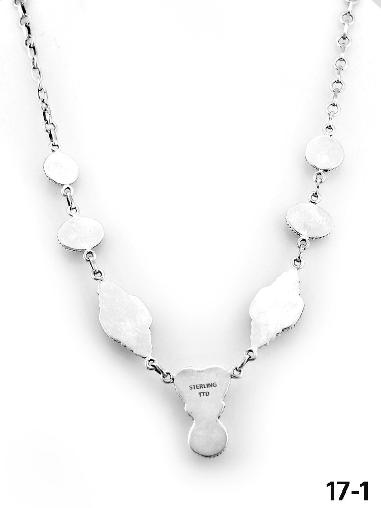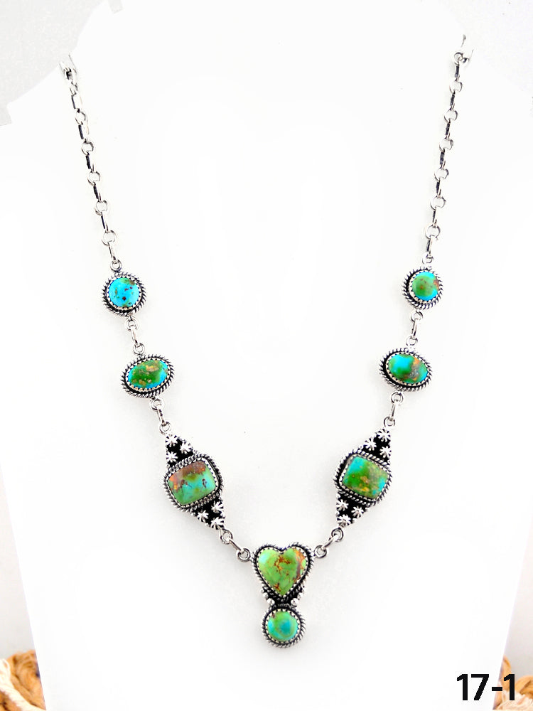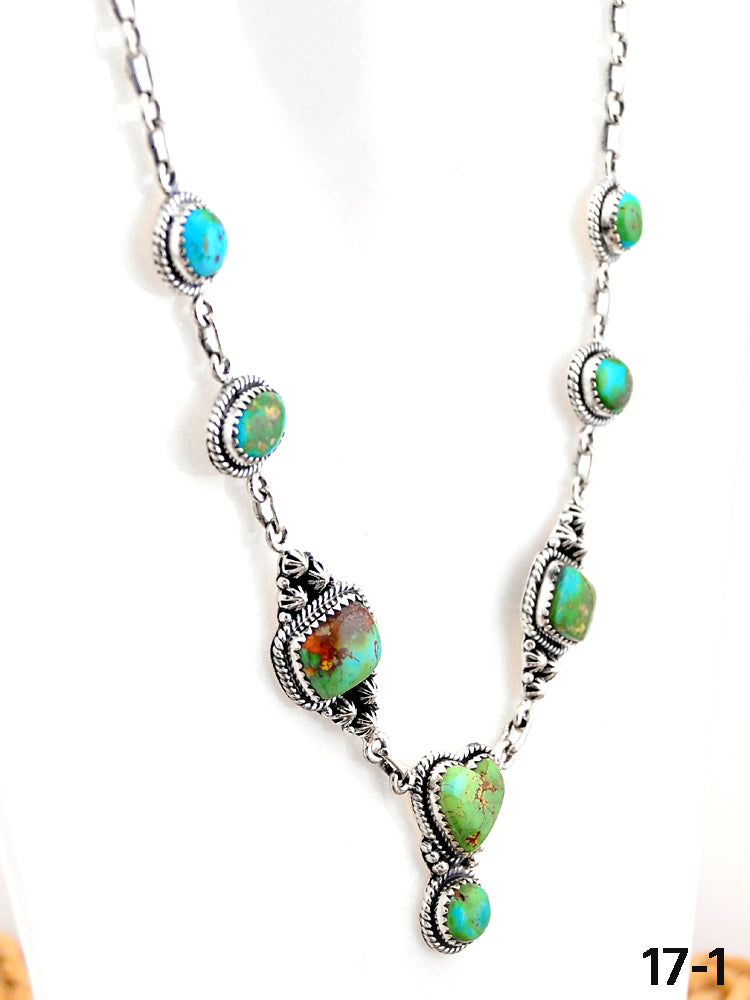Southwest Made Emerald Valley Turquoise & Sterling Silver Necklace. It measures 16 inches long with hang while the chain measures 9 4/8 inches long, and stones vary in size, from 2/8 to 1/2 of an inch wide. Signed by the artist and stamped sterling silver.