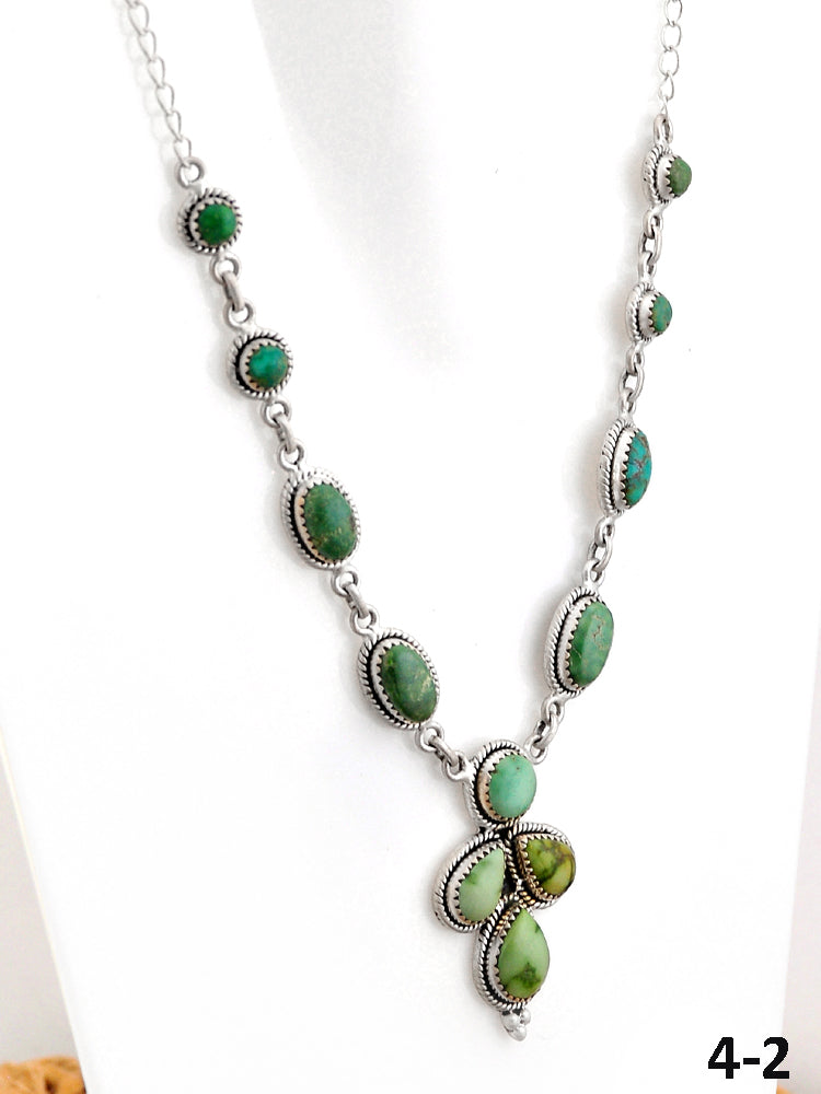 Southwest Made Emerald Valley Turquoise & Sterling Silver Necklace. It measures 19 inches long with hang while the chain measures 12 inches long, and drop is of 1 5/8 inches , and stones vary, up to 1/2 of an inch wide. Signed by the artist and stamped sterling silver.