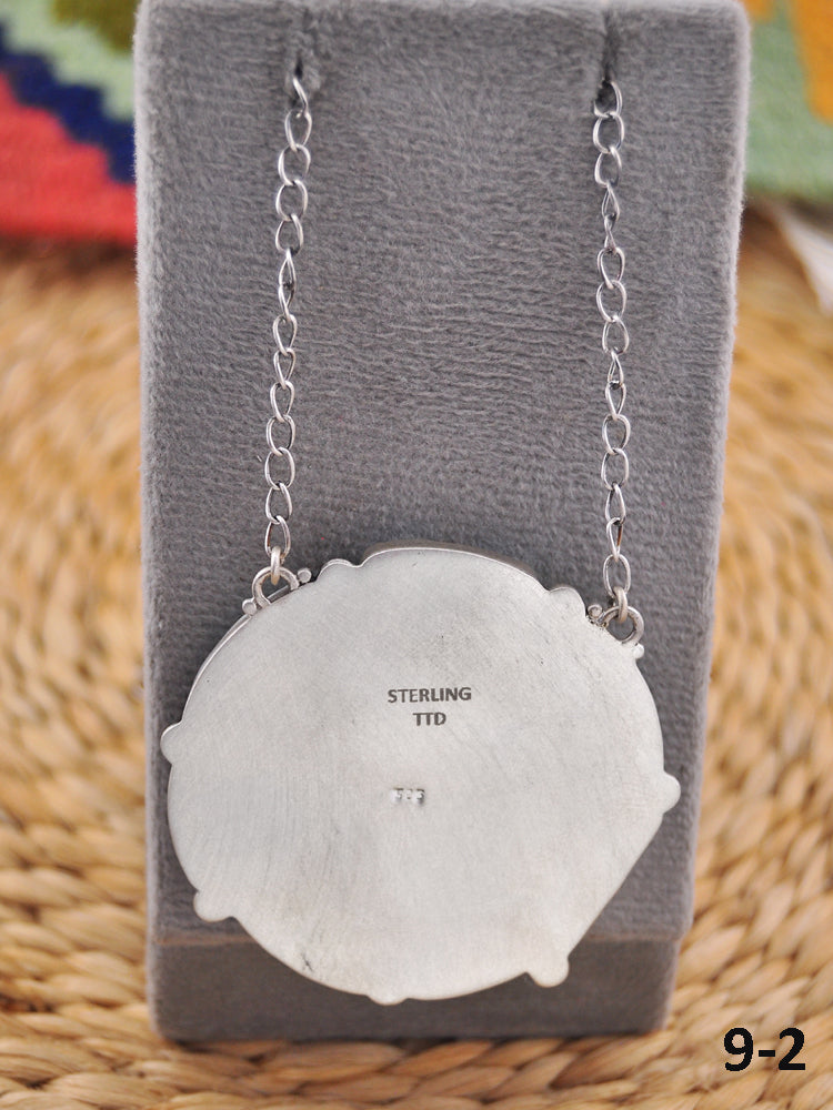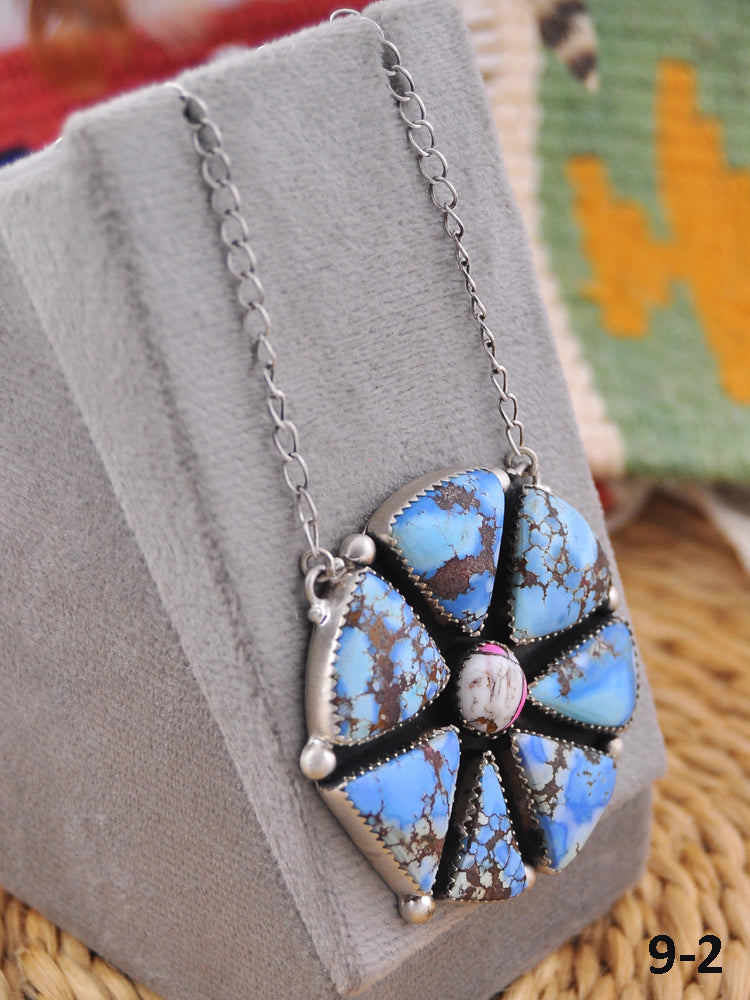 This stunning Golden Hills cluster necklace features a vibrant collection of natural stones set in sterling silver, showcasing exceptional Southwest craftsmanship. It measures 20 long with a hang while the chain by itself measures 18 inches long. Width of the pendants is 2 inches.