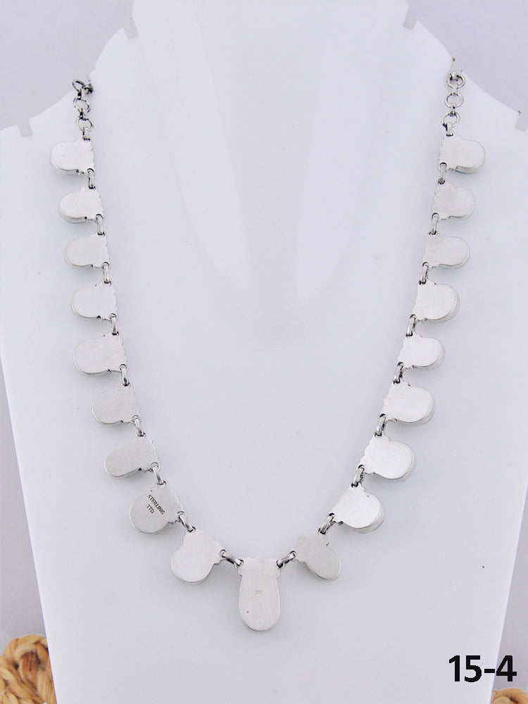 This stunning necklace features a vibrant collection of natural stones set in sterling silver, showcasing exceptional Southwest craftsmanship. It measures 21 1/2 inches from end to end. Just under 22 inches long with drop.