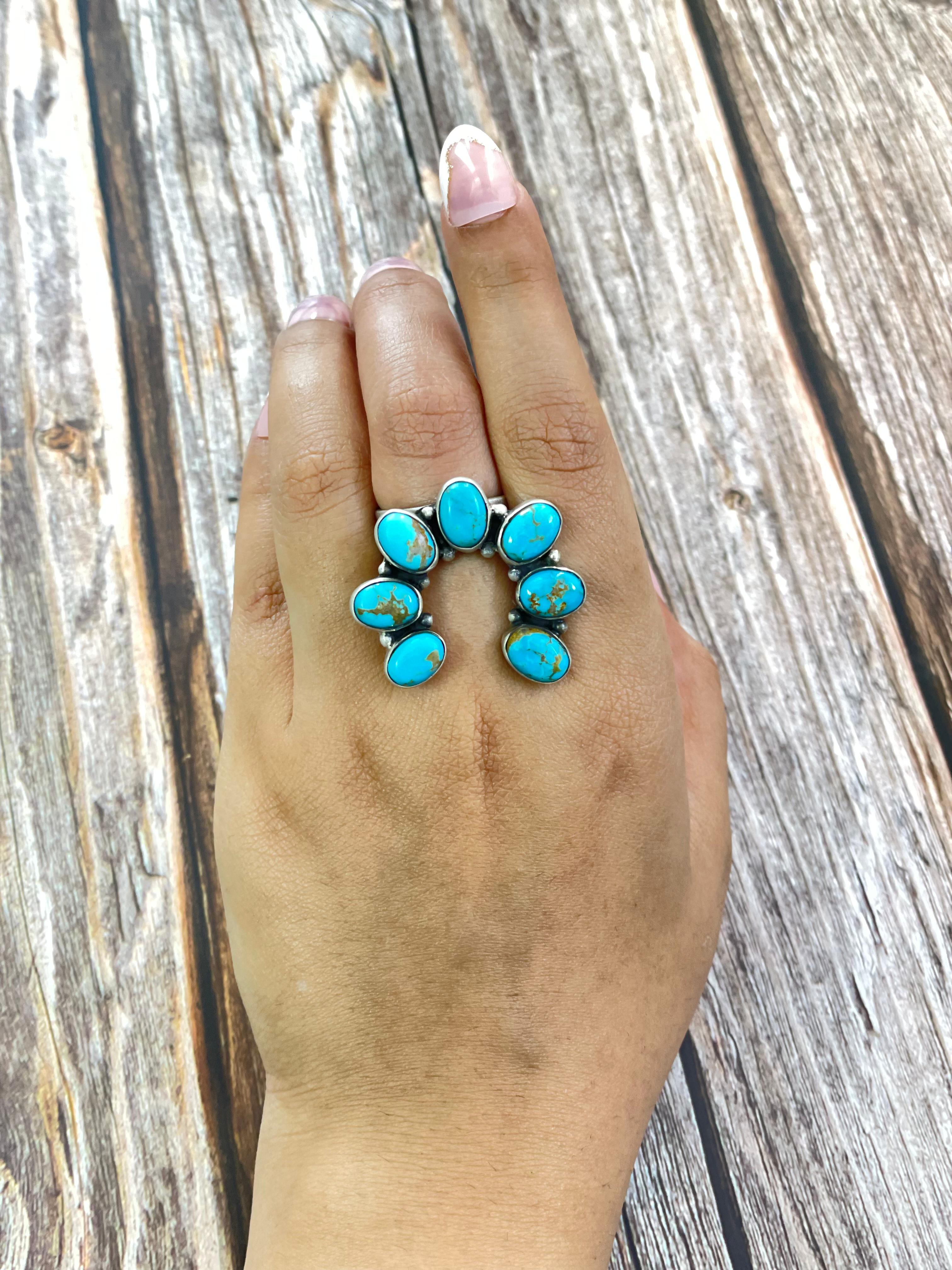 Southwest Made Kingman Turquoise & Sterling Sliver Adjustable Ring. It measures just over 1 1/4 inches long and just over 1 3/8 inches wide.