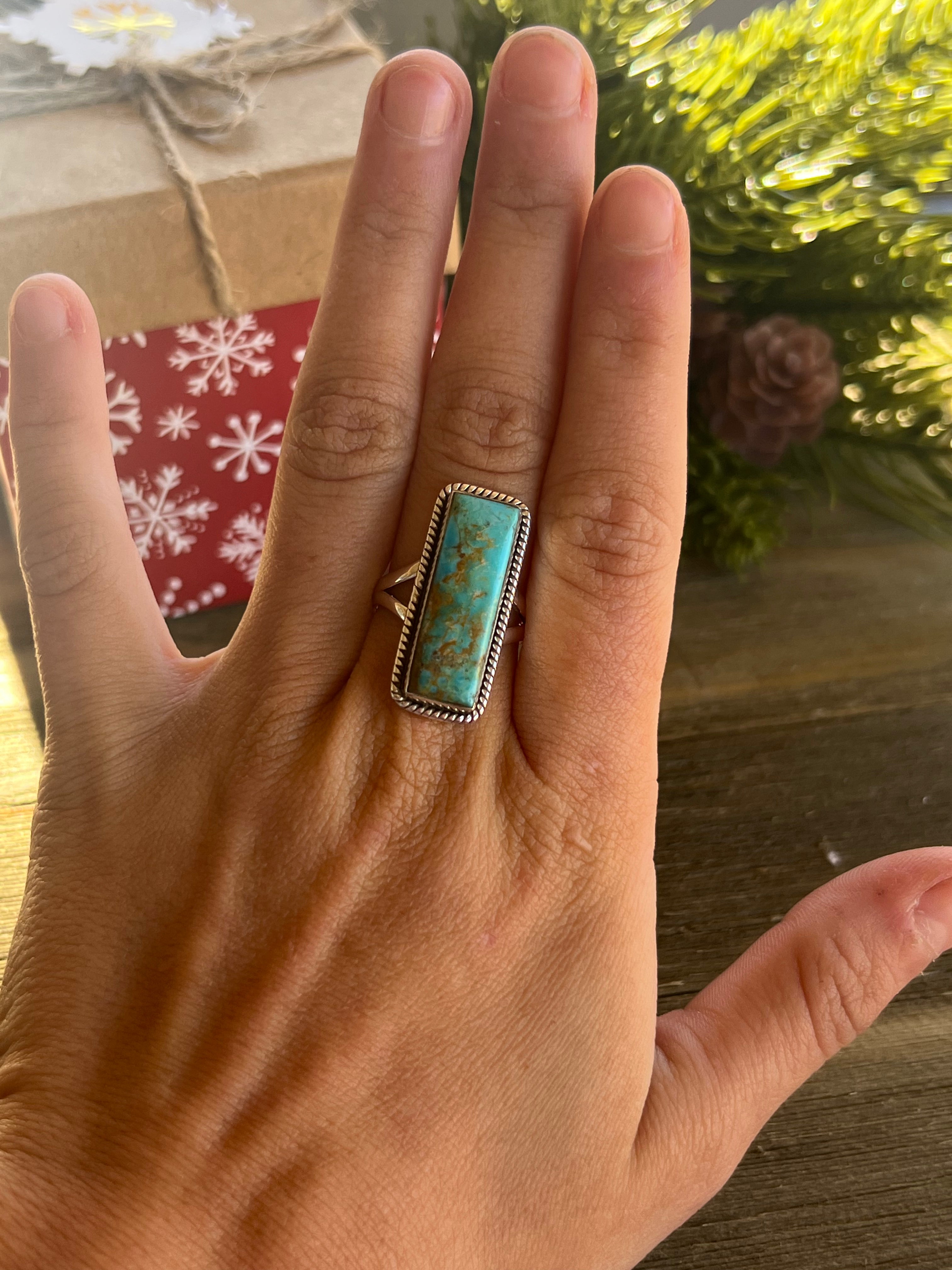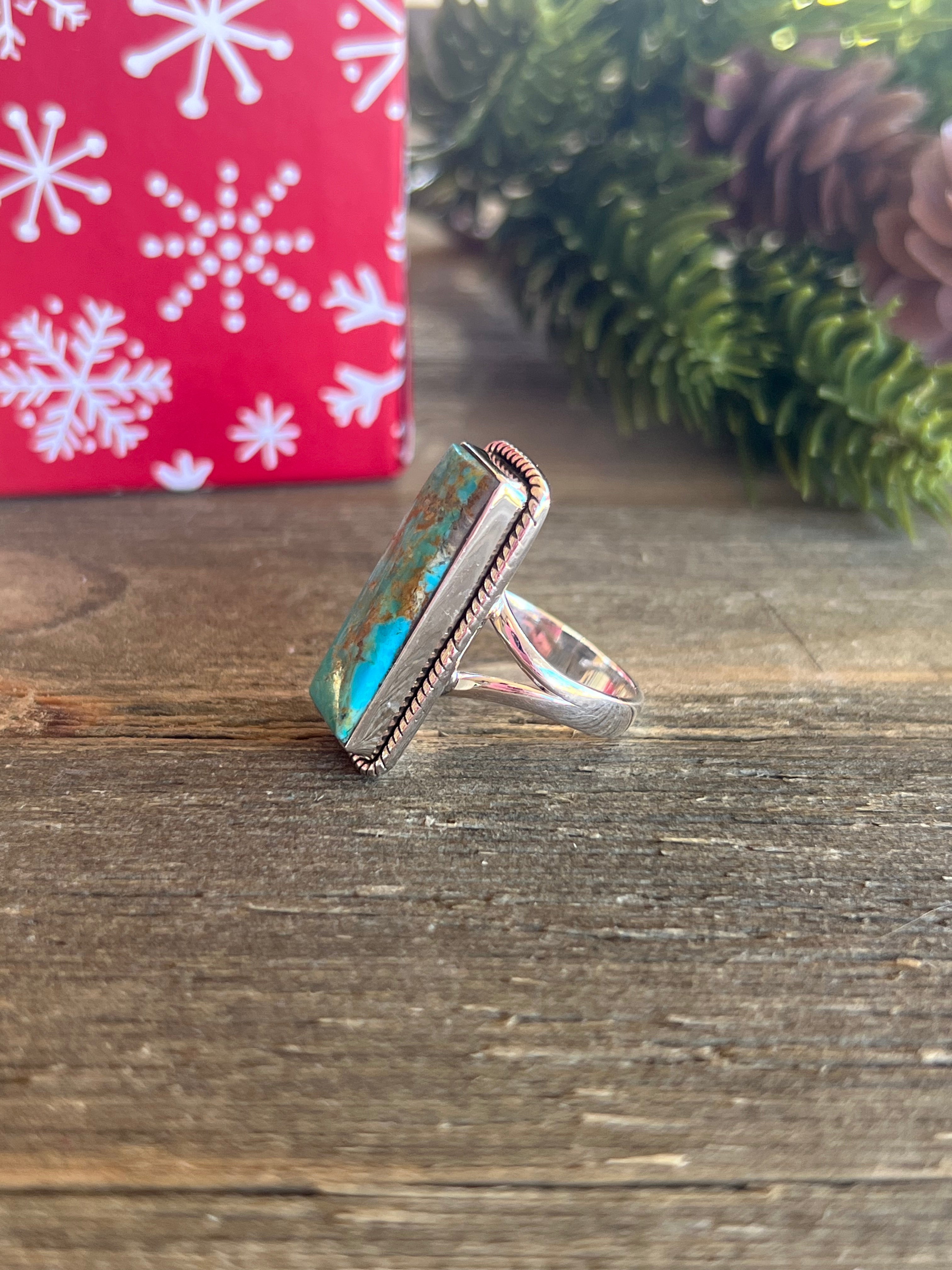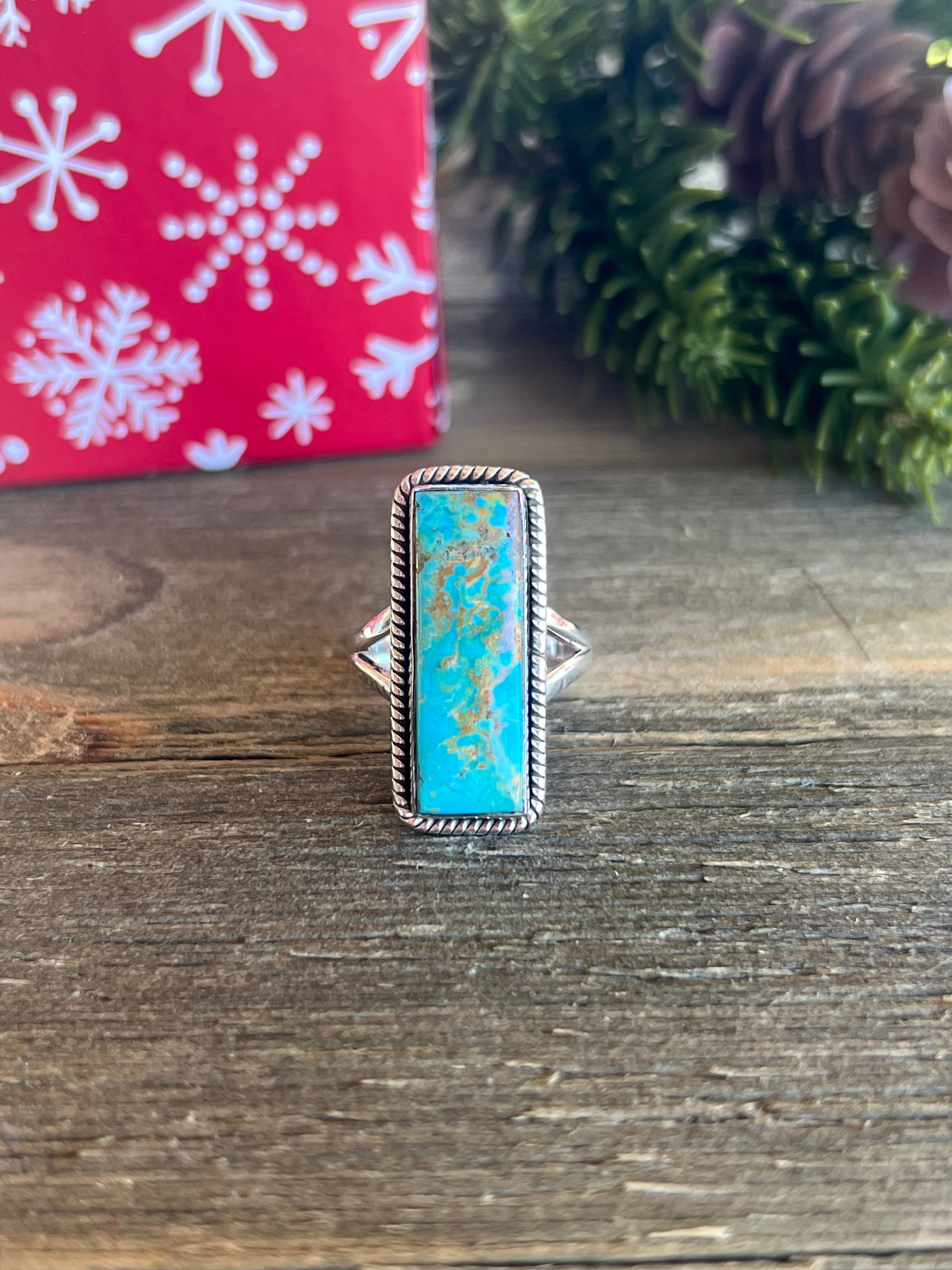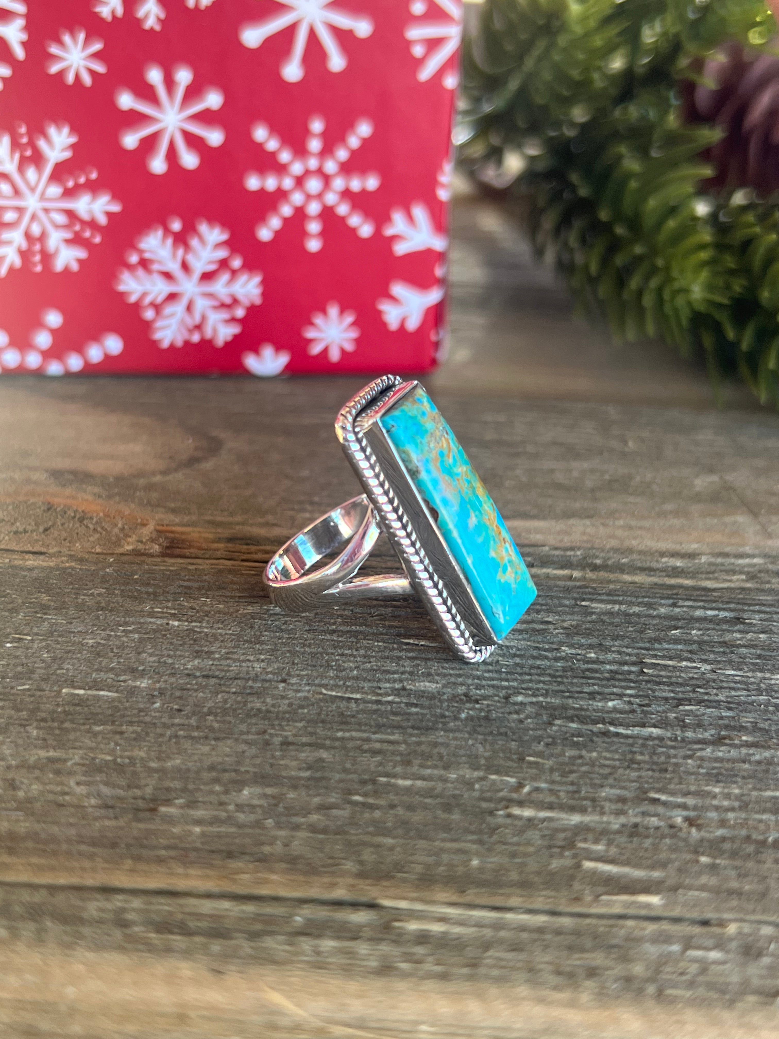 Southwest Made Mohave Kingman Turquoise & Sterling Silver Ring Size 7.5. It measures over 1 inch long and just under 1/2 of an inch wide.