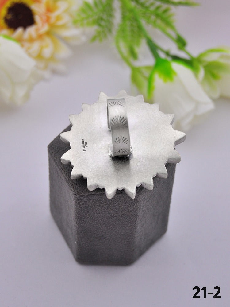 Southwest Made Multi Stone & Sterling Sliver Cluster Adjustable Ring. It measures 2 inches long and 2 inches wide. Signed by the artist and stamped sterling silver.